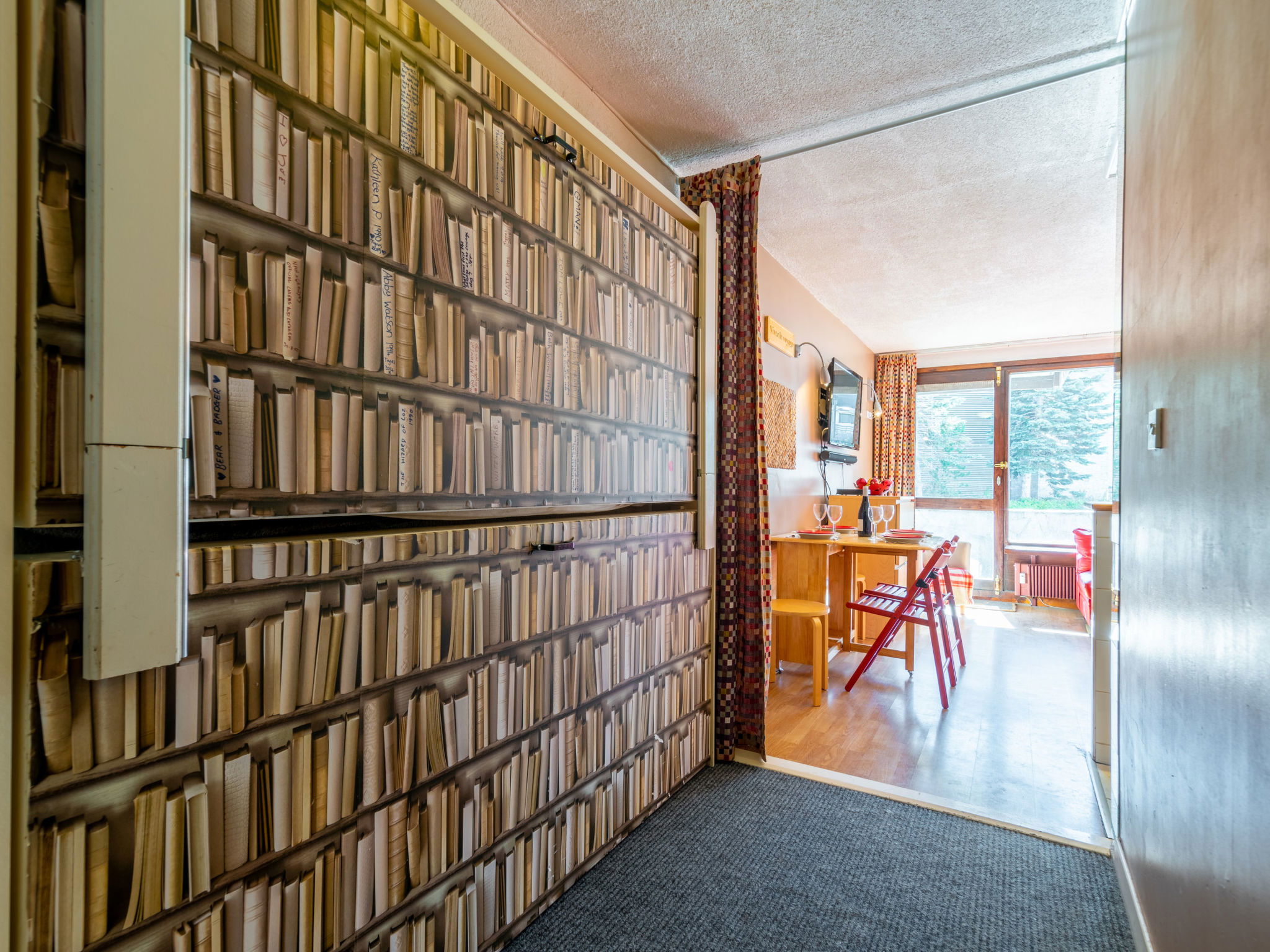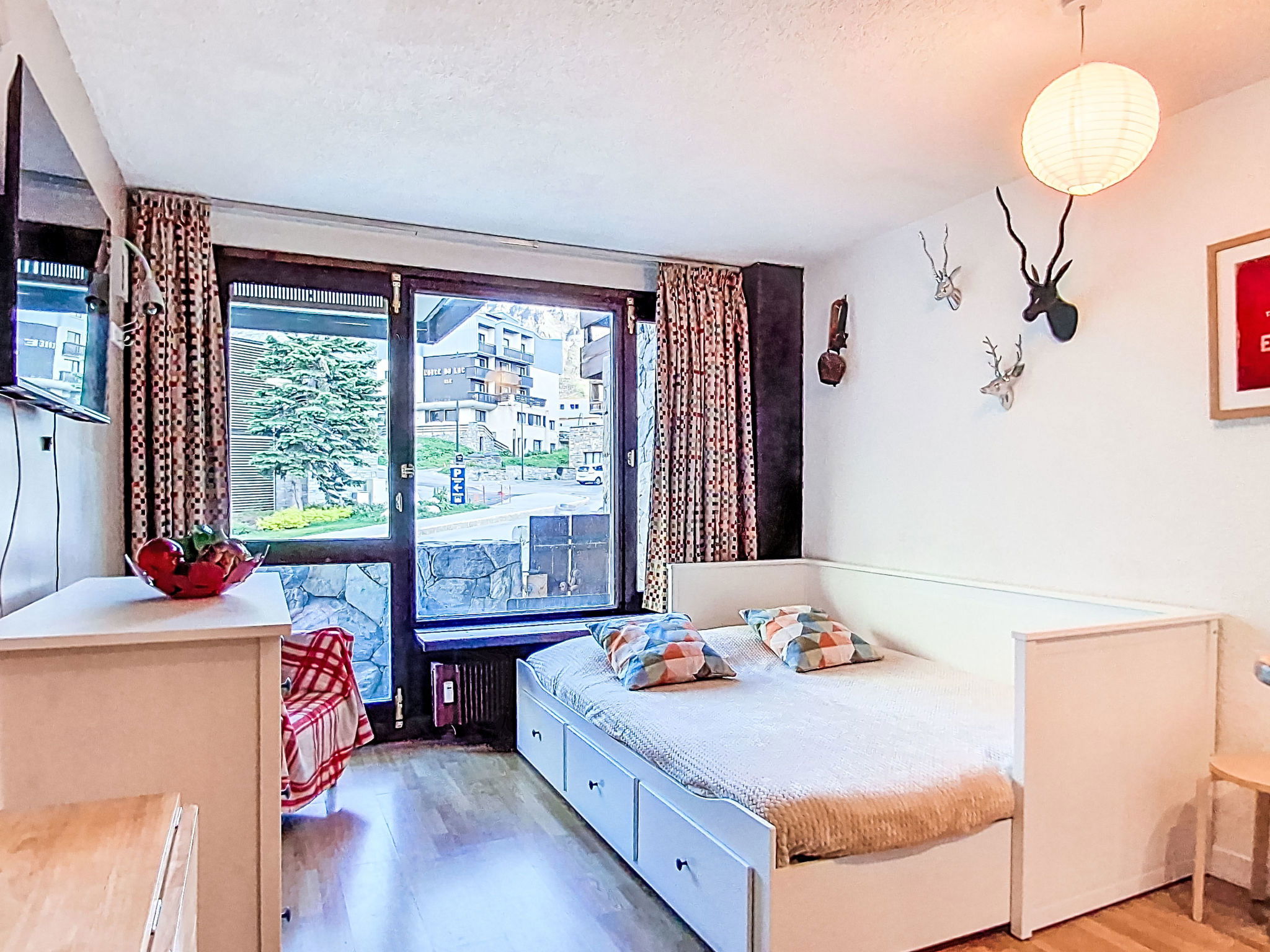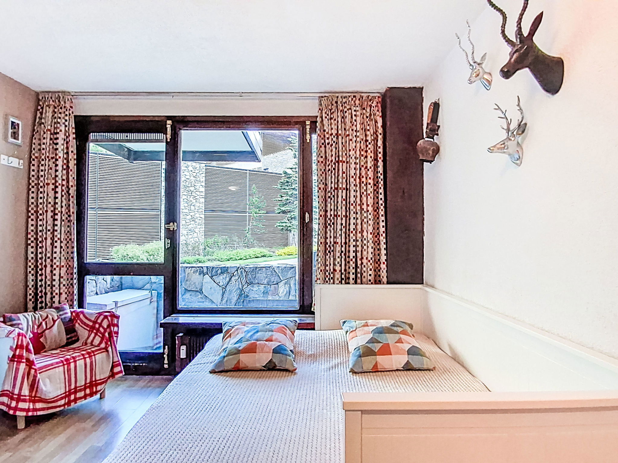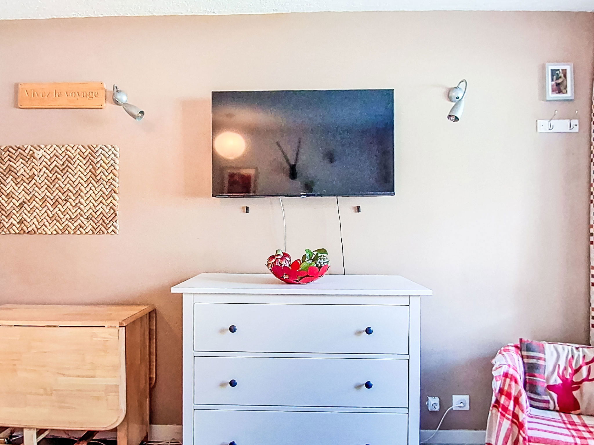 1-room studio 24 m2, on the ground floor. Living/dining room with 1 sofabed (140 cm, length 190 cm), TV (flat screen). Exit to the balcony. Entrance hall with 2 wall-trunk beds (80 cm, length 190 cm). Kitchenette (4 hot plates, mini-oven, oven, toaster, kettle, microwave, electric coffee machine). Bath/WC. Small balcony, east facing position. View of the mountains and the countryside. Facilities: washing machine. Please note: non-smokers only. Smoke alarm. Offer by a private individual according to Art. 155, IV of CGI.