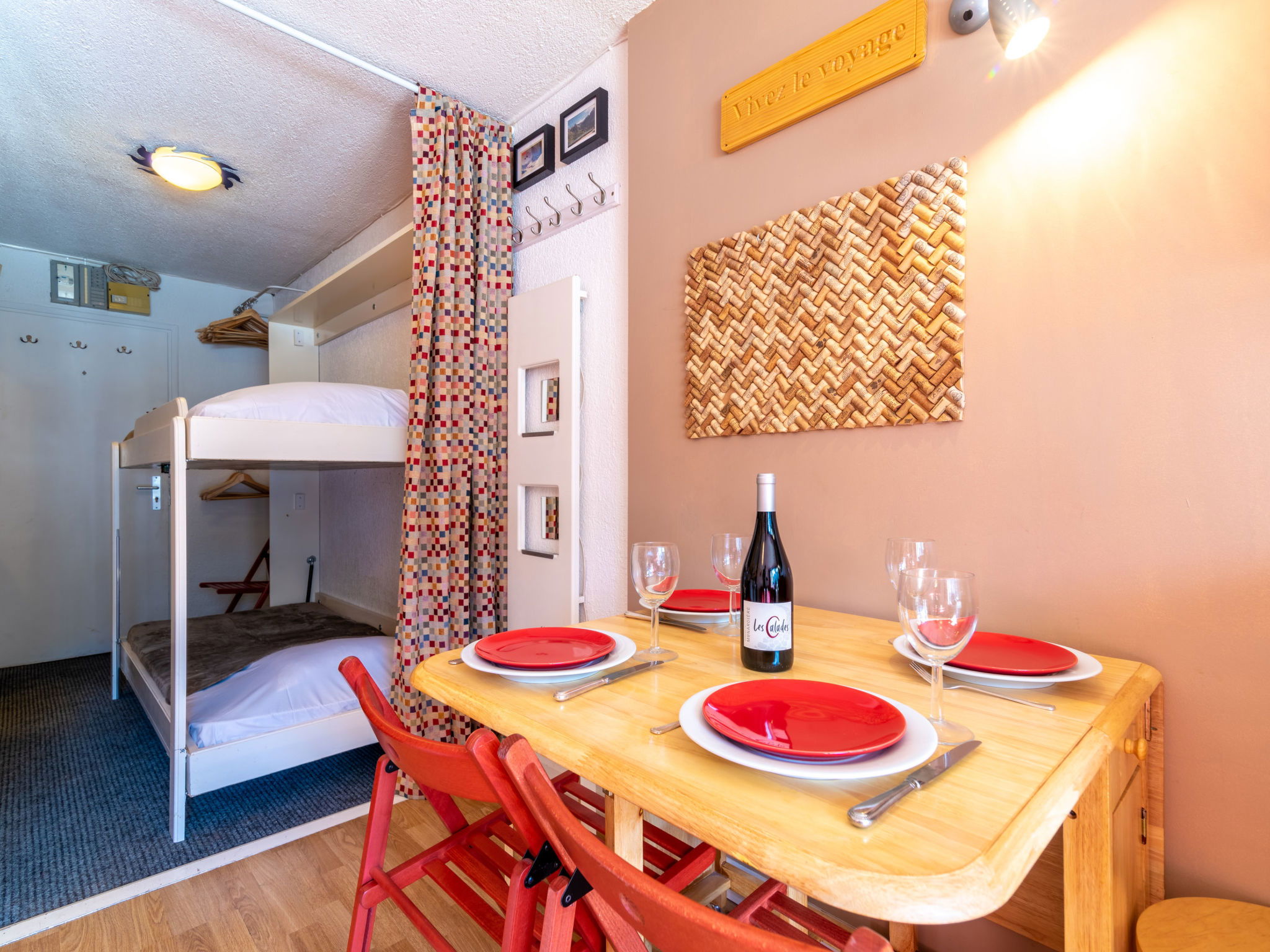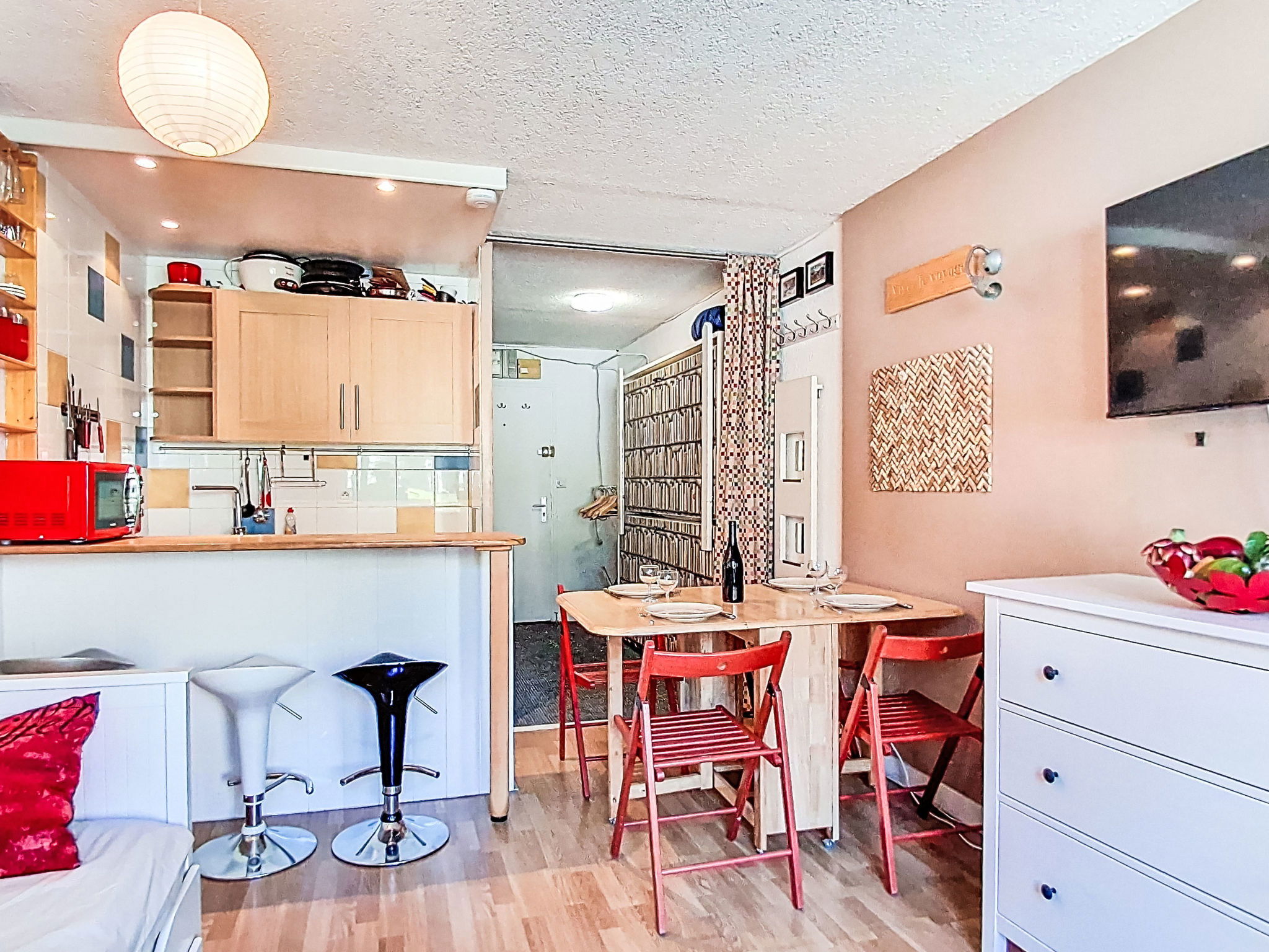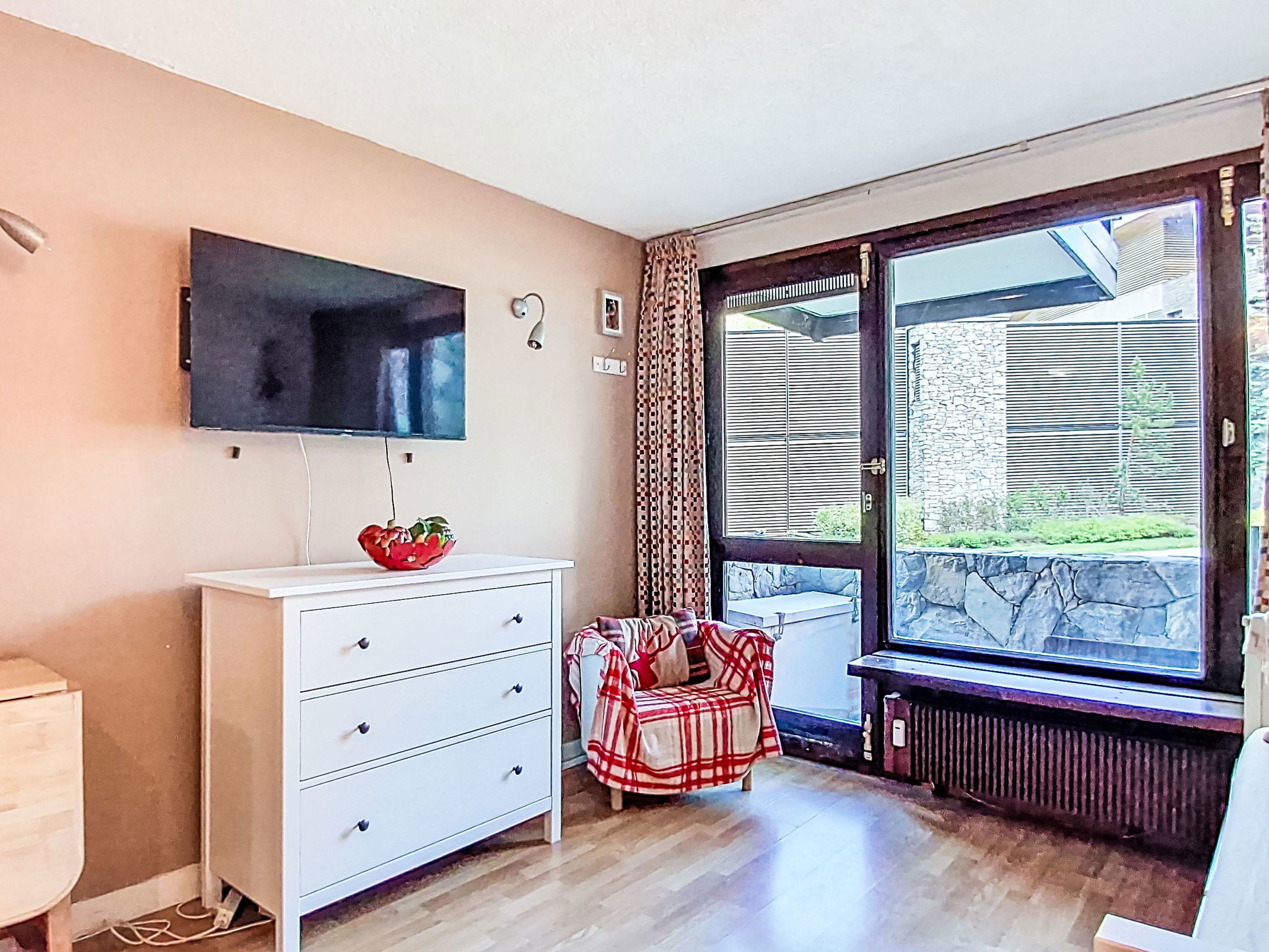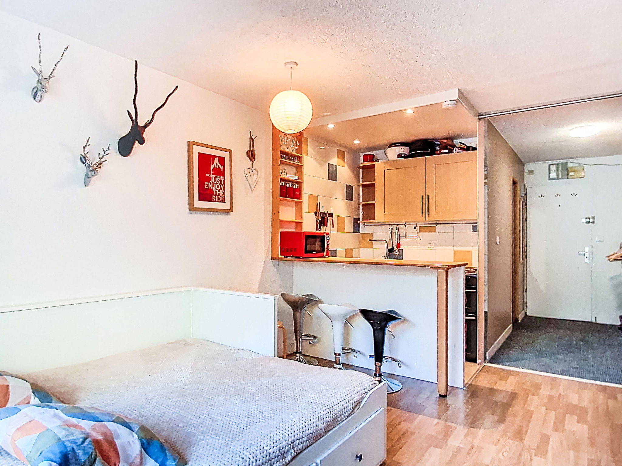 1-room studio 24 m2, on the ground floor. Living/dining room with 1 sofabed (140 cm, length 190 cm), TV (flat screen). Exit to the balcony. Entrance hall with 2 wall-trunk beds (80 cm, length 190 cm). Kitchenette (4 hot plates, mini-oven, oven, toaster, kettle, microwave, electric coffee machine). Bath/WC. Small balcony, east facing position. View of the mountains and the countryside. Facilities: washing machine. Please note: non-smokers only. Smoke alarm. Offer by a private individual according to Art. 155, IV of CGI.
