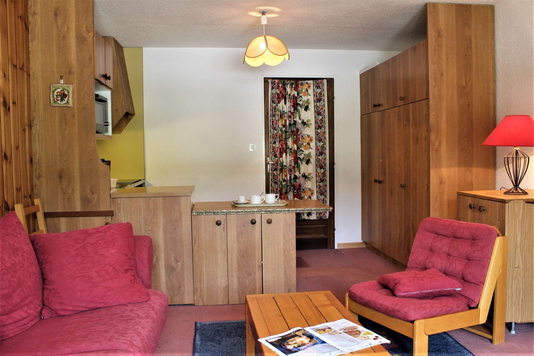 Located at the foot of the slopes, this apartment for 6 people is organized around a bedroom with two twin beds (80x190) which overlooks the slopes. There are also two sleeping areas in the hallway/entrance: one with a bunk bed (2 single beds 80x190) and a wooden accordion curtain which can be closed, the other with a second bunk bed (2 single beds (80x190) and a separation door with the living room. There is one last bed left for 2 people in the living room on the BZ sofa.