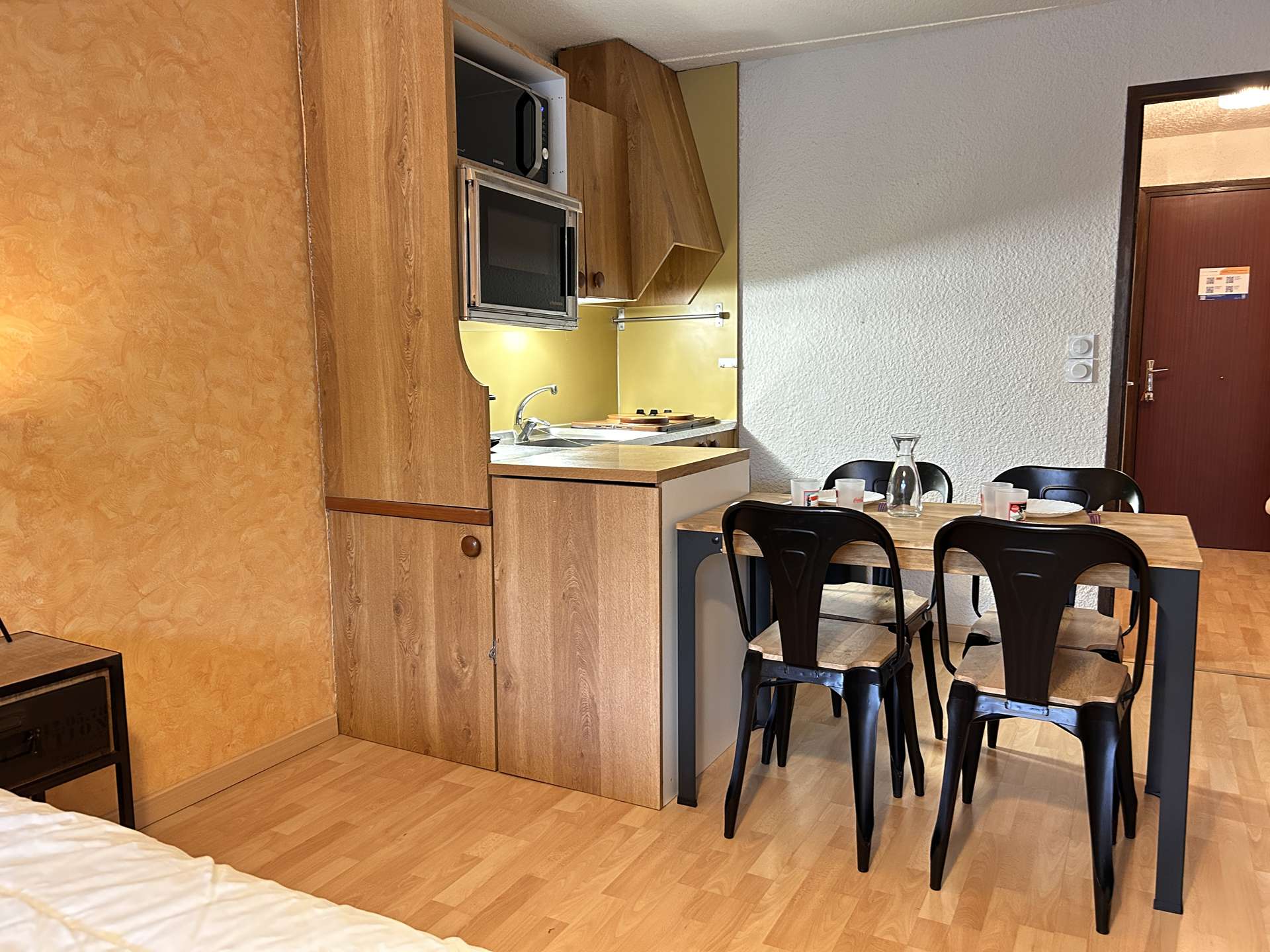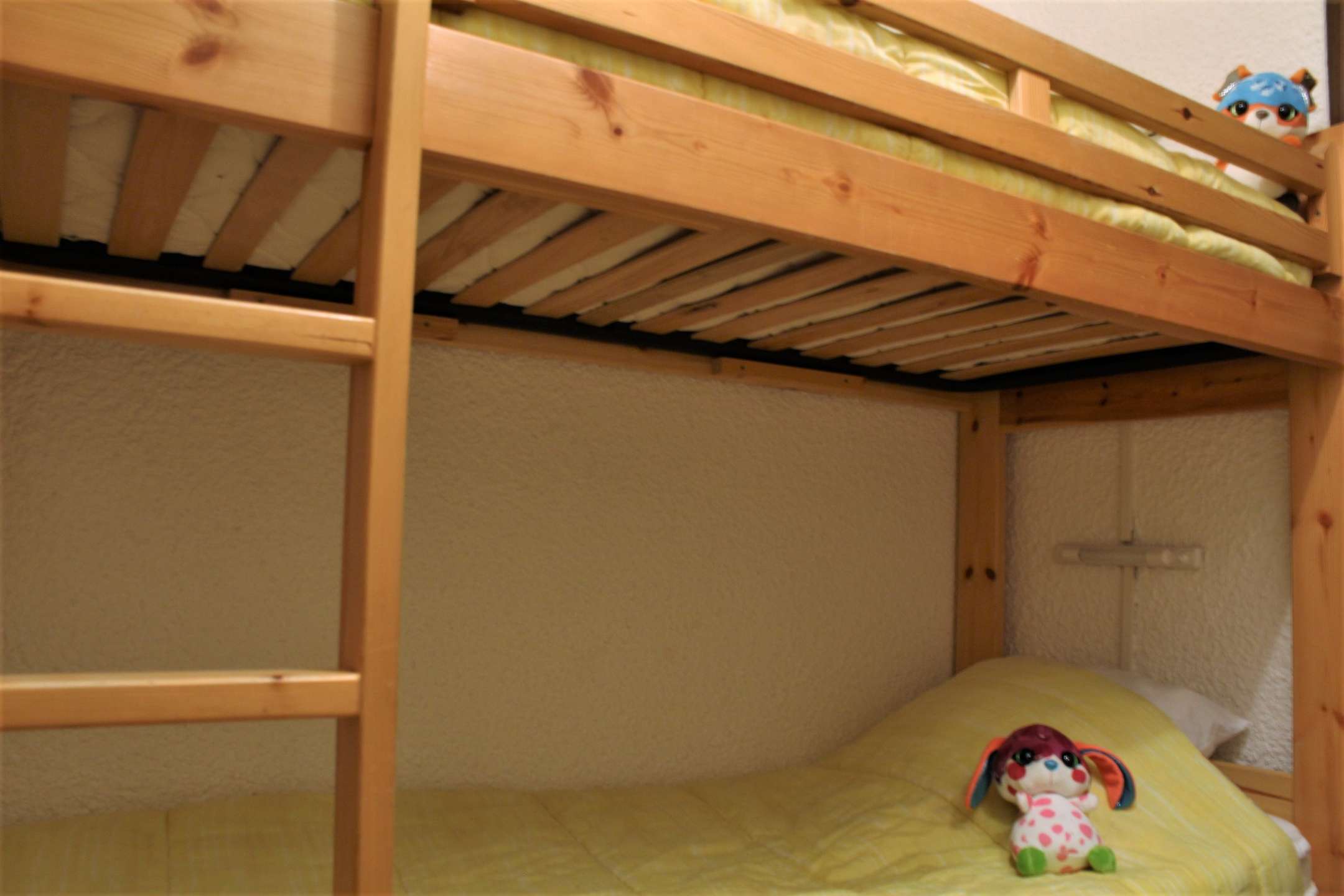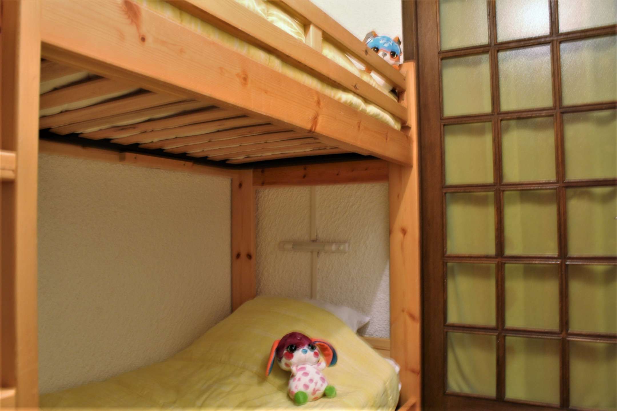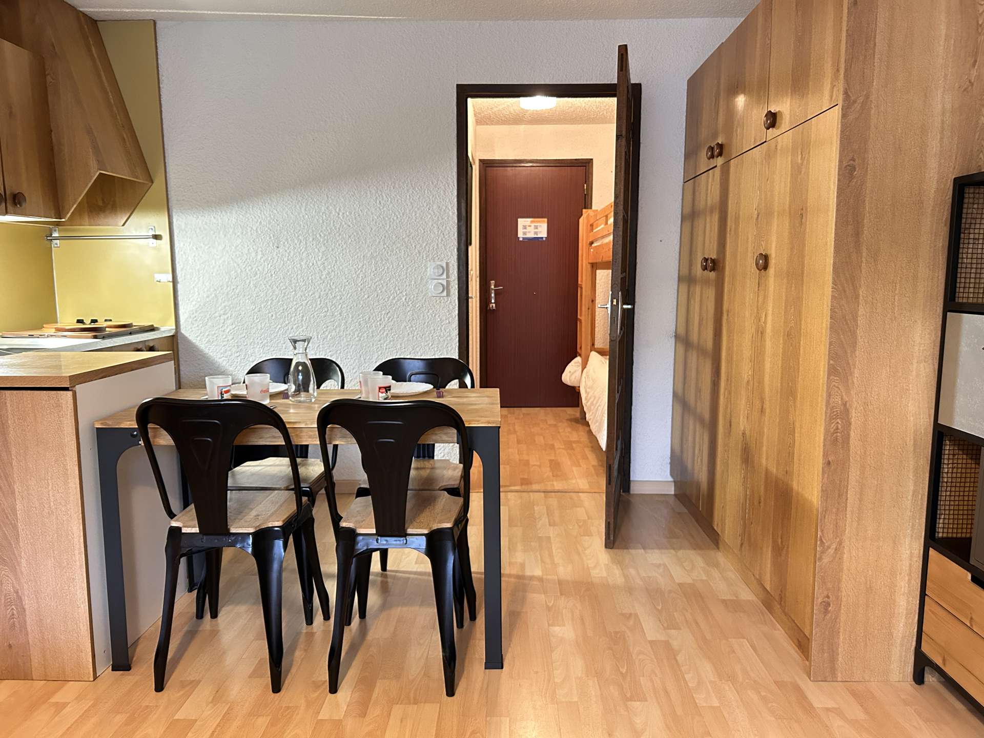 Located at the foot of the slopes, this studio is organized around a living room with a double bed, a mountain corner at the entrance with a bunk bed (two single beds) separated from the living room by a door. This apartment also has a kitchen equipped with electric hobs, an oven, a microwave and a refrigerator. There is a bathroom with a bathtub, and the toilet is separate.