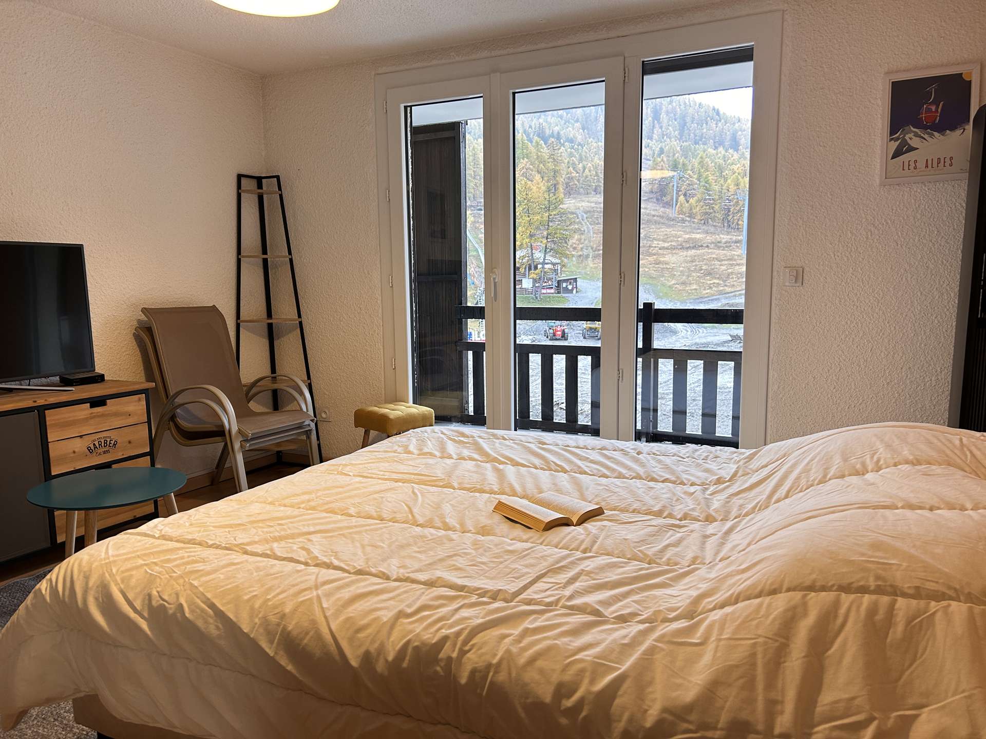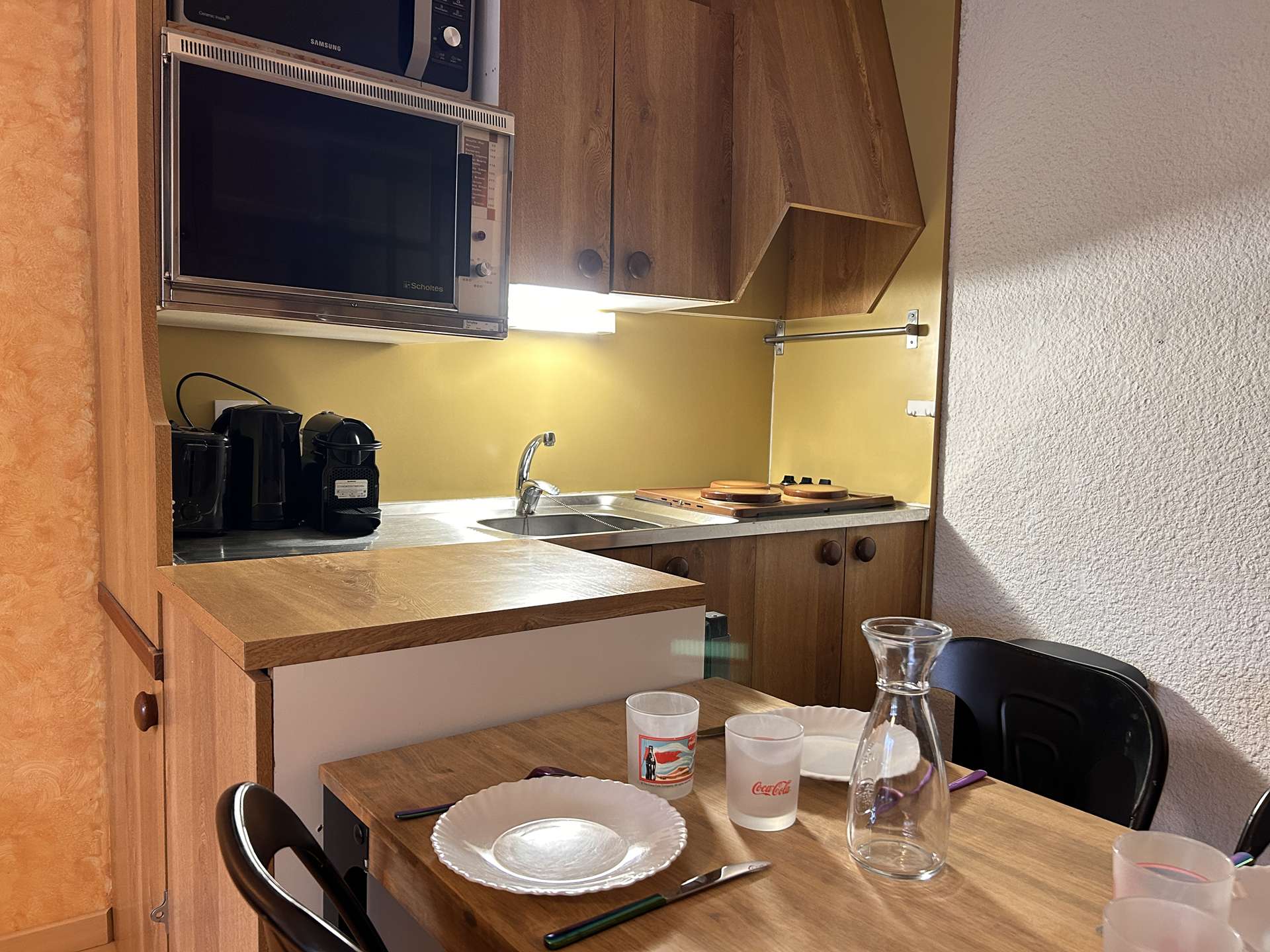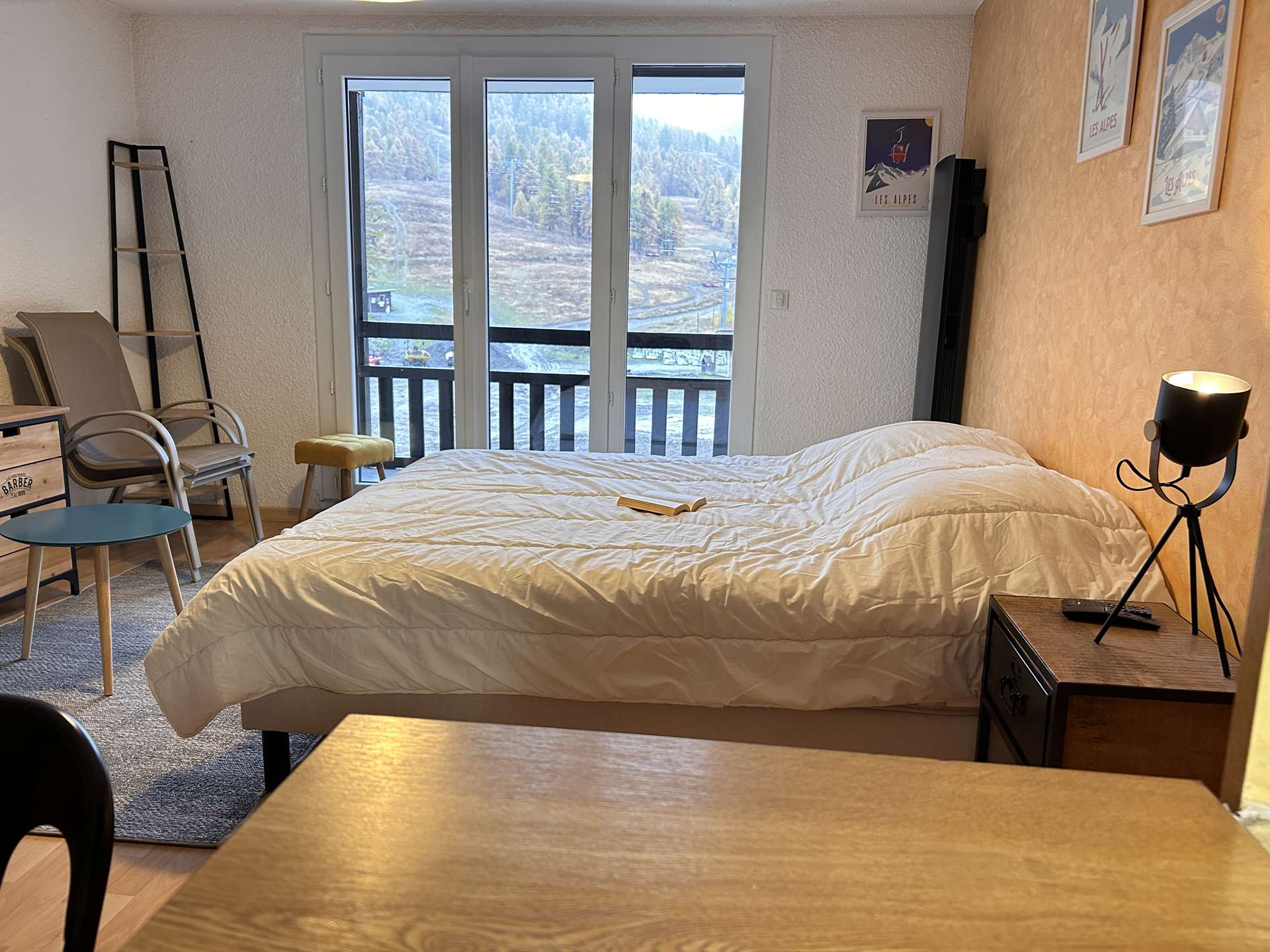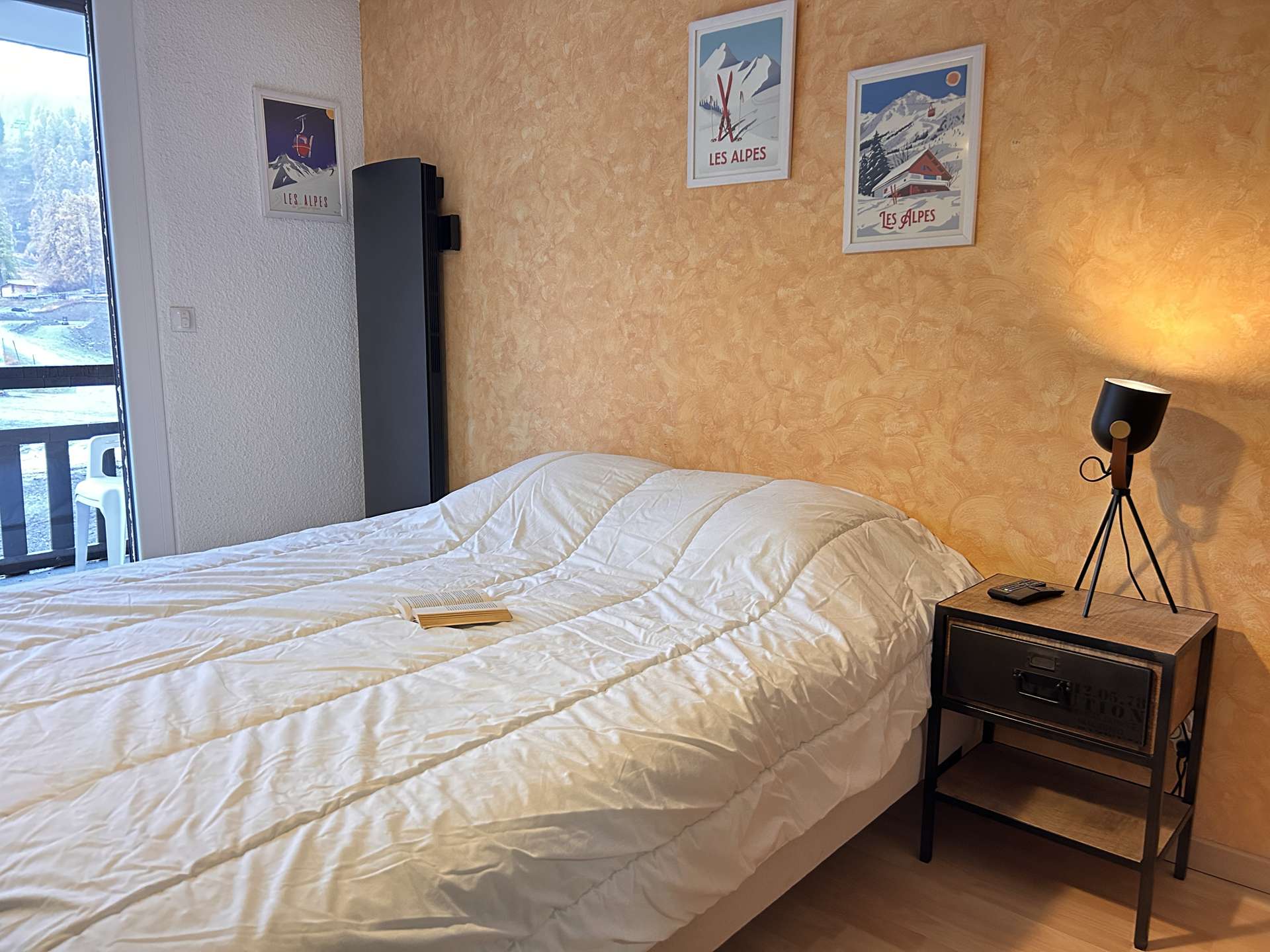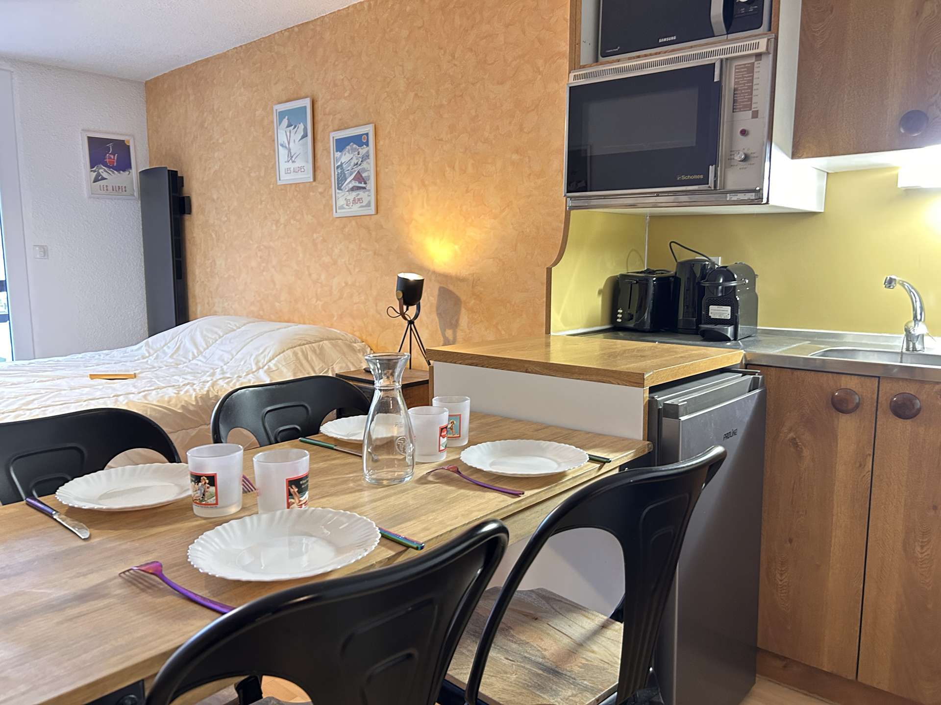 Located at the foot of the slopes, this studio is organized around a living room with a double bed, a mountain corner at the entrance with a bunk bed (two single beds) separated from the living room by a door. This apartment also has a kitchen equipped with electric hobs, an oven, a microwave and a refrigerator. There is a bathroom with a bathtub, and the toilet is separate.