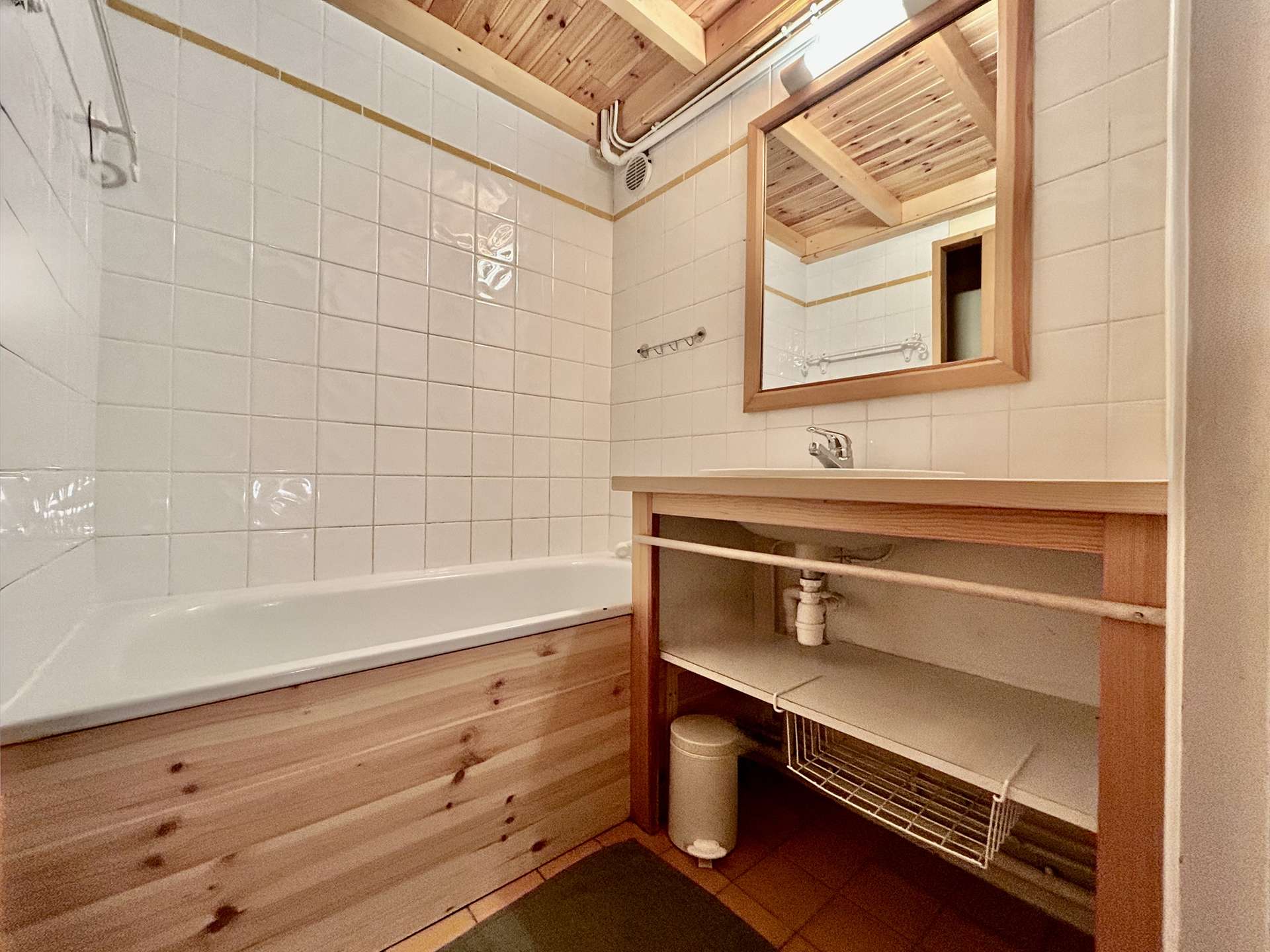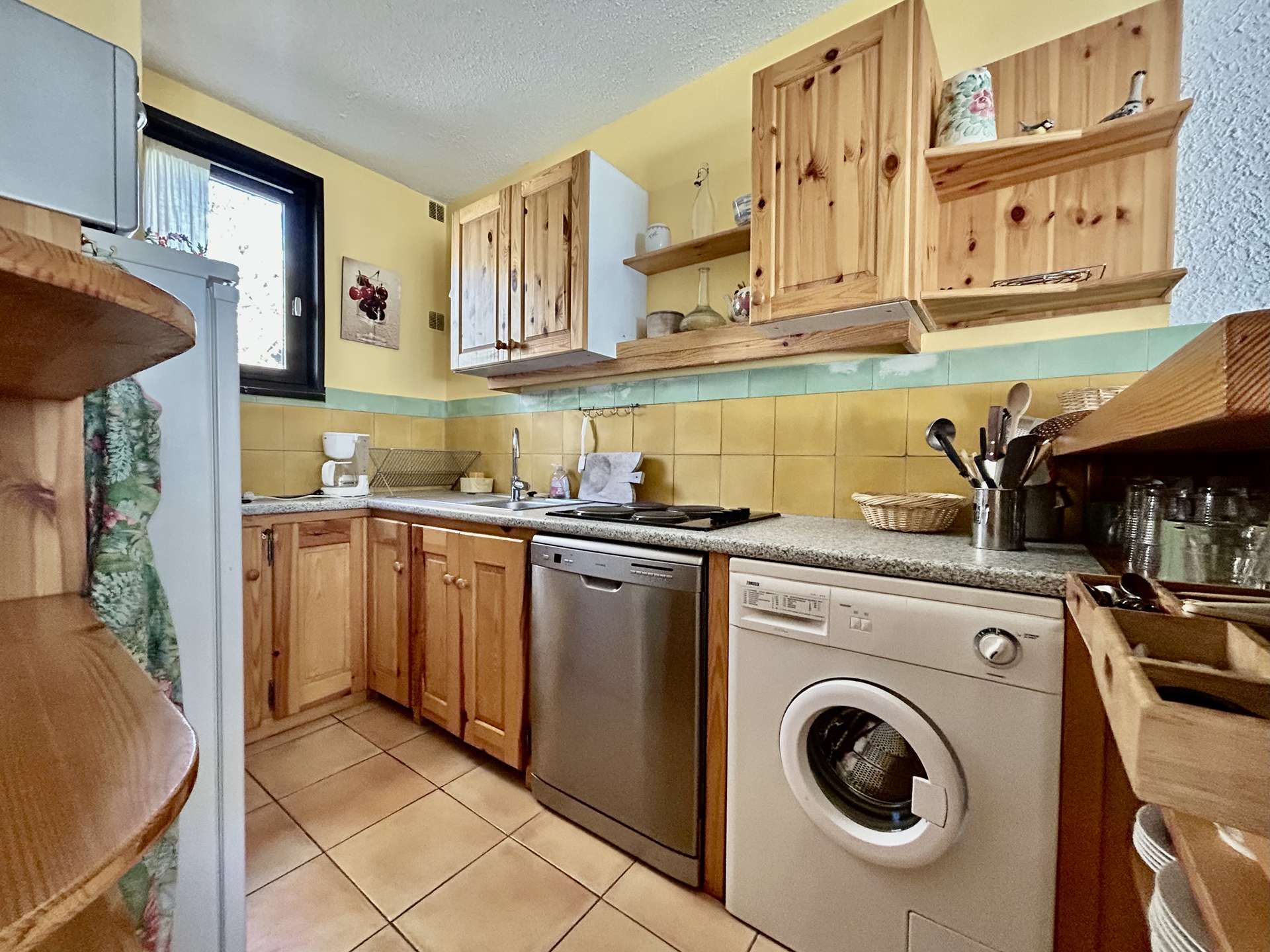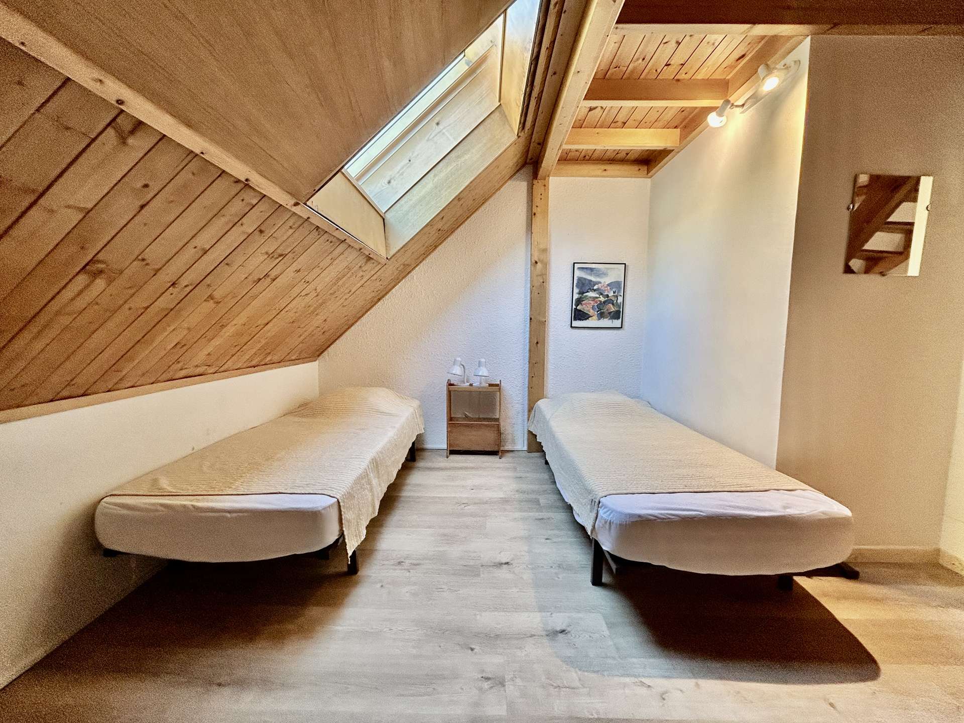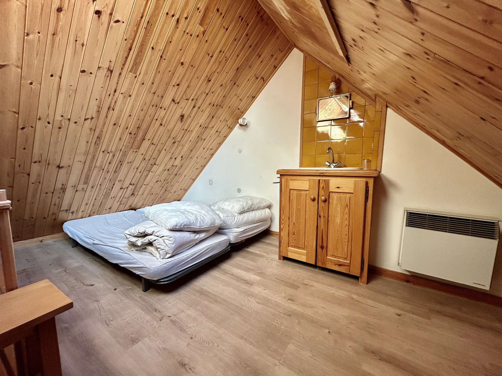 This three-room apartment is organized as follows: an upstairs bedroom with a double bed, a second bedroom with two single beds, an attic furnished with two mattresses and a washbasin, a living room with balcony and two sofa beds for one person, an equipped kitchenette (dishwasher, washing machine, oven), a bathroom with WC upstairs and separate WC.
