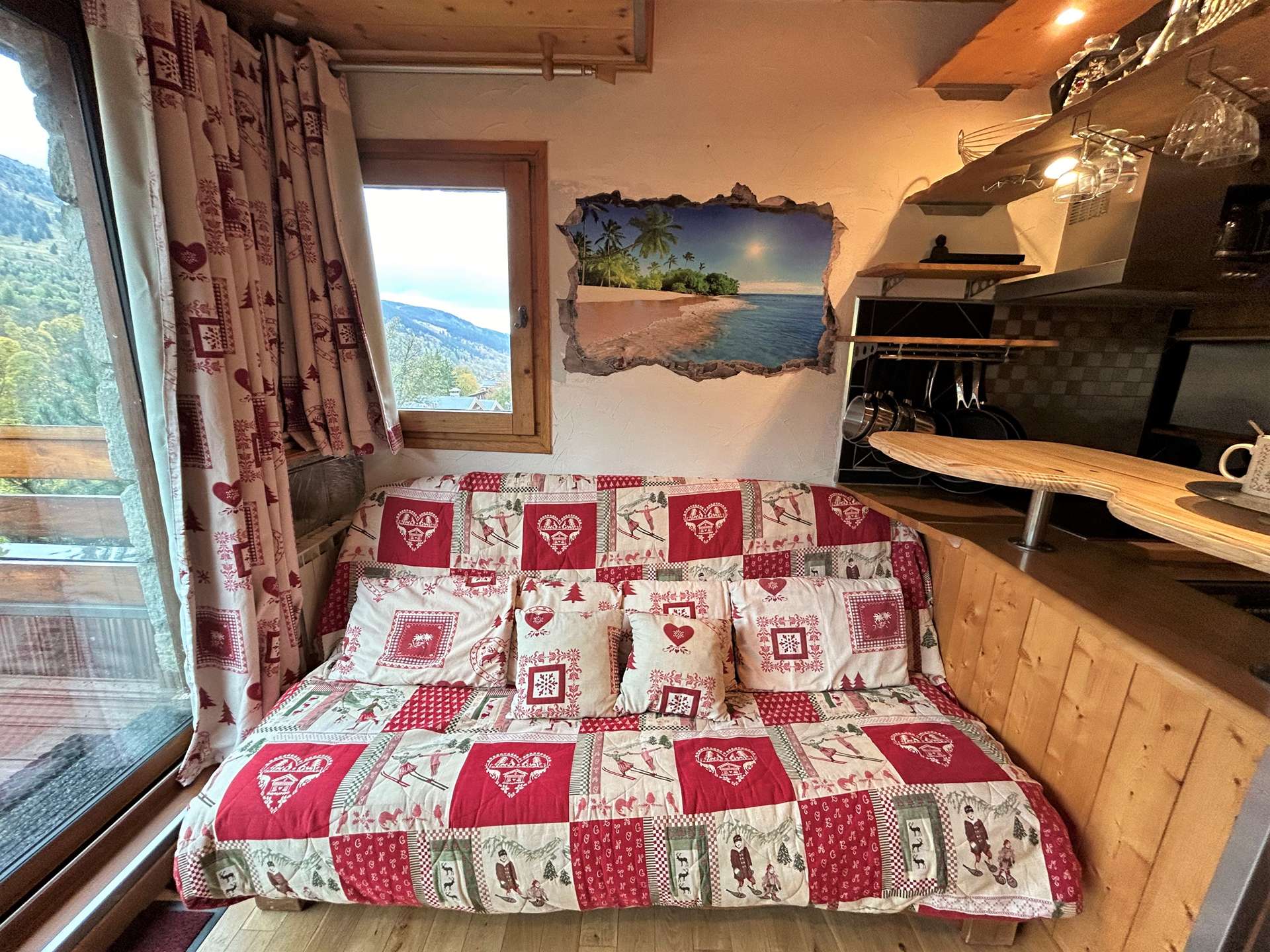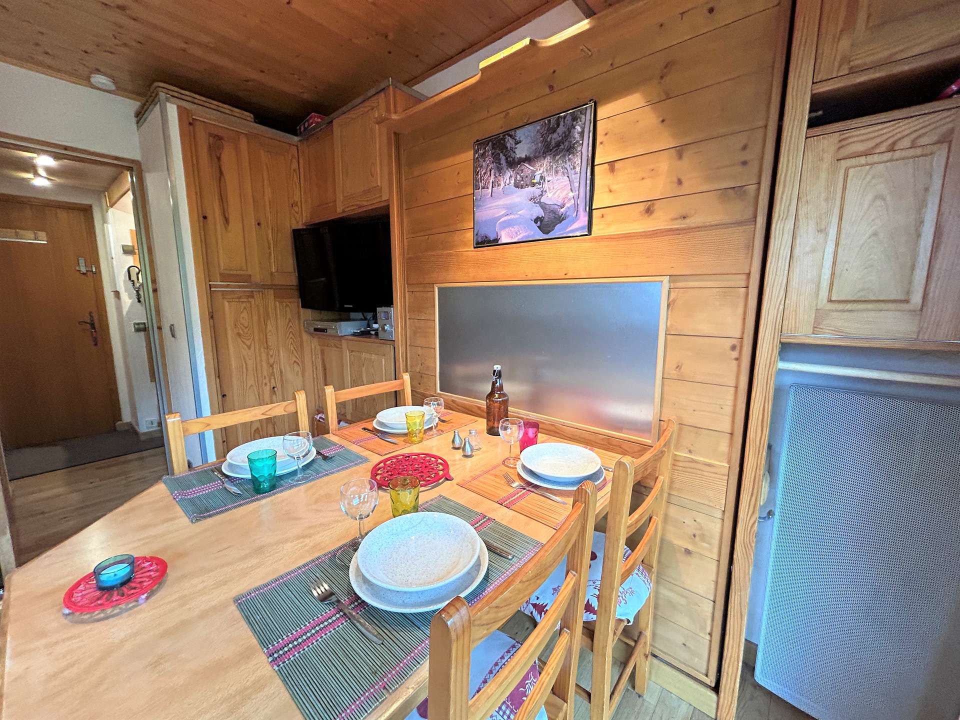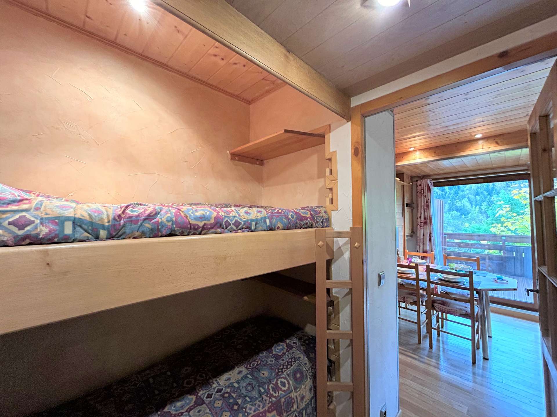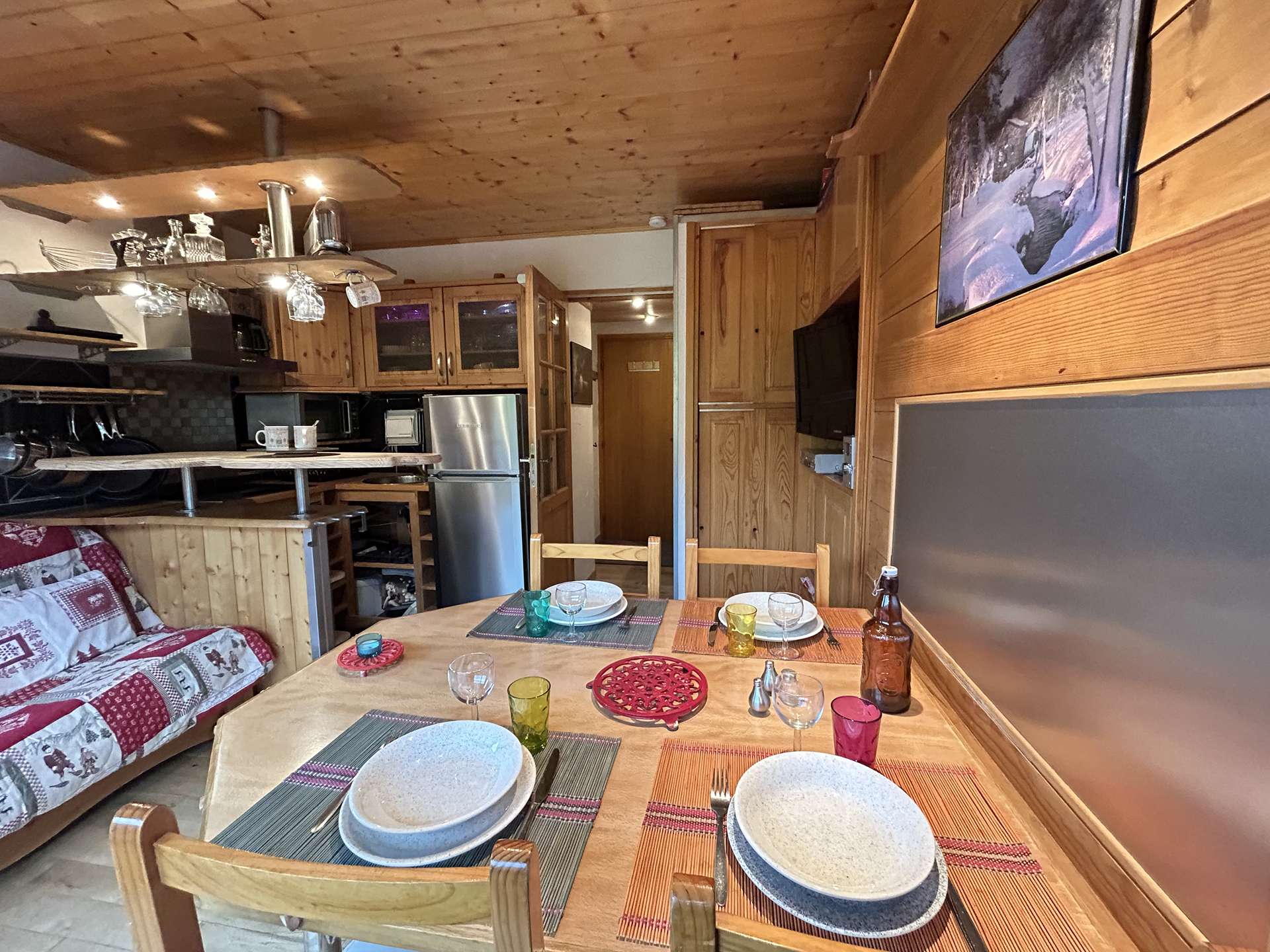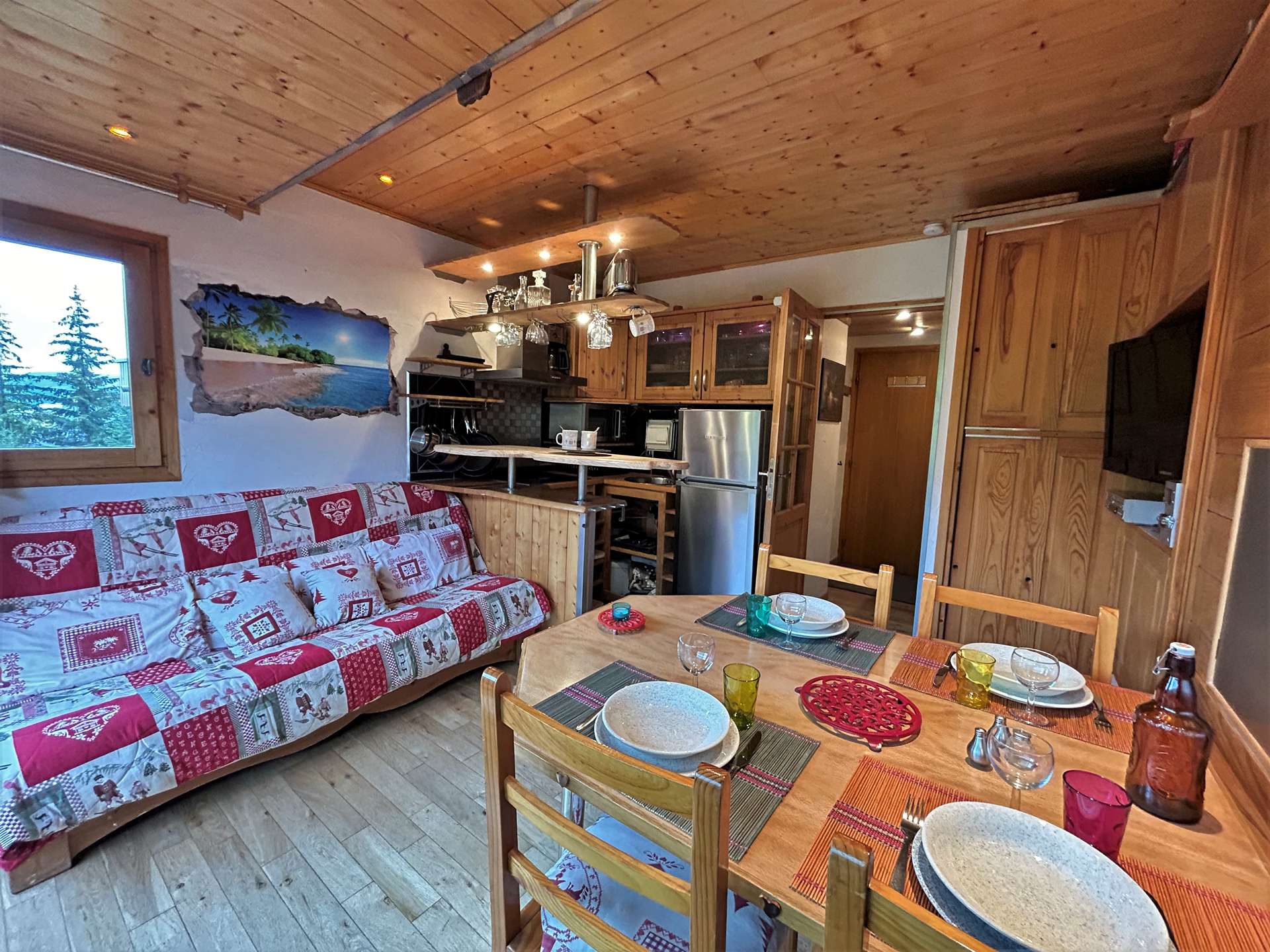 Méribel (73) - Center - Residence Studio apartment - approximately 25m² - up to 4 people The residence "" with summer swimming pool is located at the bottom of the resort center, 150m from shops, restaurants and 100m from the free shuttle stop. It is approximately 200m from the slopes. This pretty studio apartment is located on the ground floor of the residence. It consists of an equipped kitchen open to a living room opening onto a west terrace. You have a dining area, a small living room with sofa, a 140cm mountain bed for 2 people and a television. In the entrance you will find 1 set of enclosed bunk beds, a bathroom with shower and bathtub and toilets. You have a ski locker and a parking space in the residence's garage. The advantages of this apartment: the well-optimized studio space, the private parking space in the residence's garage, the "proximity to amenities" location, the west terrace, the swimming pool (summer only). Cleaning with disinfection is included.