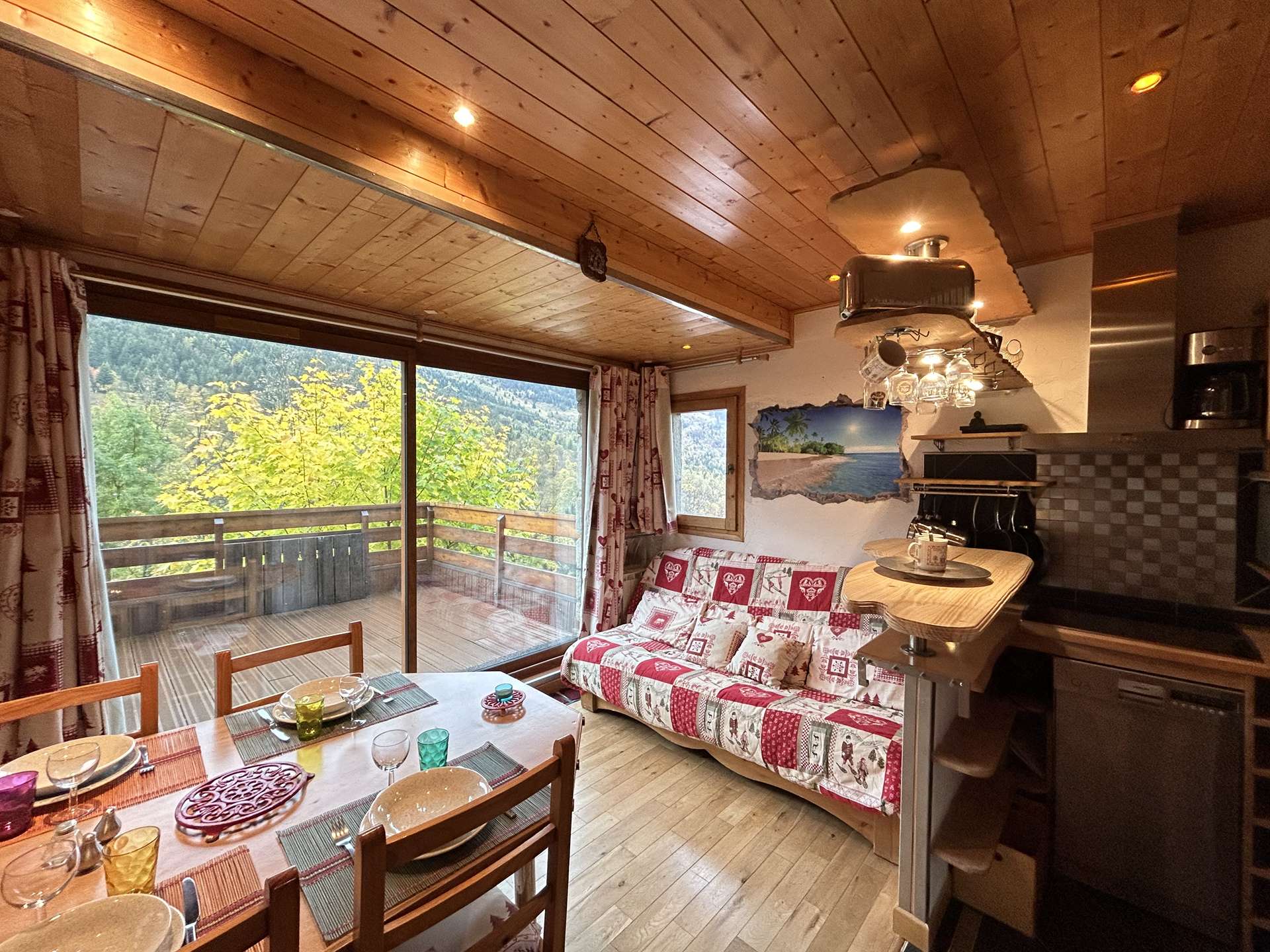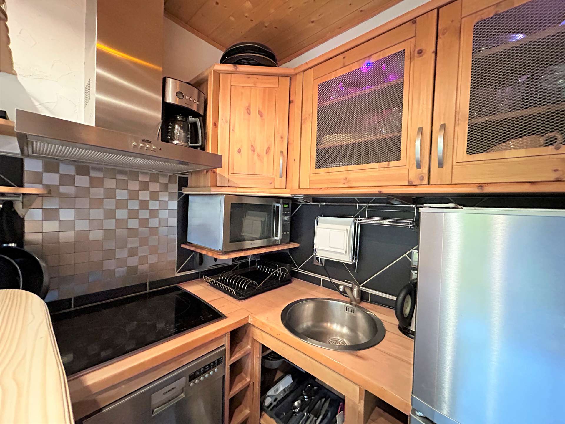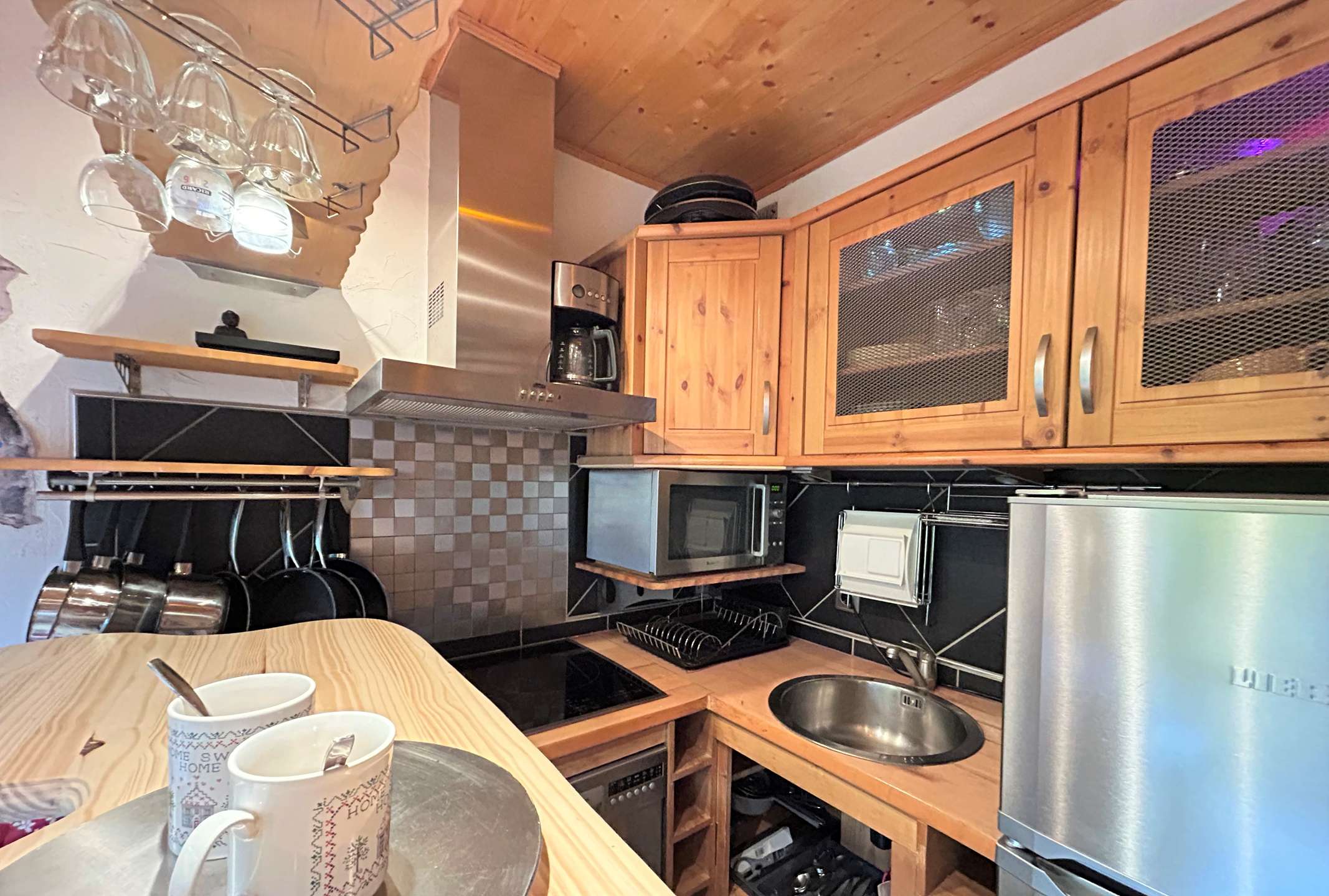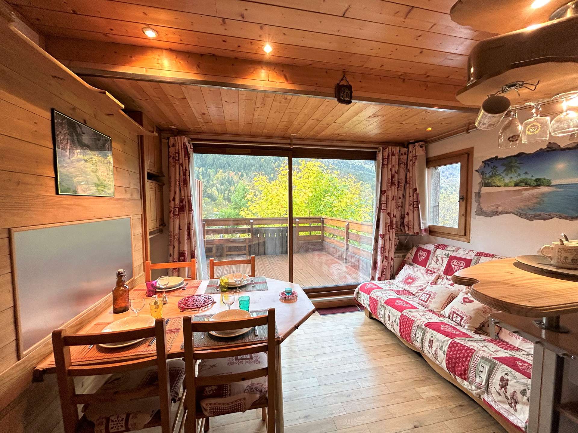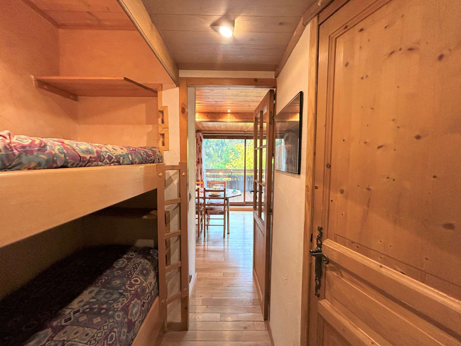 Méribel (73) - Center - Residence Studio apartment - approximately 25m² - up to 4 people The residence "" with summer swimming pool is located at the bottom of the resort center, 150m from shops, restaurants and 100m from the free shuttle stop. It is approximately 200m from the slopes. This pretty studio apartment is located on the ground floor of the residence. It consists of an equipped kitchen open to a living room opening onto a west terrace. You have a dining area, a small living room with sofa, a 140cm mountain bed for 2 people and a television. In the entrance you will find 1 set of enclosed bunk beds, a bathroom with shower and bathtub and toilets. You have a ski locker and a parking space in the residence's garage. The advantages of this apartment: the well-optimized studio space, the private parking space in the residence's garage, the "proximity to amenities" location, the west terrace, the swimming pool (summer only). Cleaning with disinfection is included.