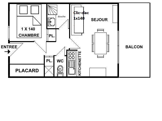 The apartment has a living room with a 140cm sofa bed, a fully-equipped kitchenette, a bedroom with a 140cm bed, a shower room and a separate WC.