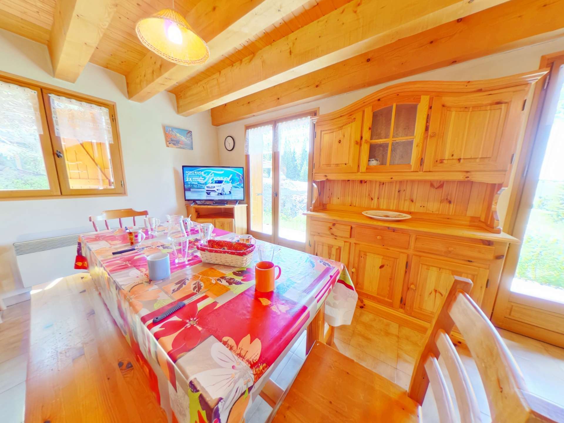 Le chalet se compose d'un séjour avec une banquette gigogne 2x90, d'une chambre avec un lit 140, d'une seconde chambre avec un lit 140, d'une chambre avec deux lits 90, d'une salle d'eau et deux WC séparés. La cuisine est ouverte sur le séjour.