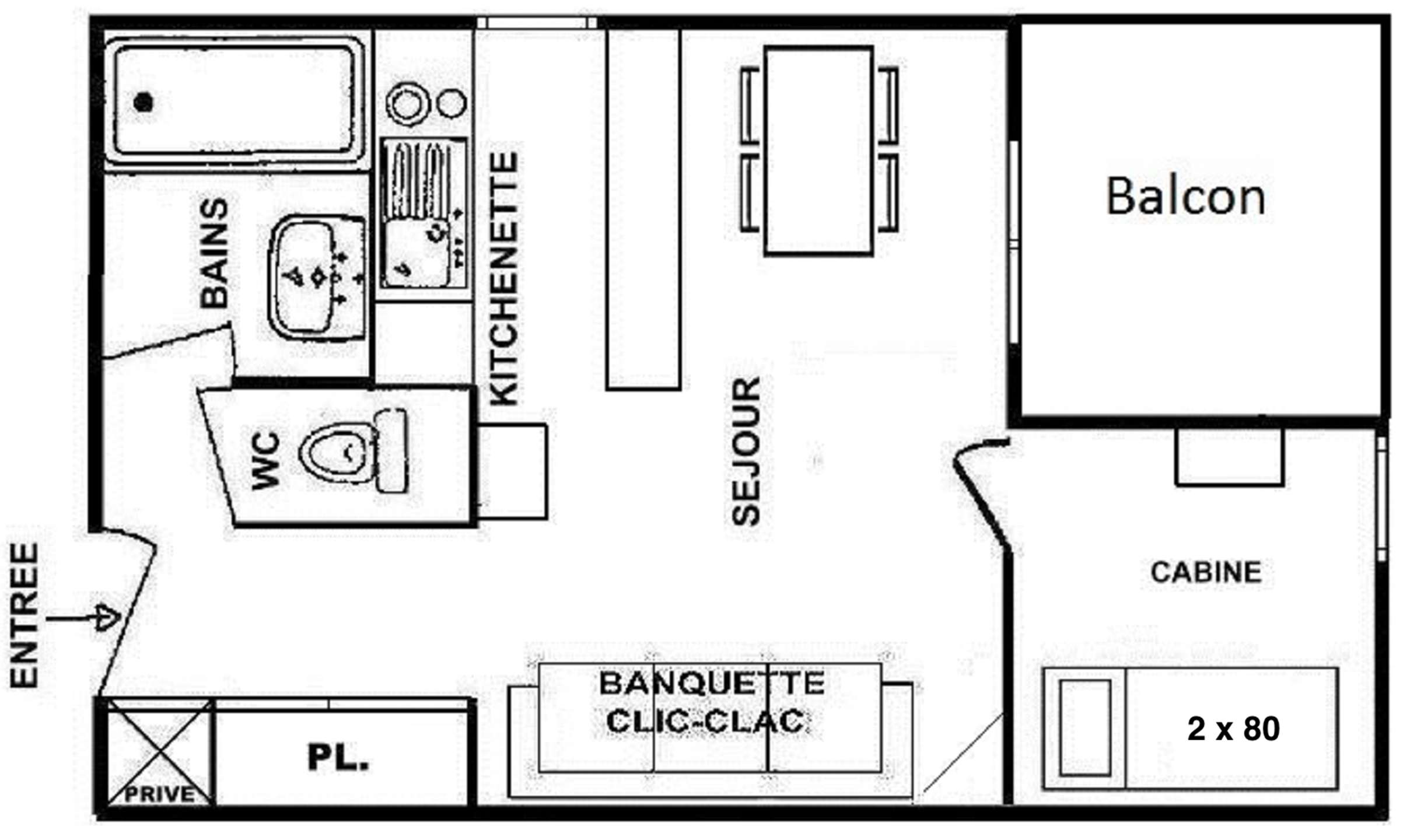 The apartment has a living room with a 140cm sofa bed and open-plan fitted kitchenette, a cabin with 2x90cm bunk beds (NB: the top bunk is not suitable for children under 6), a bathroom and separate WC.