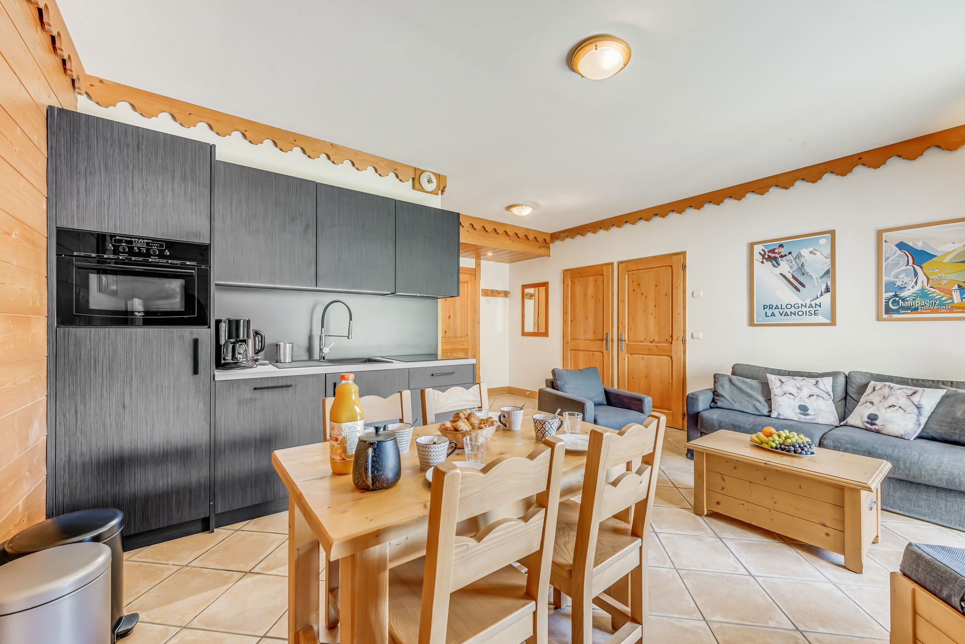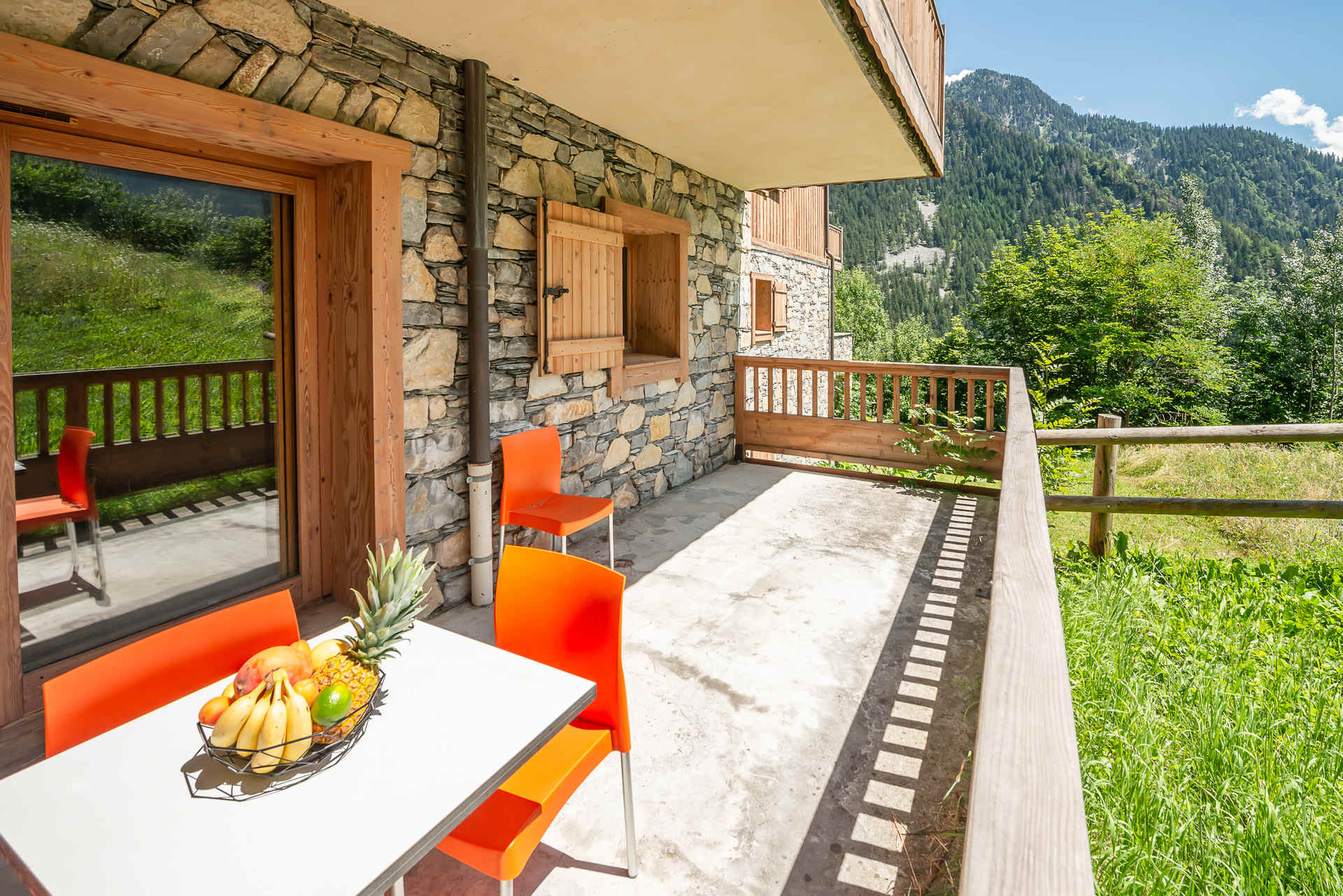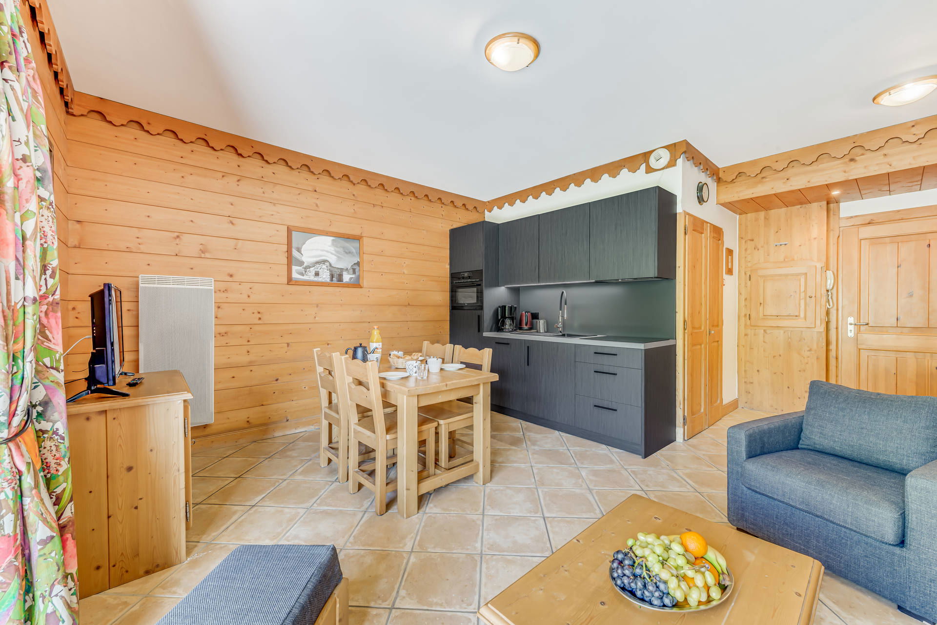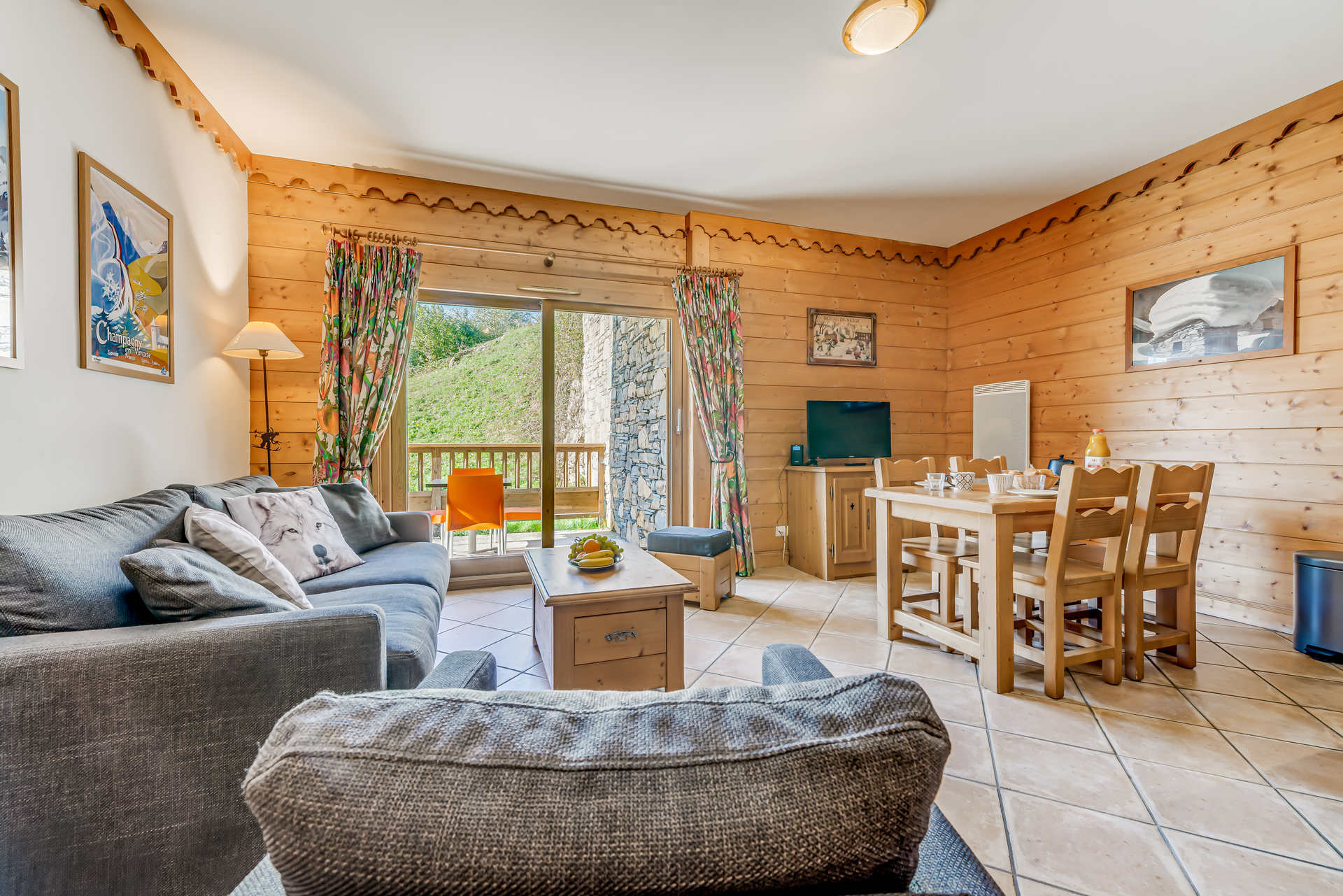 - a dining and living area with sofa (couch for 2 single persons ), television, opening onto a balcony with nice unostructed south view on the mountains