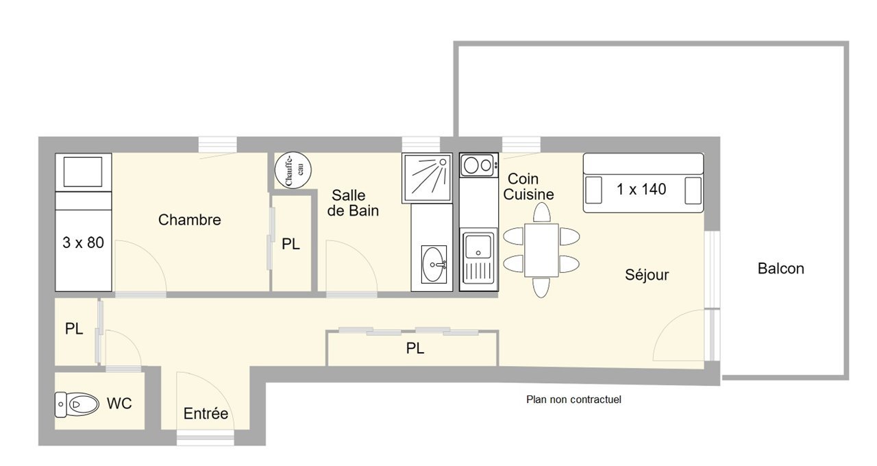 The apartment has a living room with a 140cm rapido sofa, an open-plan fully-equipped kitchenette, a bedroom with 2x90 bunk beds (NB: the top bunk is not suitable for under 6s) and a 90cm pull-out bed, a shower room and a separate WC.