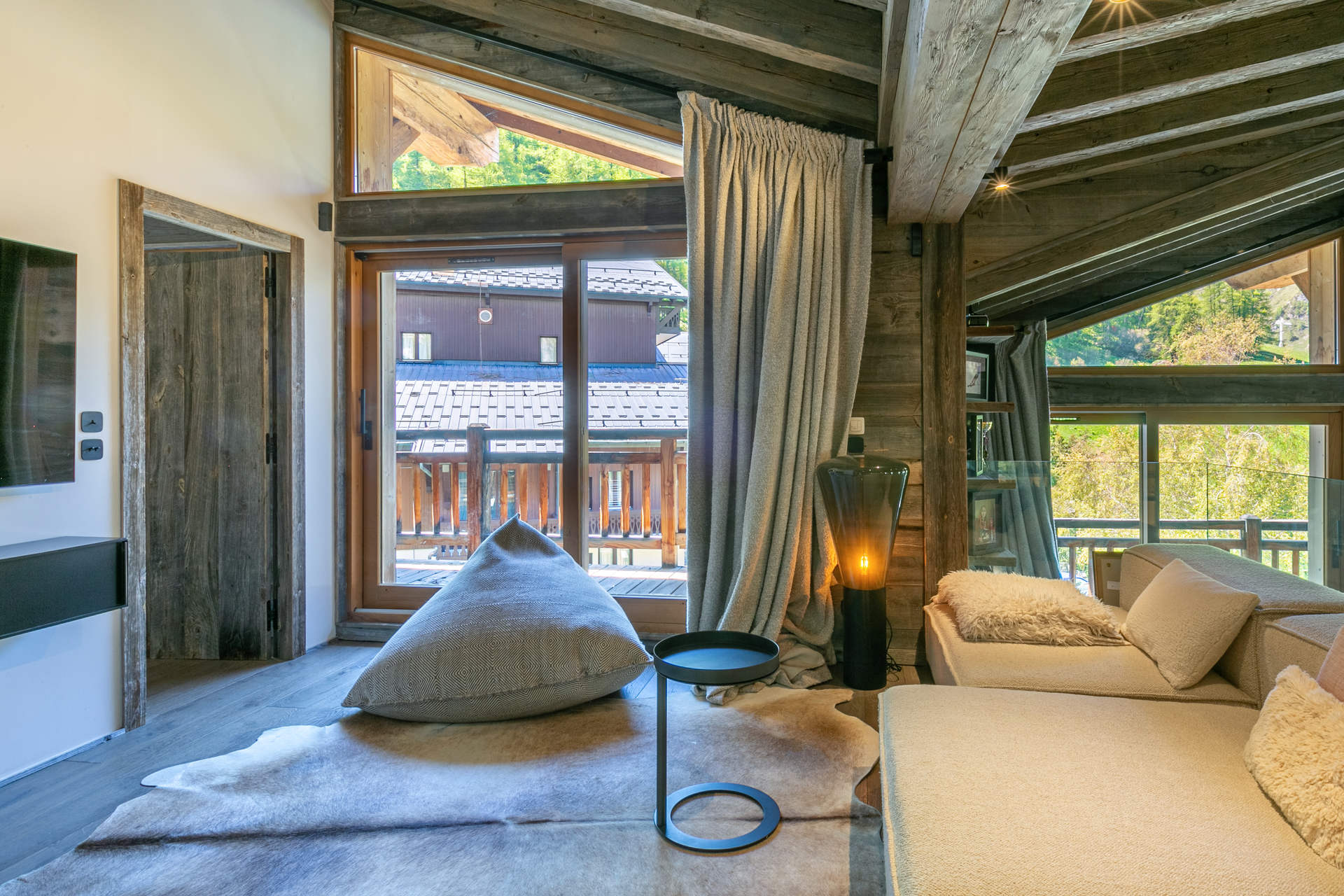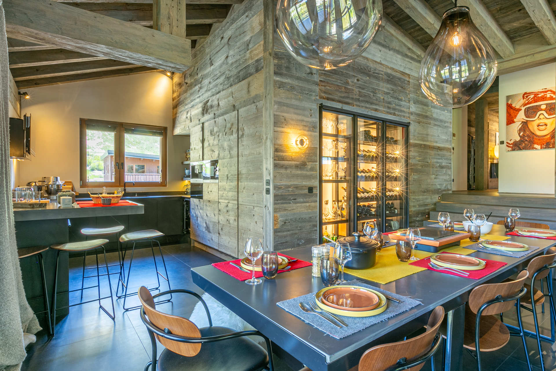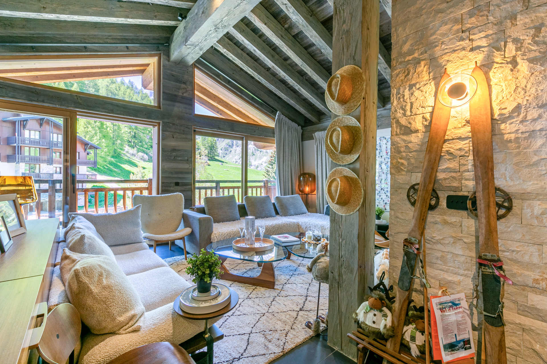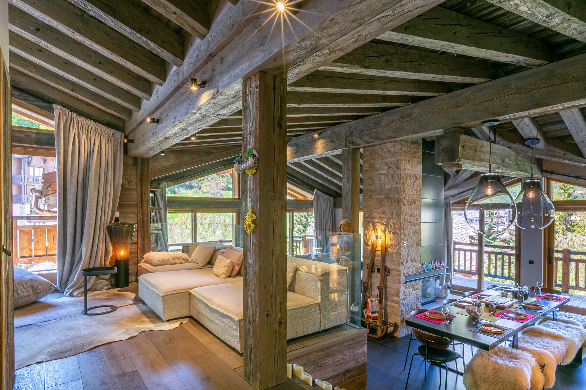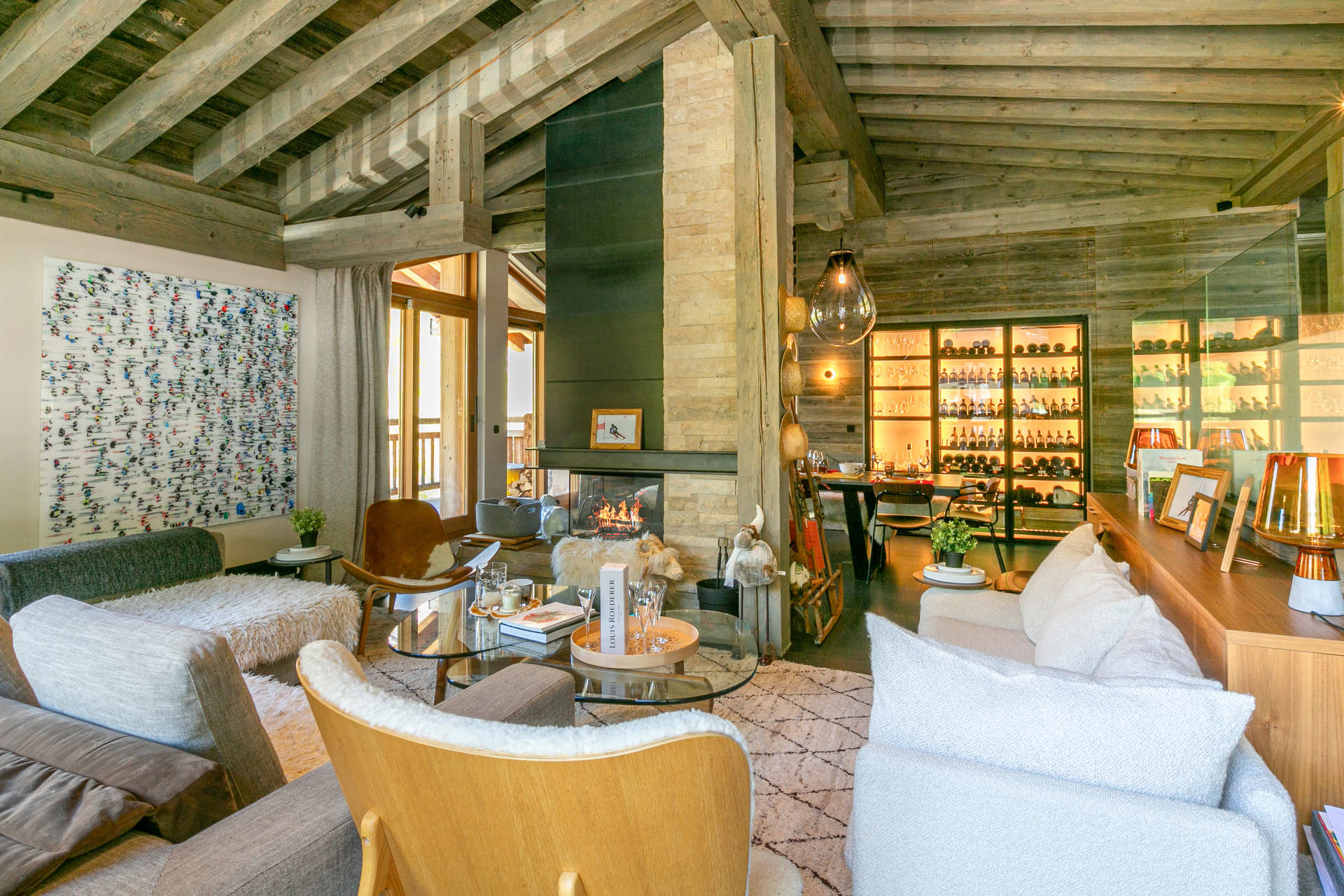 Interior of character combining contemporary decoration with an authentic Savoyard touch and warm architecture made of reclaimed timber and stone