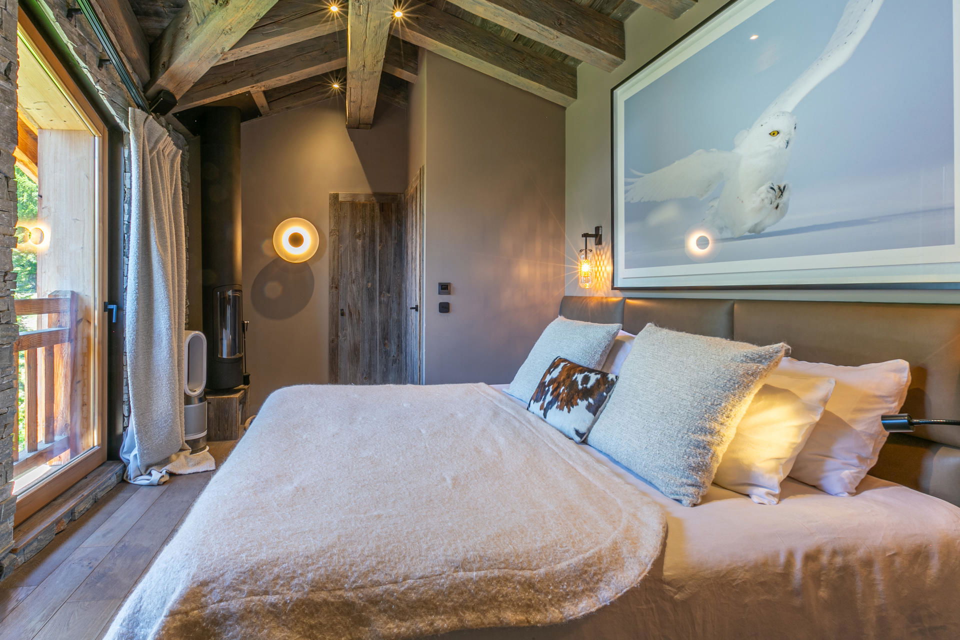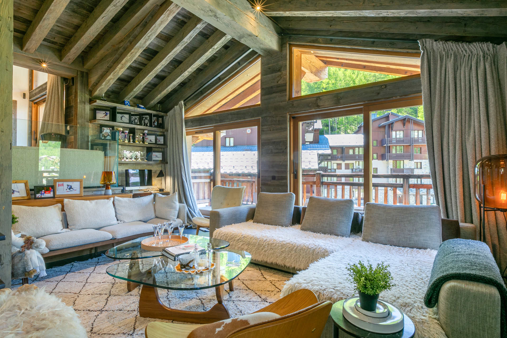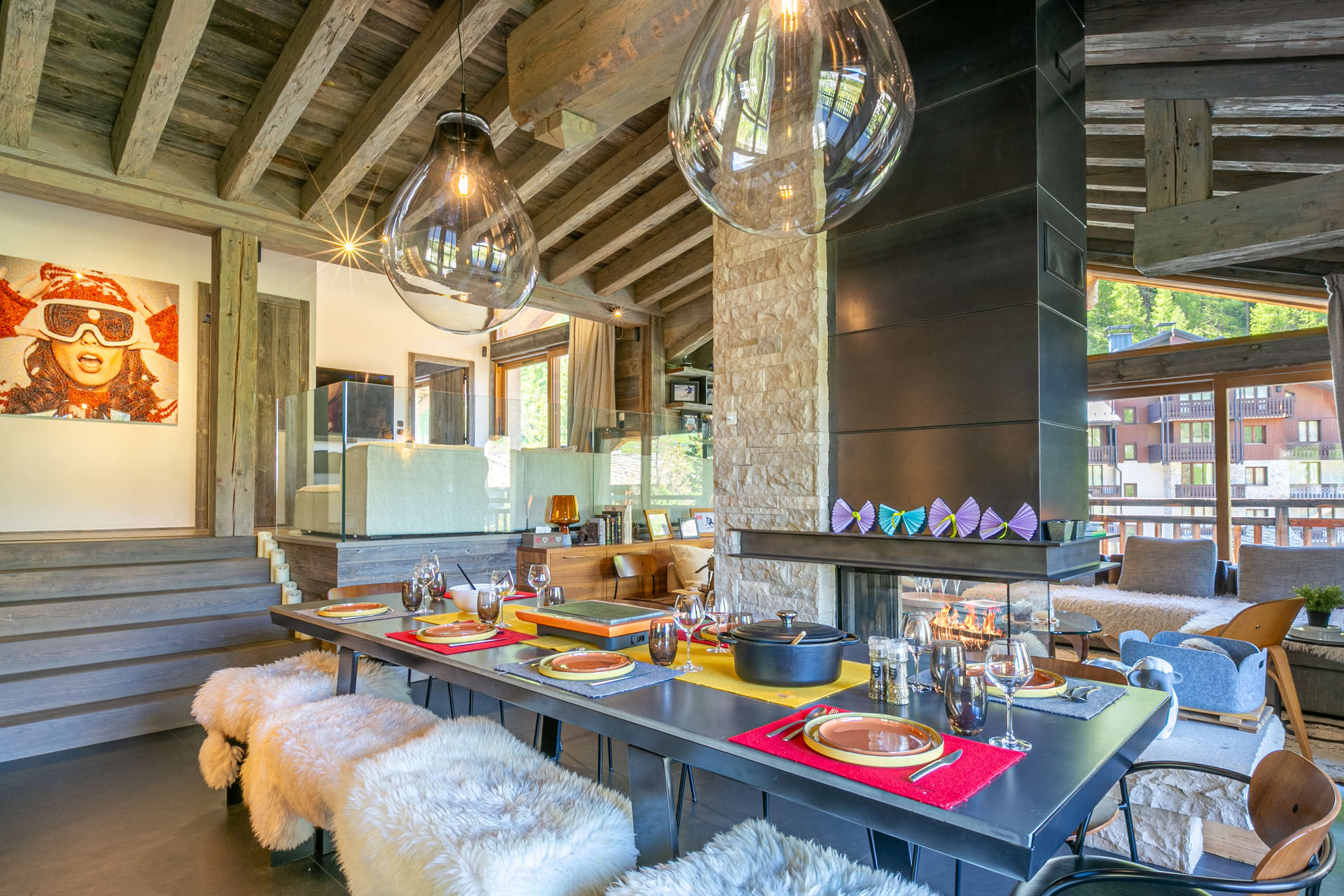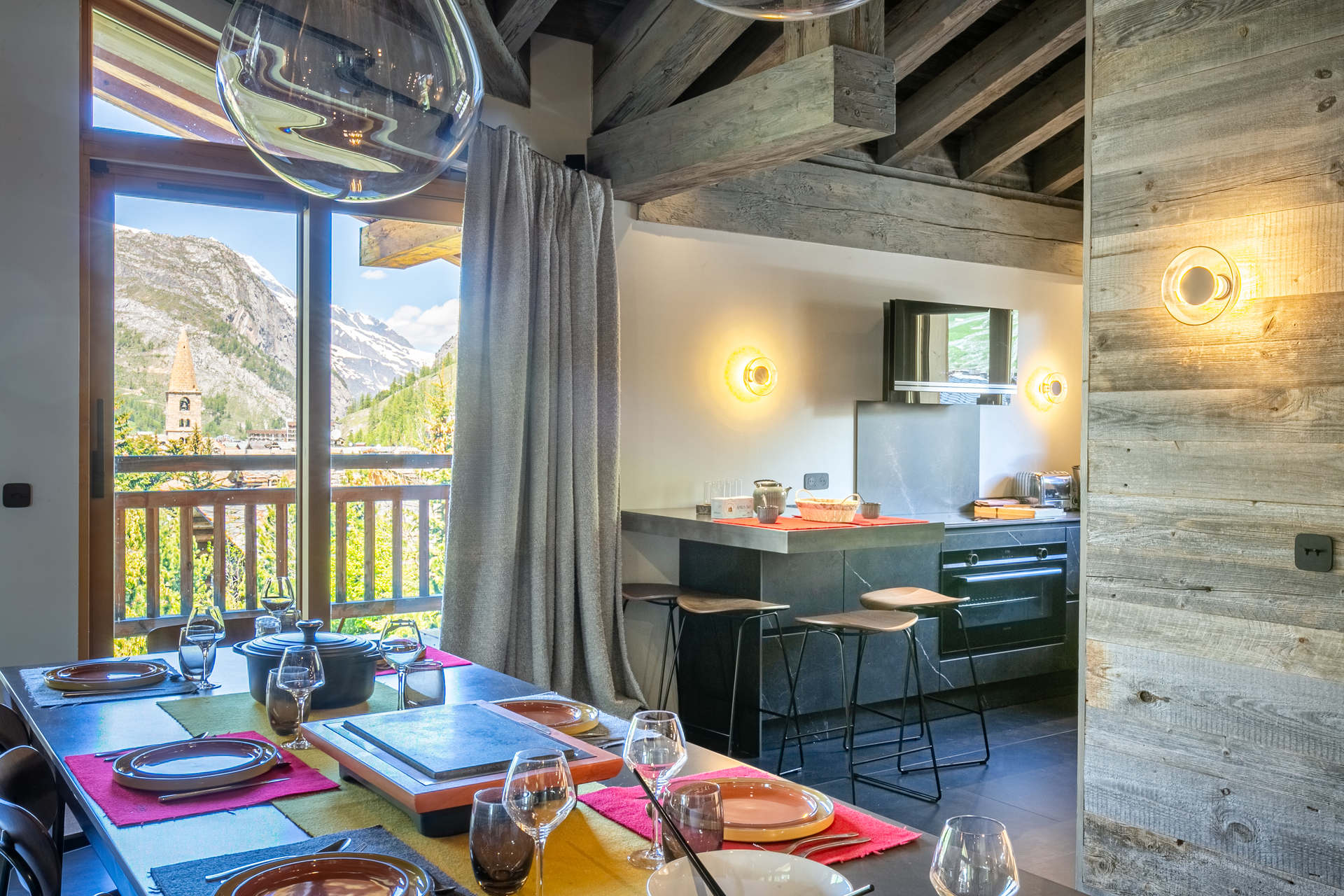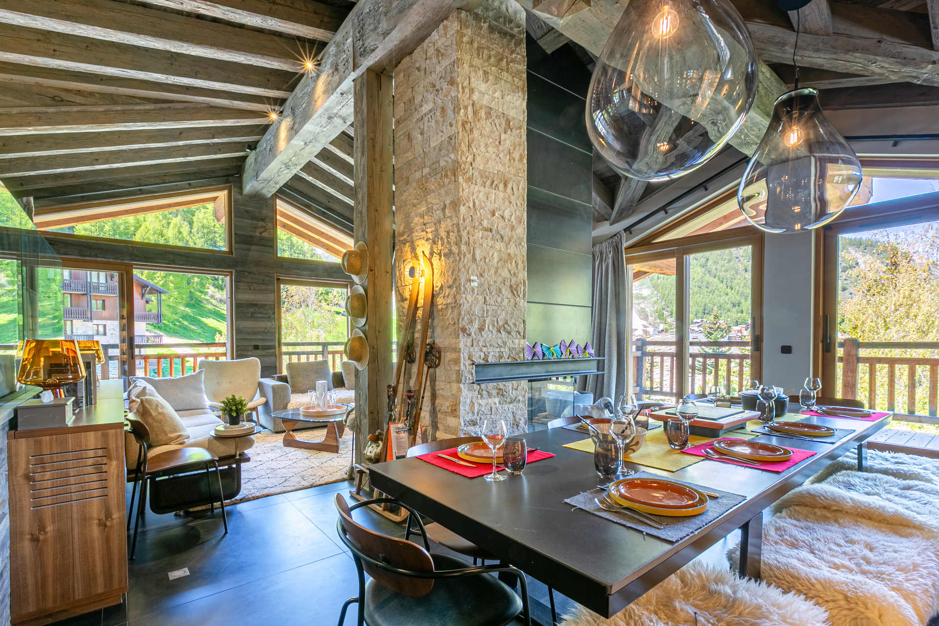 Interior of character combining contemporary decoration with an authentic Savoyard touch and warm architecture made of reclaimed timber and stone