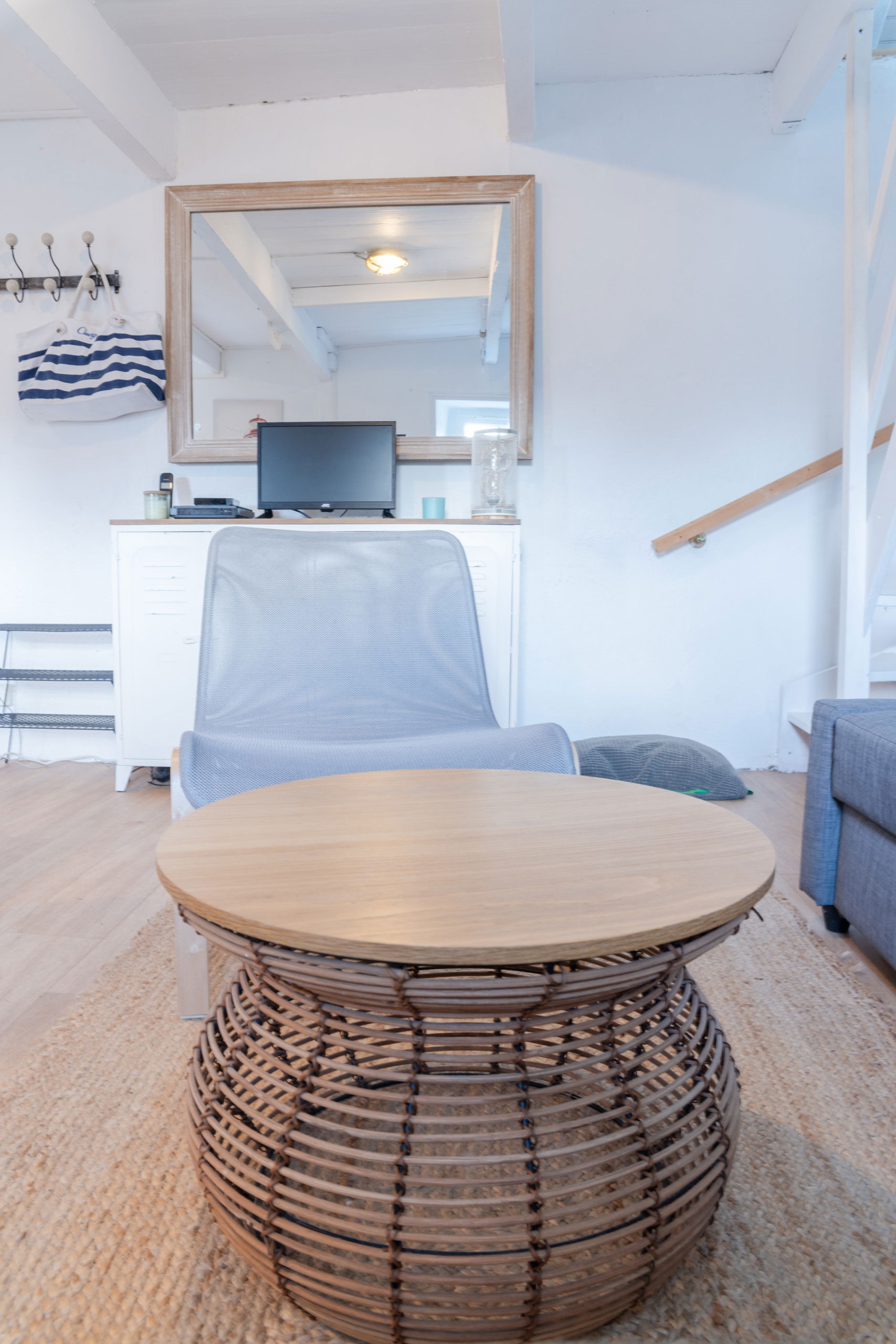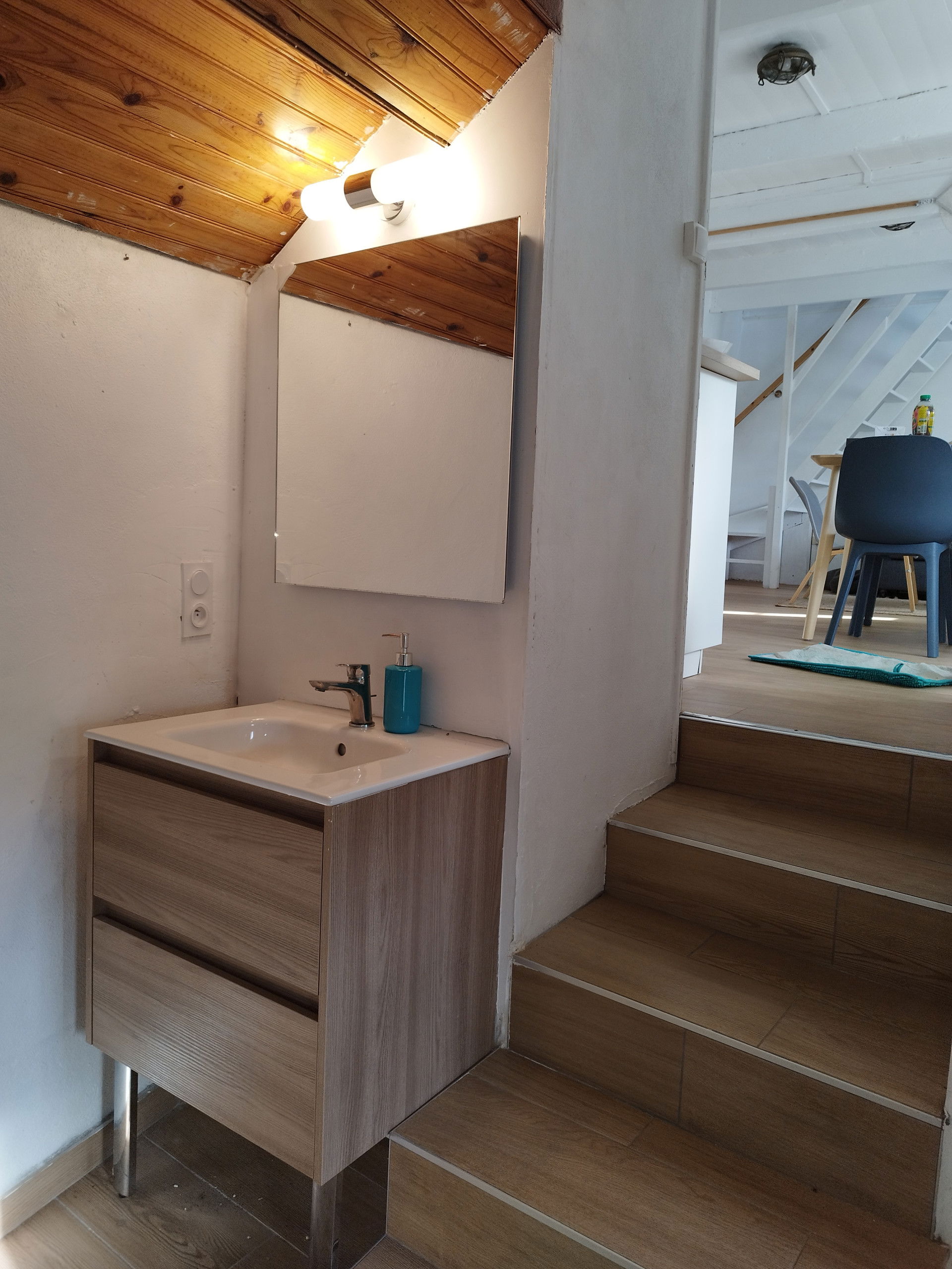 Upstairs, under the mansard roof, discover a charming room with exposed beams and equipped with a double bed. Beware for tall people, the ceiling is low and will force you to duck! But it is also this low ceiling that gives the room its "cocoon" charm. From the skylights, enjoy a view of the sea, adding an authentic touch to this space perfectly designed for a getaway for two.