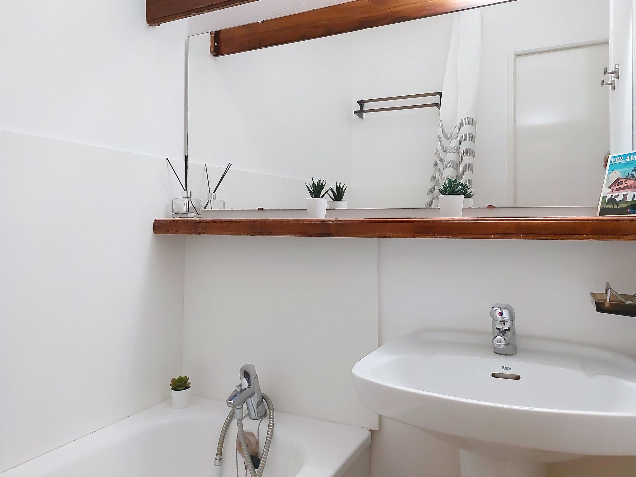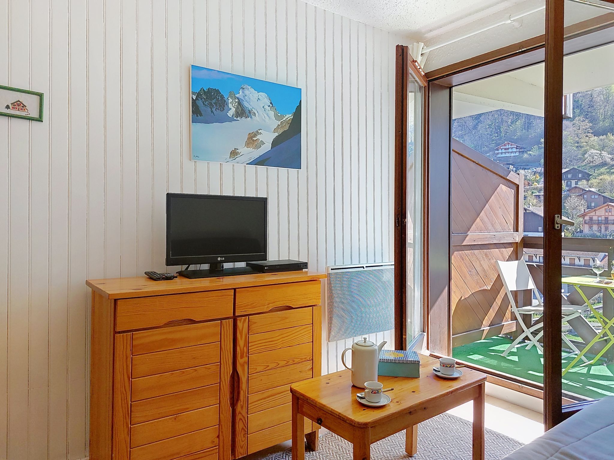 "Les Hauts de Saint Gervais", 2-room apartment 25 m2 on 2nd floor, east facing position. Living/dining room with 1 double sofabed, TV, flat screen and DVD. 1 room with 1 french bed (140 cm). Alcove with 1 x 2 bunk beds. Kitchenette in the entrance (3 hot plates, toaster, kettle, microwave, electric coffee machine, raclette grill). Bath/WC. Electric heating. Balcony, east facing position. View of the mountains. Facilities: iron. Internet (WiFi, extra). Garage space n 63, width 240 cm. Please note: non-smokers only. TV only FR. Smoke alarm. Instead of an enclosed bedroom, some sleeping areas are located in an open-plan area (gallery, alcove, etc.). FR7450.800.3