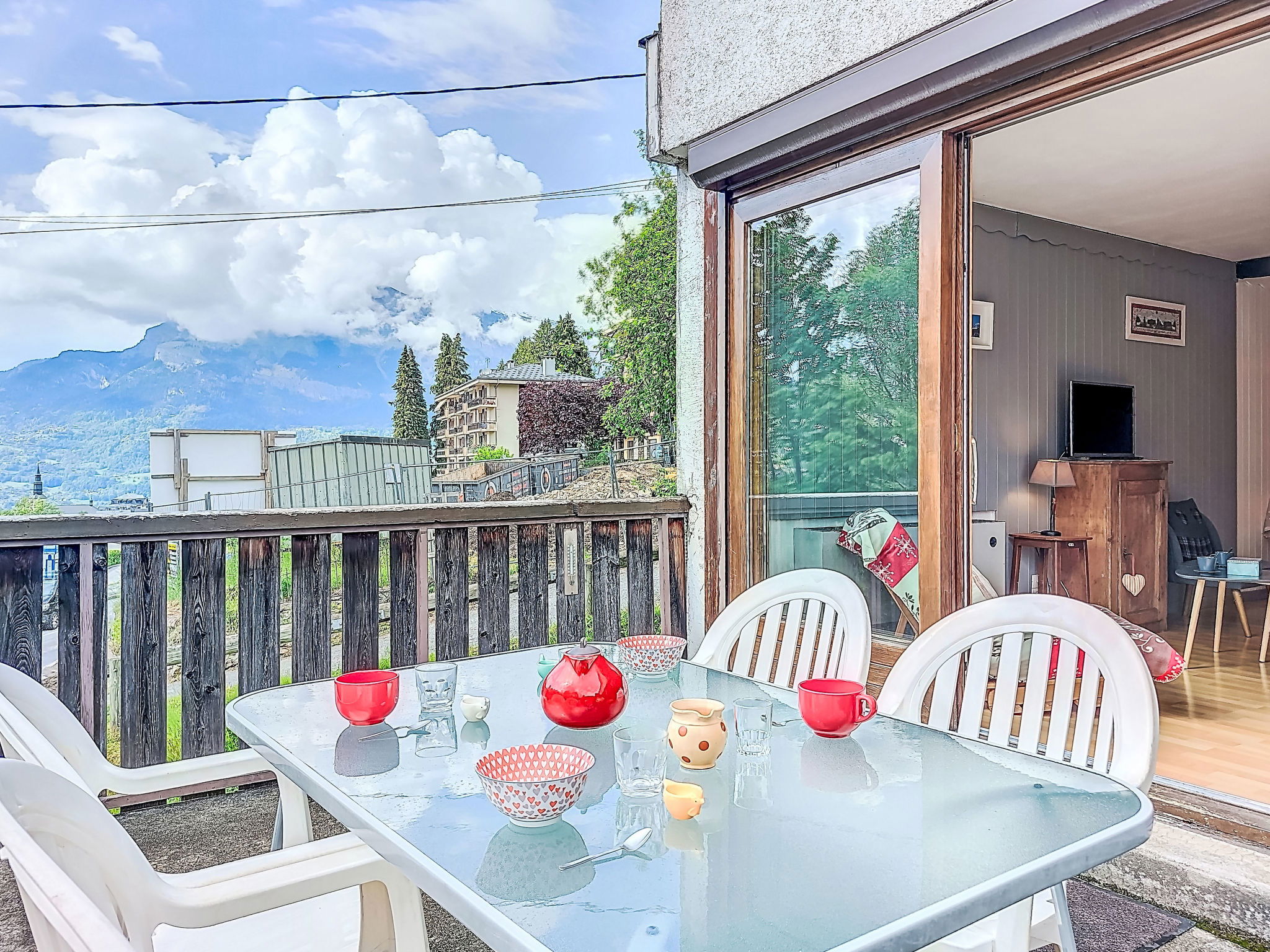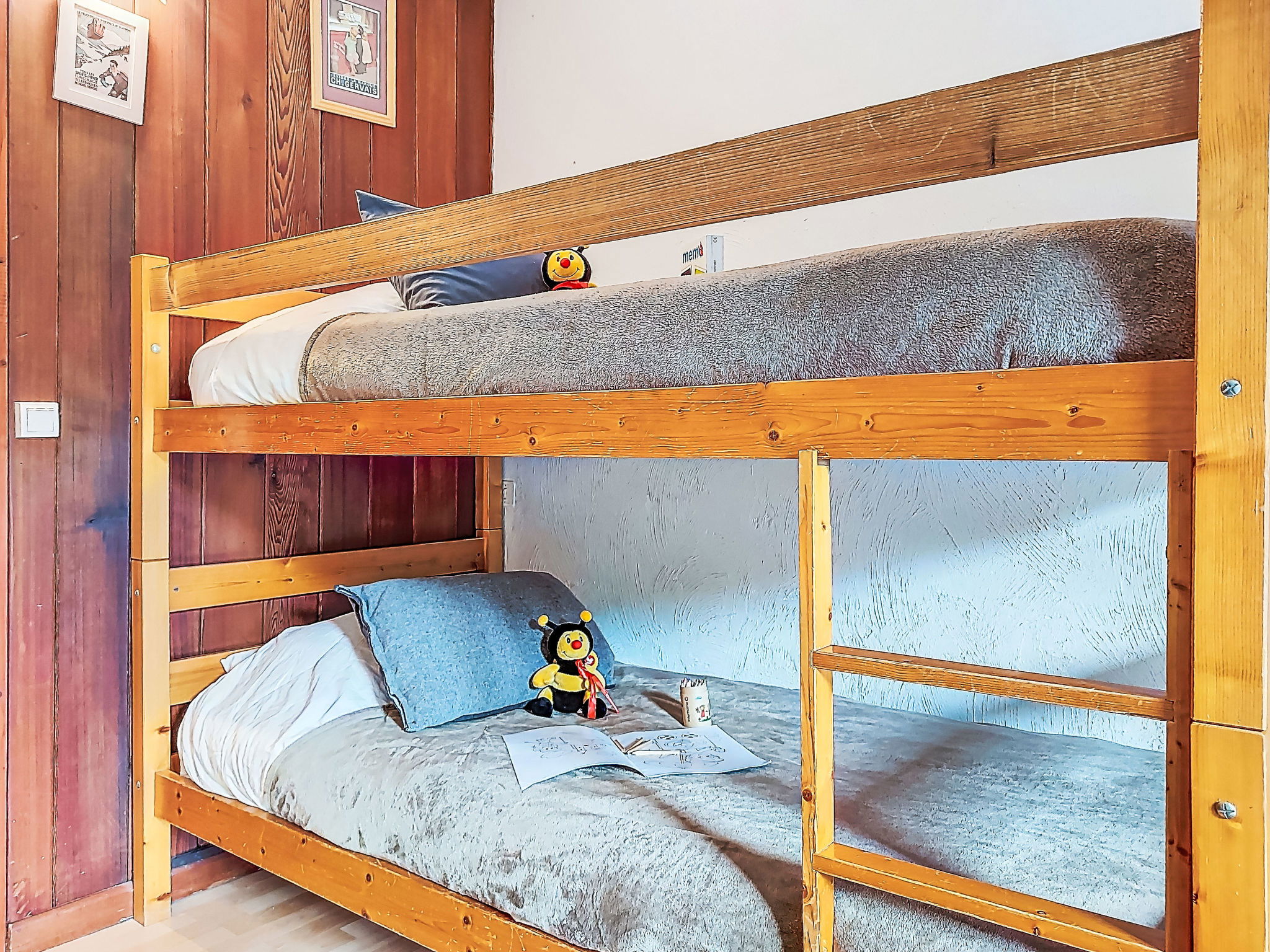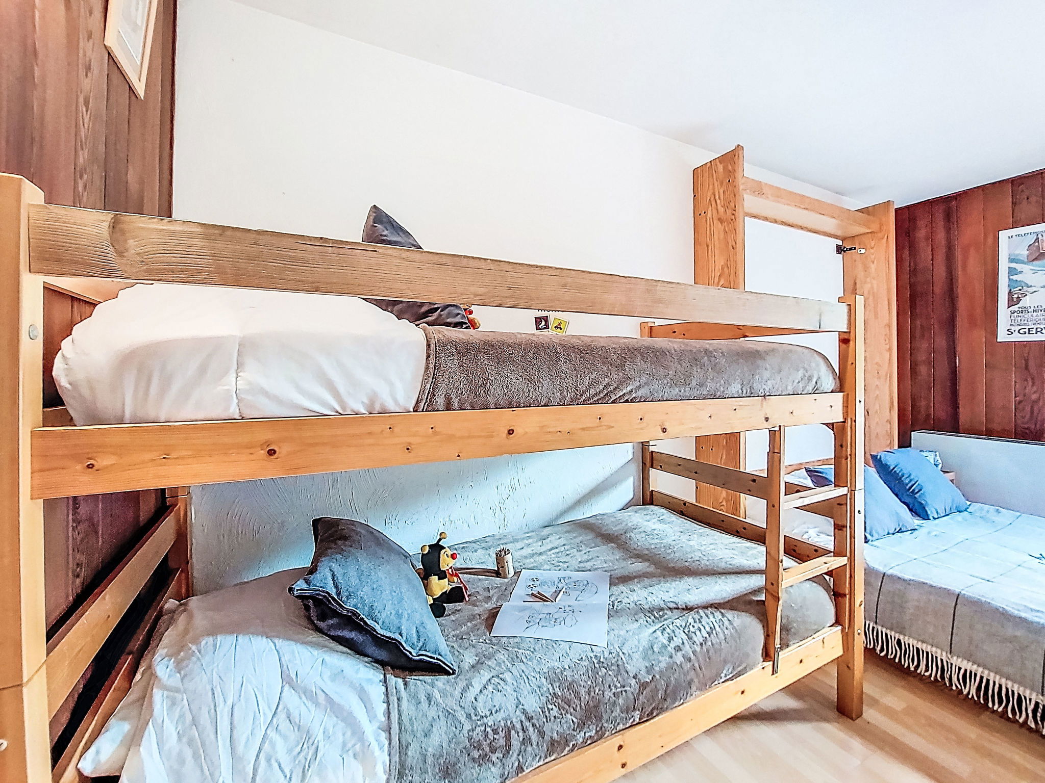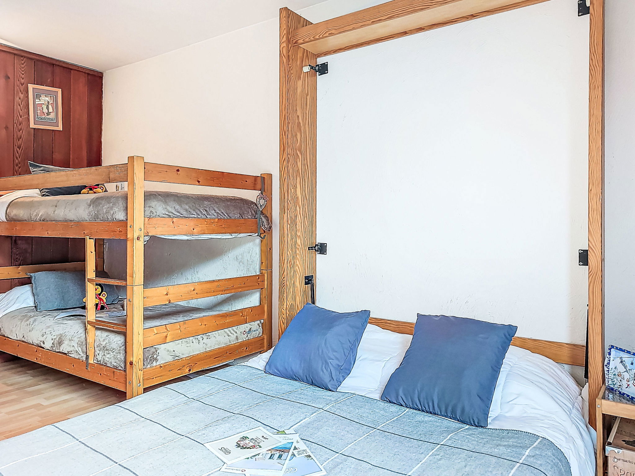 "Le Sporting", 2-room apartment 39 m2. Living/dining room with 1 double sofabed (140 cm), TV. Exit to the terrace, south facing position. 1 room with 1 x 2 bunk beds (90 cm), 1 double wall-trunk bed (140 cm). Exit to the terrace. Kitchenette (oven, 3 induction hot plates, toaster, kettle, electric coffee machine, combination microwave). Bath/WC. Oil heating. Large terrace. Terrace furniture. View of the mountains. Facilities: hair dryer. Internet (WiFi, extra). Parking (roofed, 1 car). Please note: TV only FR. Smoke alarm.