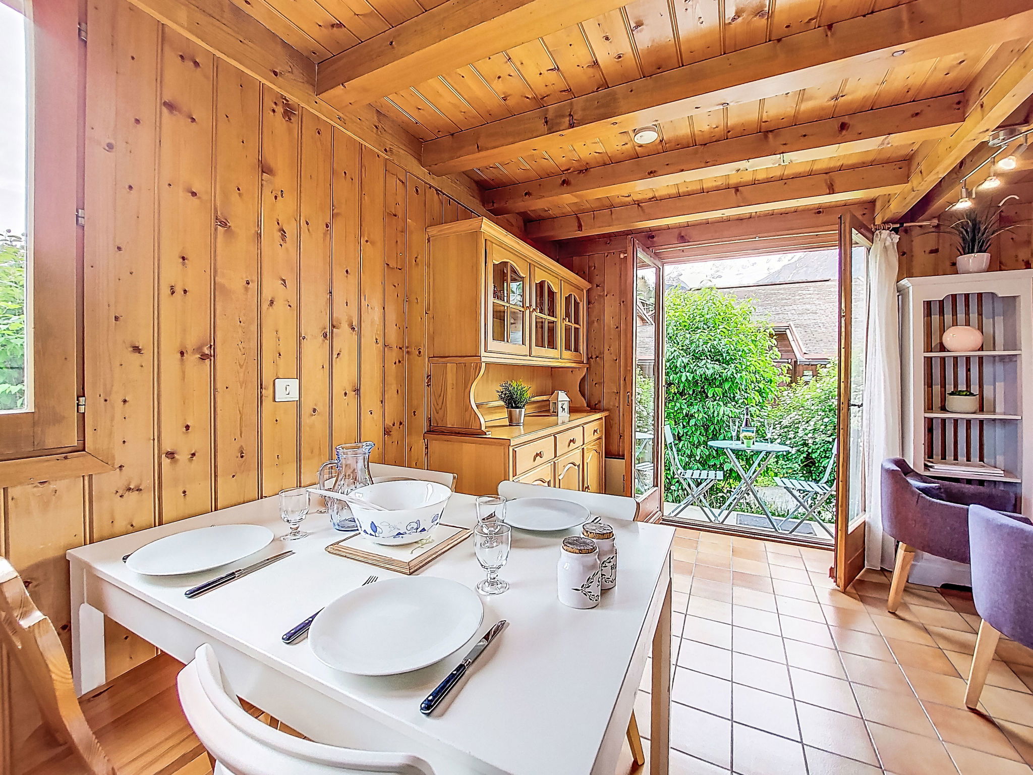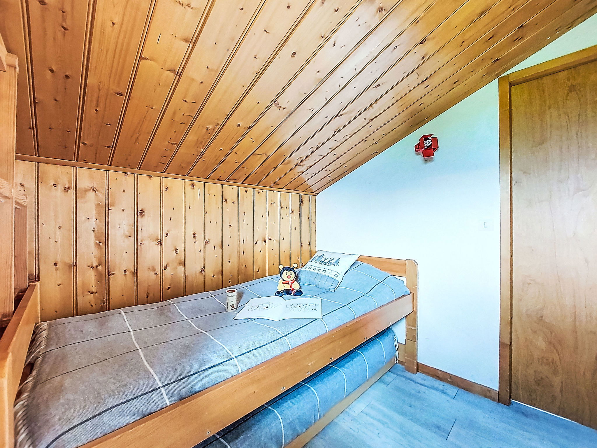 "Les Farfadets", 4-room chalet 41 m2 on 2 levels. Living/dining room. Exit to the terrace, east facing position. 1 room with 1 french bed (140 cm). Open kitchen (oven, dishwasher, 3 induction hot plates, toaster, kettle, freezer, electric coffee machine, raclette grill, combination microwave, fondue Set (cheese)). Bathroom, sep. WC. Upper floor: small lounge with sloping ceilings with TV. 2 rooms with sloping ceilings, each room with 1 bed (90 cm), 1 sleeping facility (90 cm). Electric heating, floor heating. Small terrace 4 m2, east facing position. View of the mountains. Facilities: washing machine. Internet (WiFi, extra). Parking (roofed). Please note: non-smokers only. TV only FR. Smoke alarm. 21 mq additional area lower than 1.80 m. 236N00426T