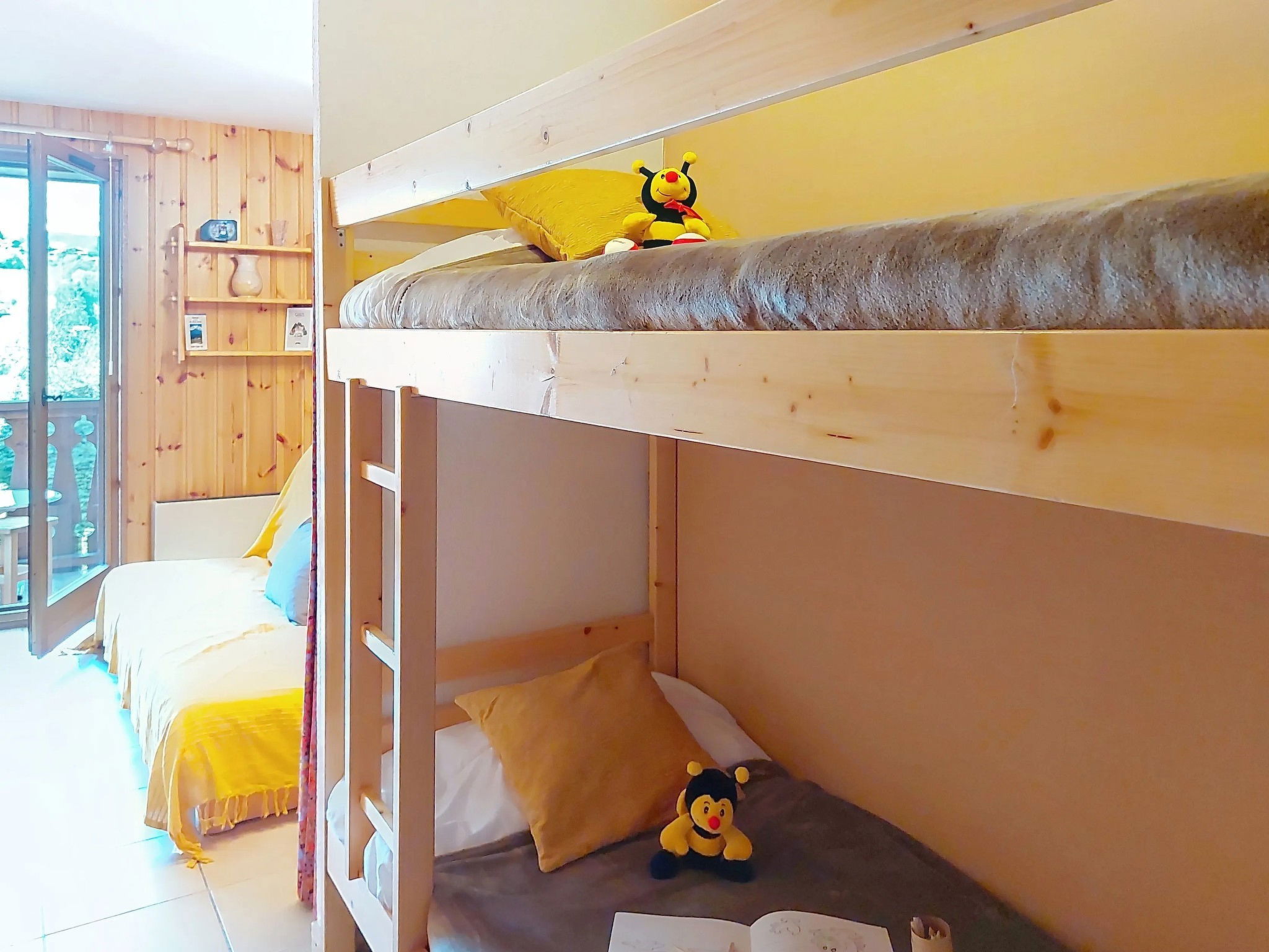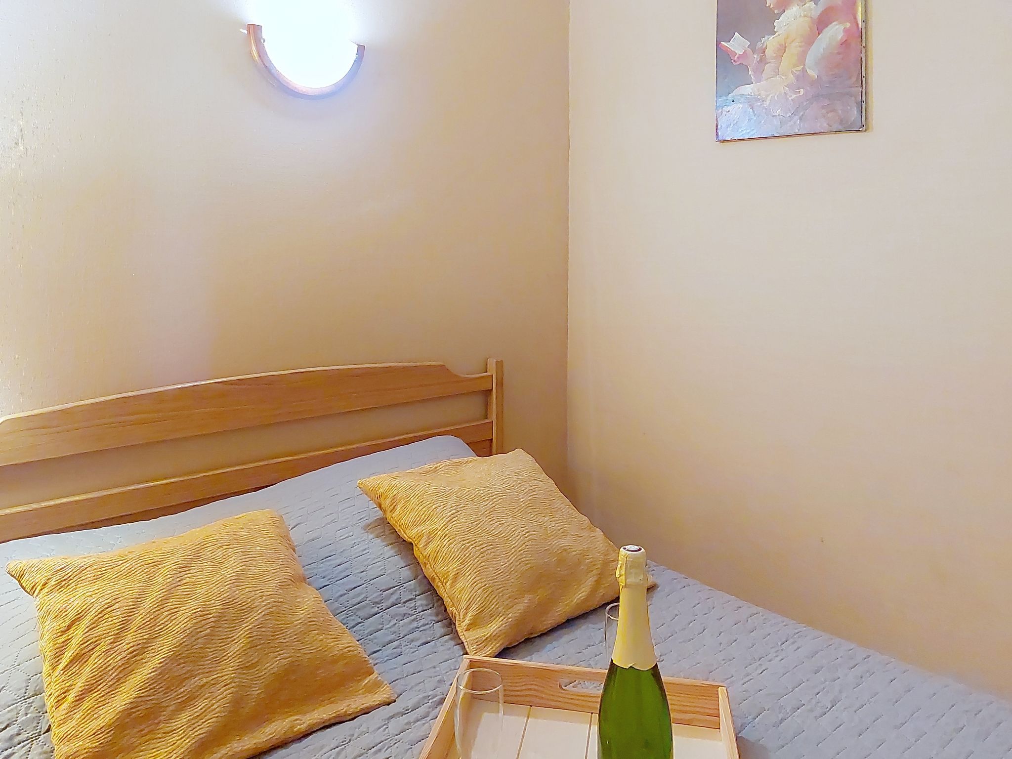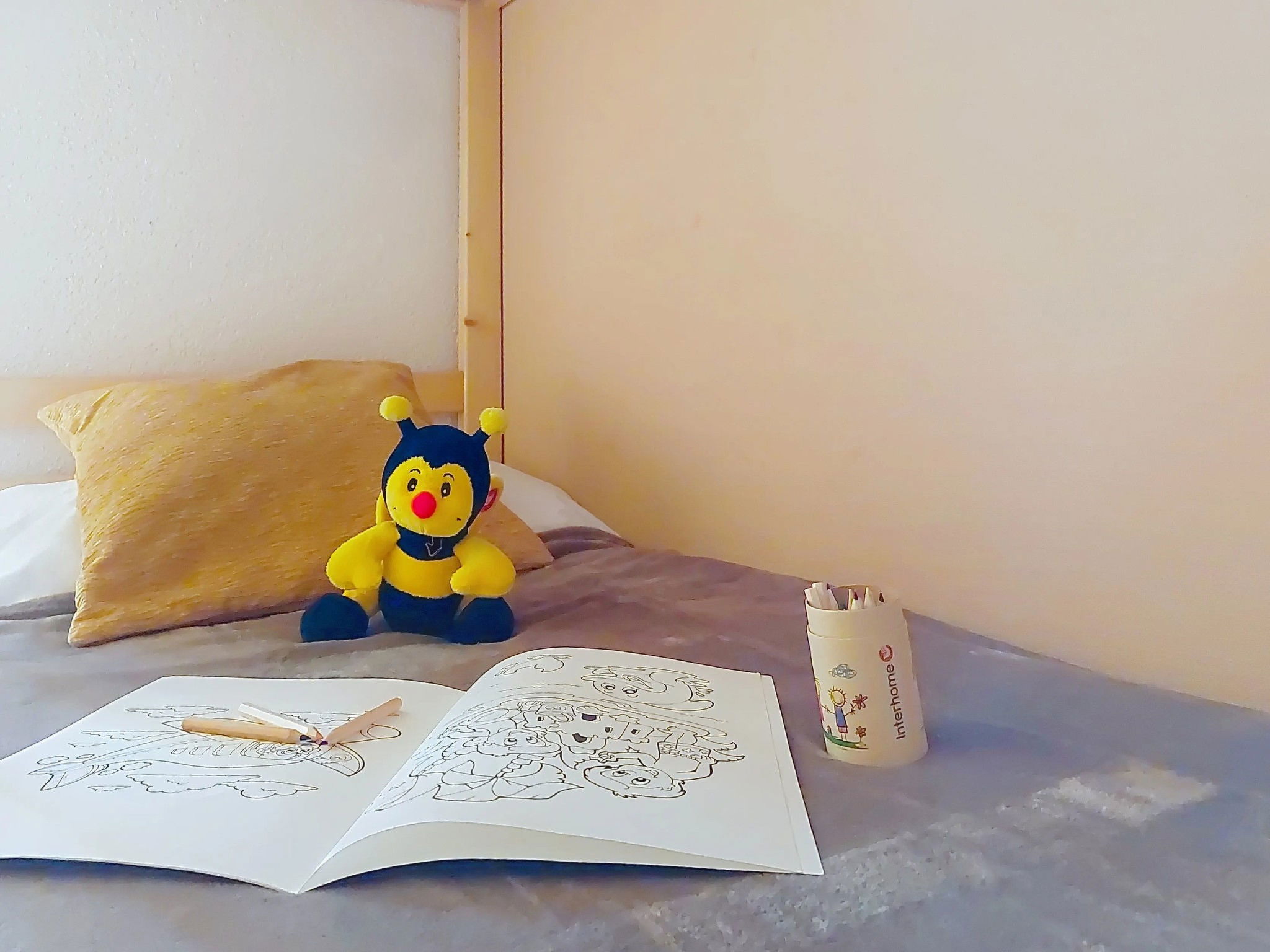 "Isabella", 2-room apartment 31 m2 on 1st floor. Living/dining room with TV and flat screen. Exit to the balcony. 1 room with 1 double bed (130 cm). Alcove with 1 x 2 bunk beds (80 cm). Kitchenette (4 hot plates, mini-oven, dishwasher, toaster, kettle, electric coffee machine) with dining table. Bathroom, sep. WC. Electric heating. Facilities: Internet (WiFi, extra). Please note: non-smokers only. TV only FR. Smoke alarm. Instead of an enclosed bedroom, some sleeping areas are located in an open-plan area (gallery, alcove, etc.).