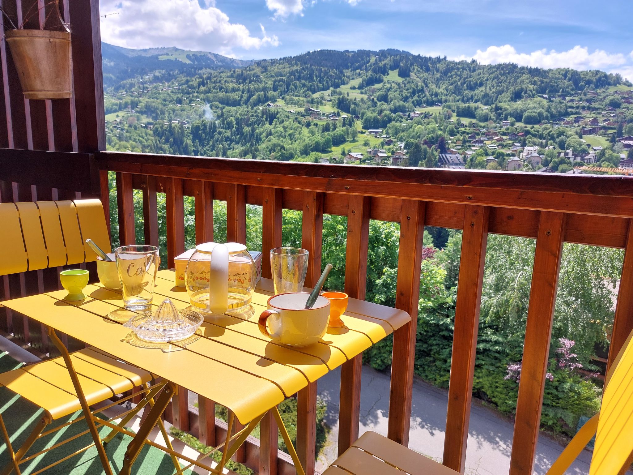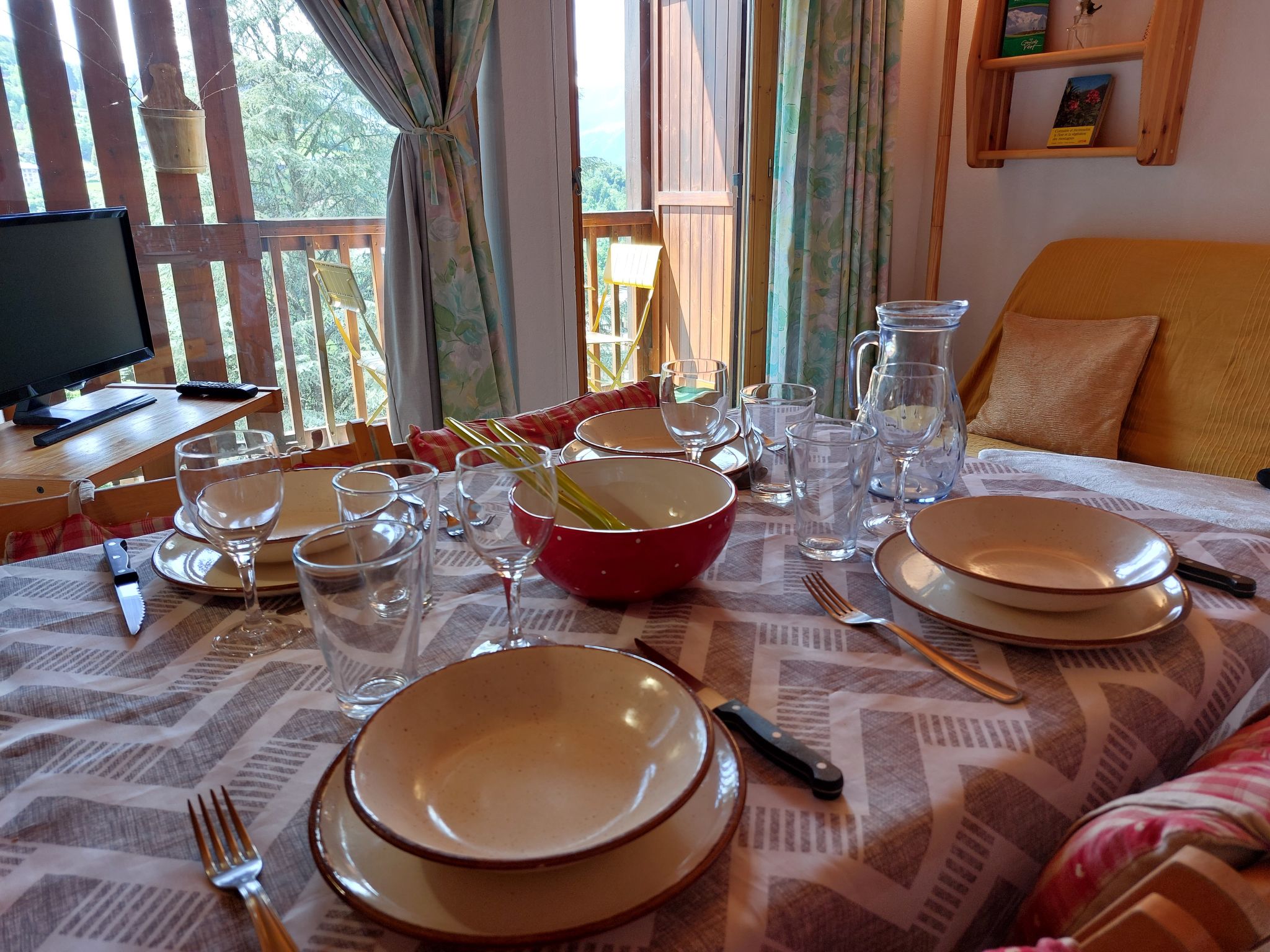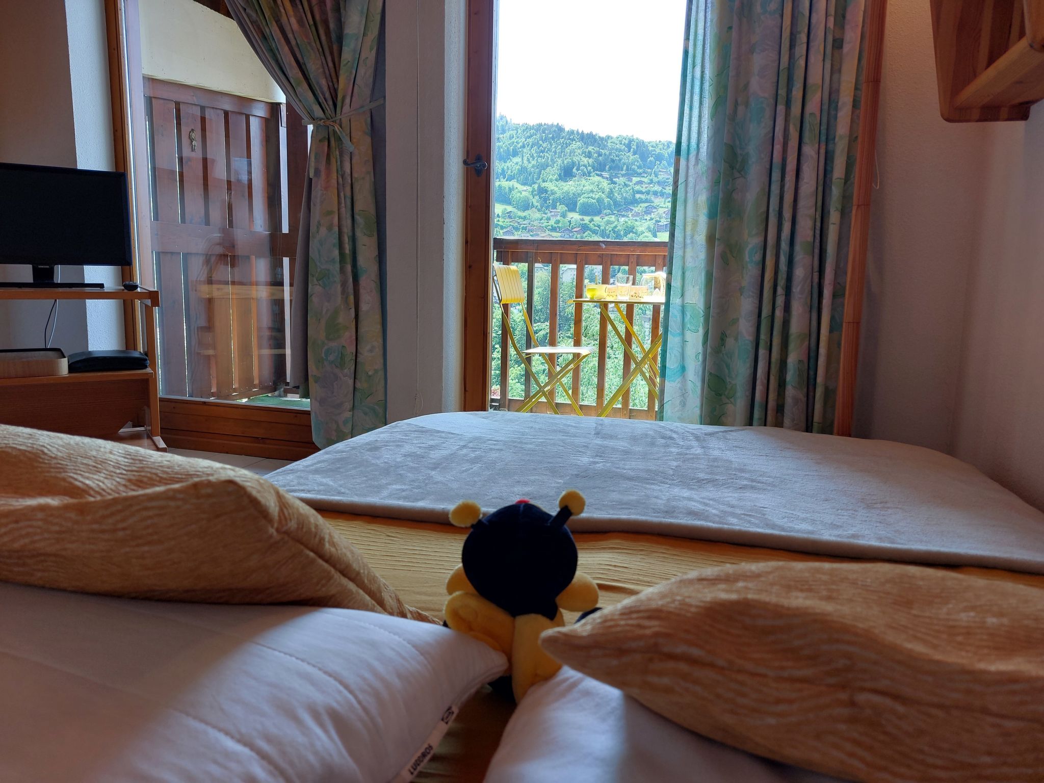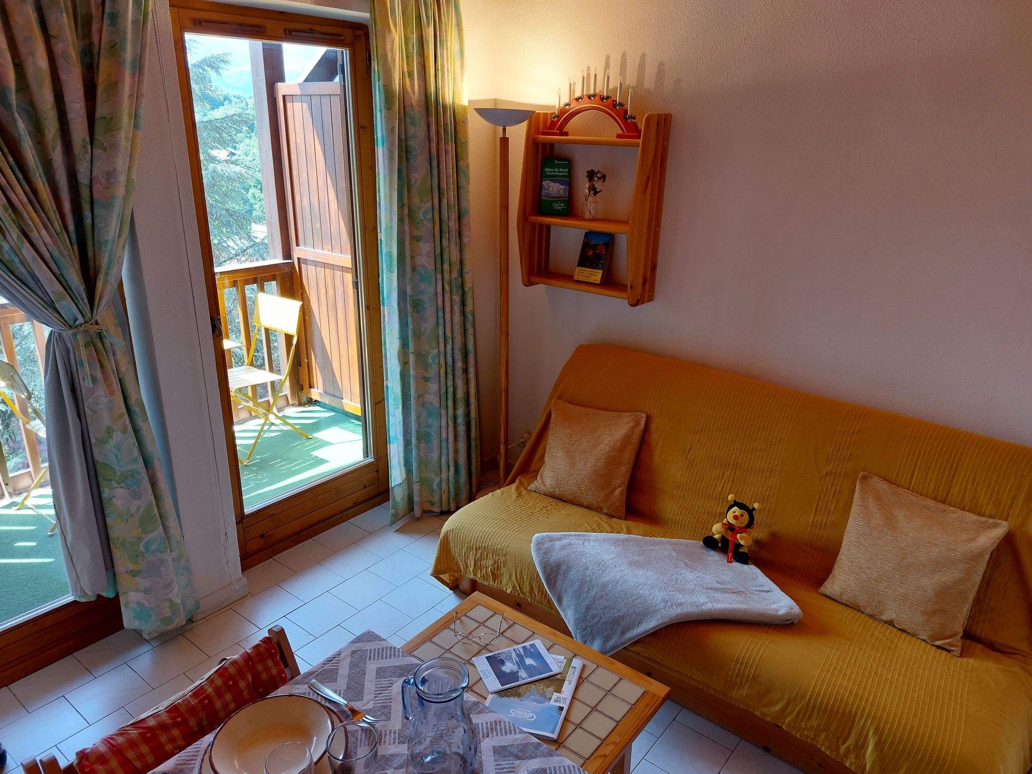 "Martagon", 2-room apartment 25 m2 on 3rd floor. Living/dining room with 1 double sofabed (140 cm), TV and flat screen. Exit to the balcony. 1 small room with 1 x 2 bunk beds (90 cm). Kitchenette (2 hot plates, oven, toaster, kettle, electric coffee machine, raclette grill). Bathroom, sep. WC. Electric heating. Balcony 5 m2, west facing position. Balcony furniture. Beautiful view of the mountains. Facilities: Internet (WiFi, extra). Please note: non-smokers only. TV only FR. Smoke alarm, no lift.
