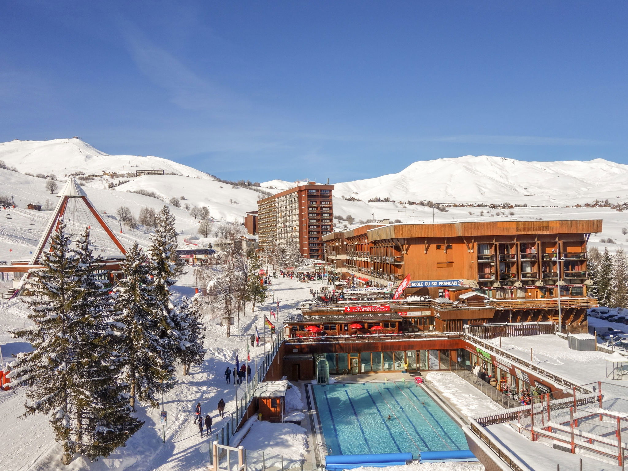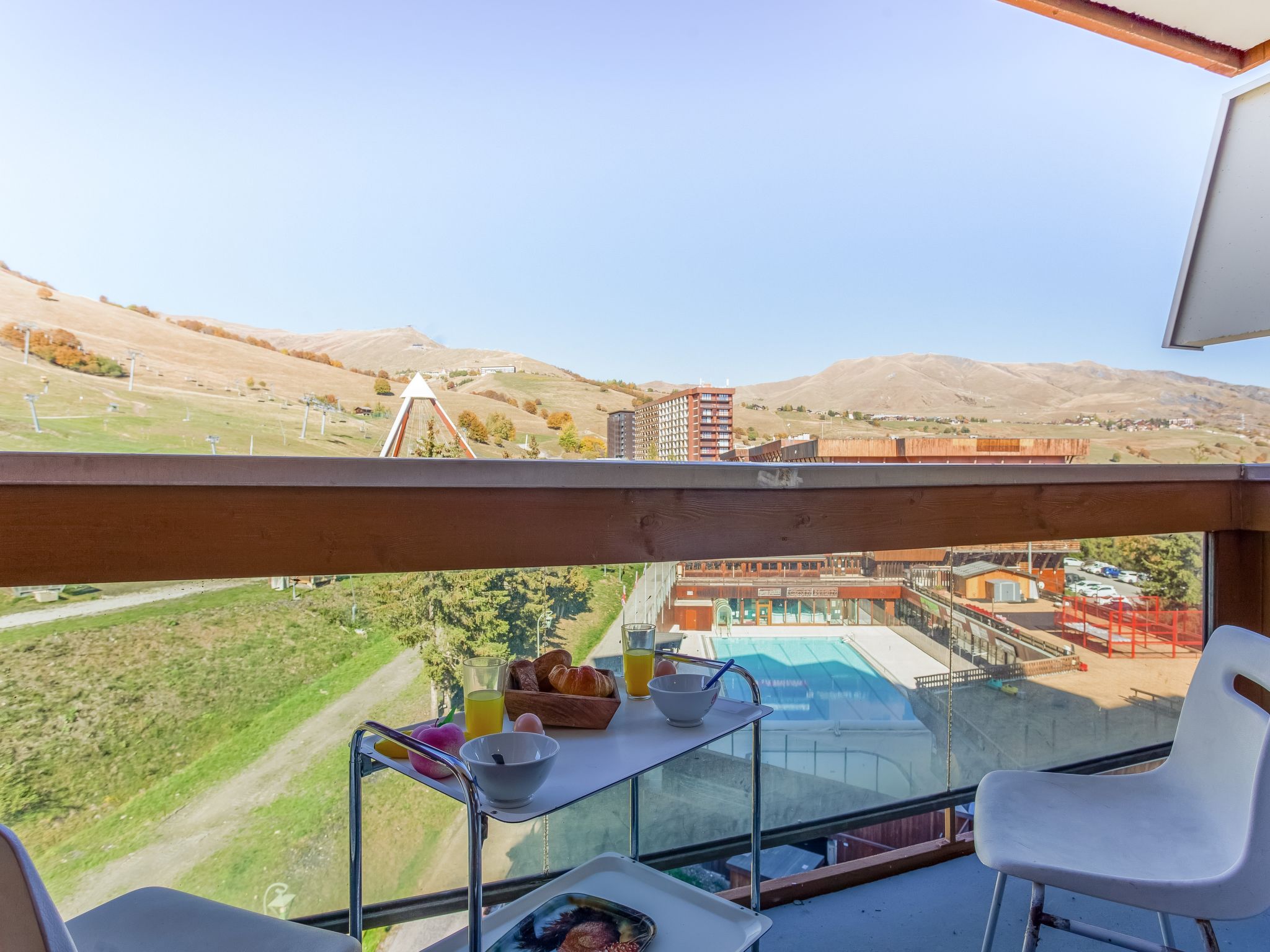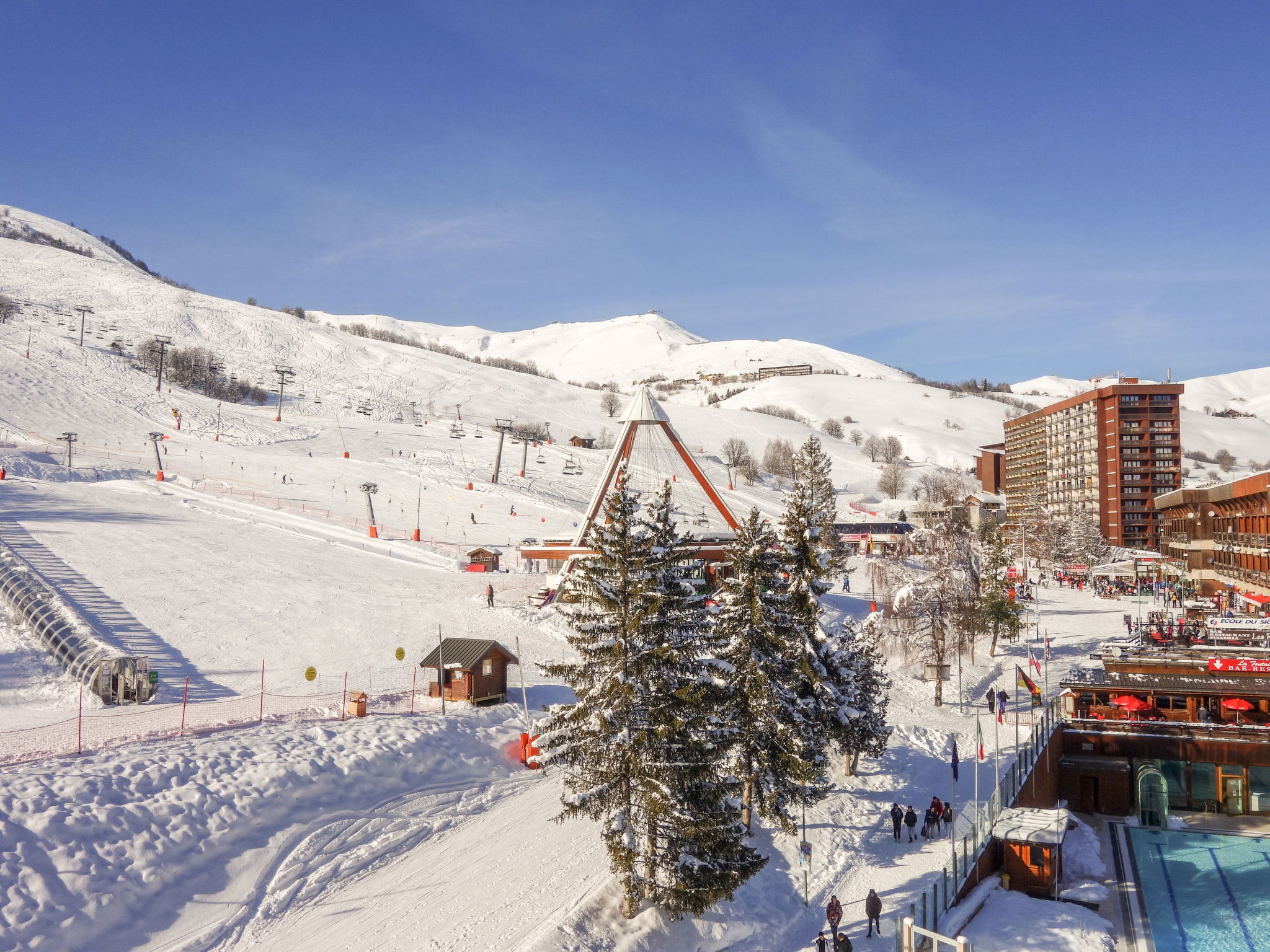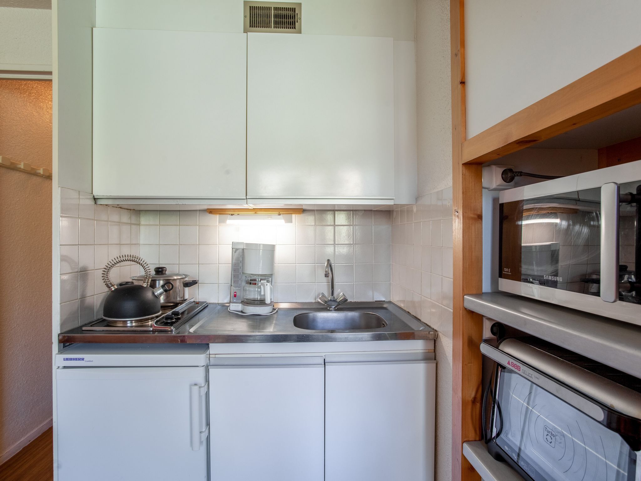 1-room studio 24 m2 on 8th floor, west facing position. Simple furnishings: living/dining room with 1 pull-out bed (2 pers. 2 x 80 cm, length 190 cm), TV (flat screen), radio. Exit to the balcony. Alcove with curtain with 1 french bed (140 cm, length 190 cm). Kitchenette (2 hot plates, oven, microwave, electric coffee machine). Bath/WC. Electric heating. Parquet floors. Balcony 4 m2, west facing position. Very beautiful view of the ski run, the swimming pool and the resort. Facilities: iron, hair dryer. Internet (WiFi, extra). Please note: non-smokers only. Smoke alarm. Instead of an enclosed bedroom, some sleeping areas are located in an open-plan area (gallery, alcove, etc.). Offer by a private individual according to Art. 155, IV of CGI.