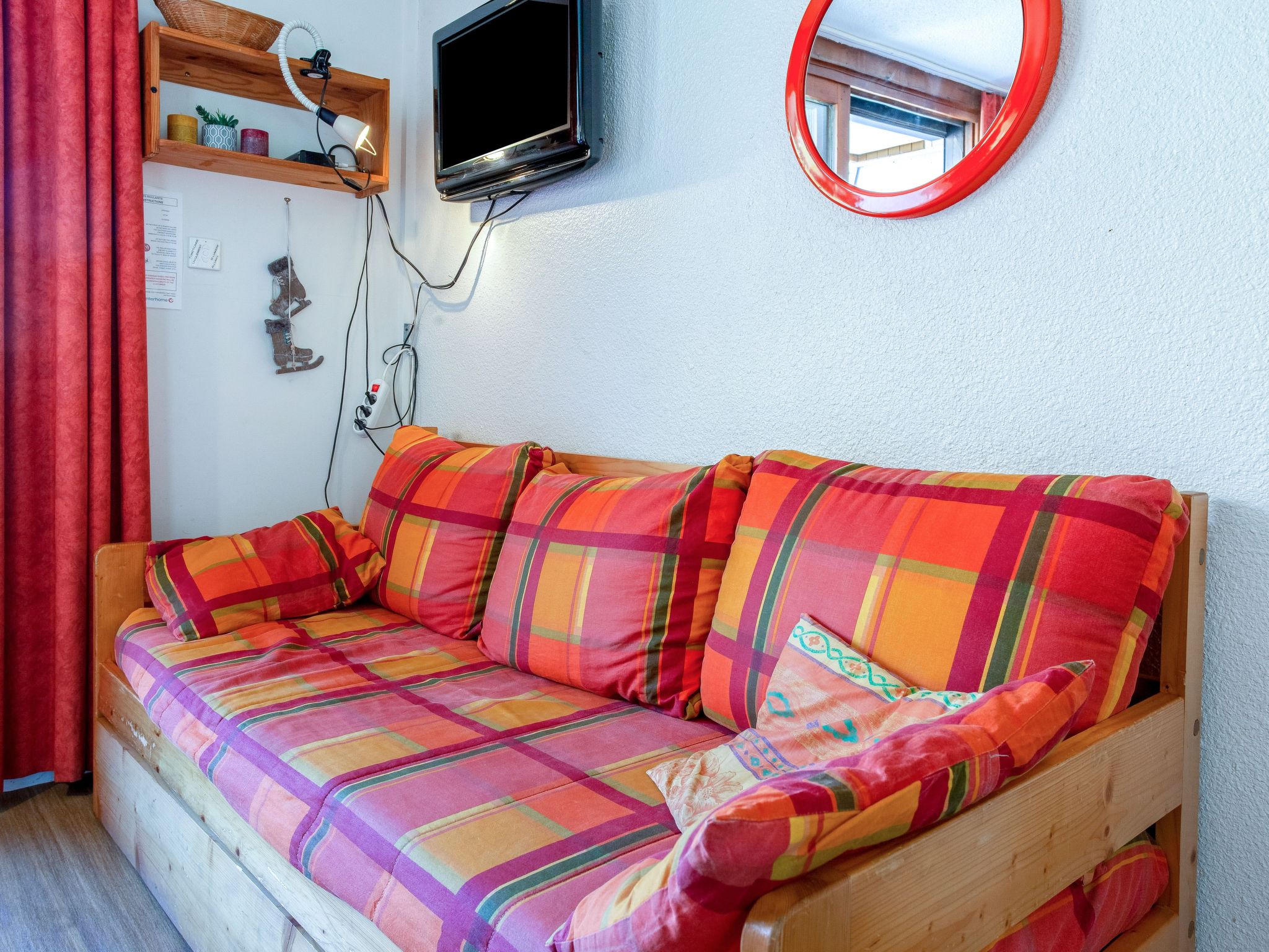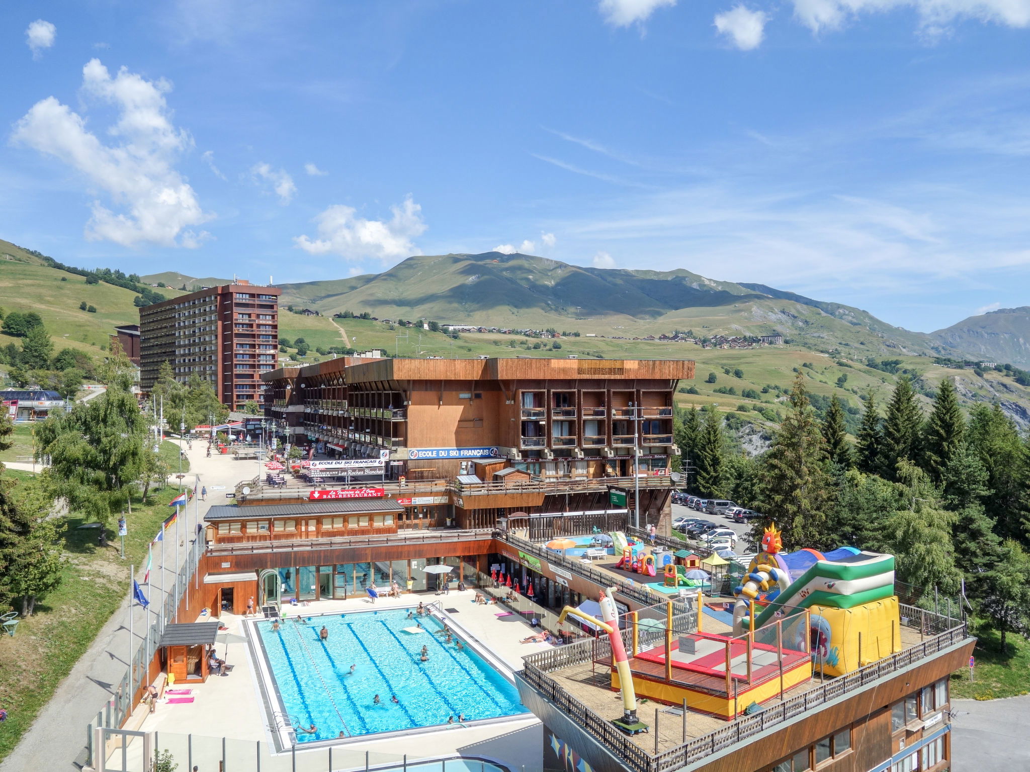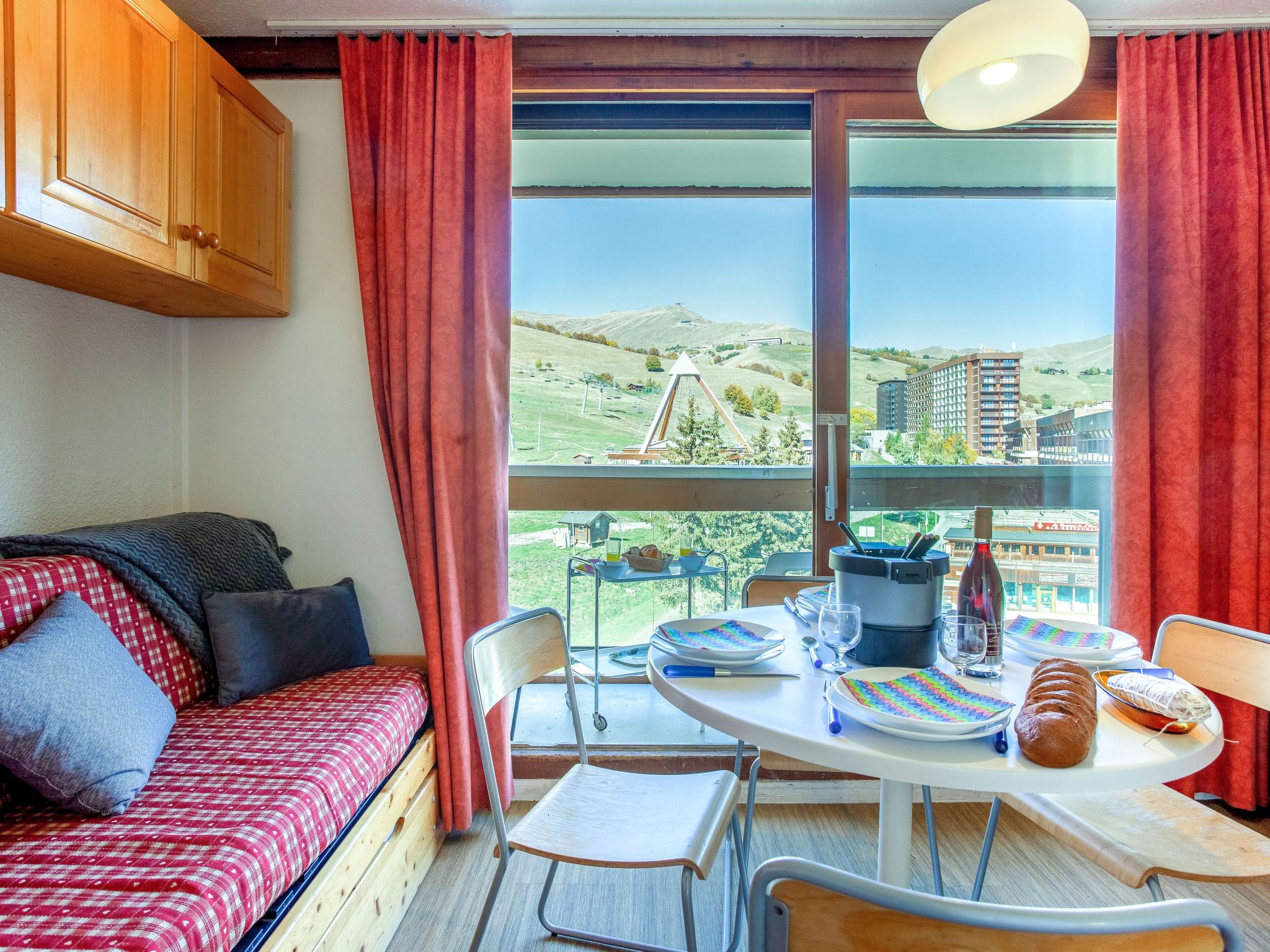 1-room studio 24 m2 on 8th floor, west facing position. Simple furnishings: living/dining room with 1 pull-out bed (2 pers. 2 x 80 cm, length 190 cm), TV (flat screen), radio. Exit to the balcony. Alcove with curtain with 1 french bed (140 cm, length 190 cm). Kitchenette (2 hot plates, oven, microwave, electric coffee machine). Bath/WC. Electric heating. Parquet floors. Balcony 4 m2, west facing position. Very beautiful view of the ski run, the swimming pool and the resort. Facilities: iron, hair dryer. Internet (WiFi, extra). Please note: non-smokers only. Smoke alarm. Instead of an enclosed bedroom, some sleeping areas are located in an open-plan area (gallery, alcove, etc.). Offer by a private individual according to Art. 155, IV of CGI.