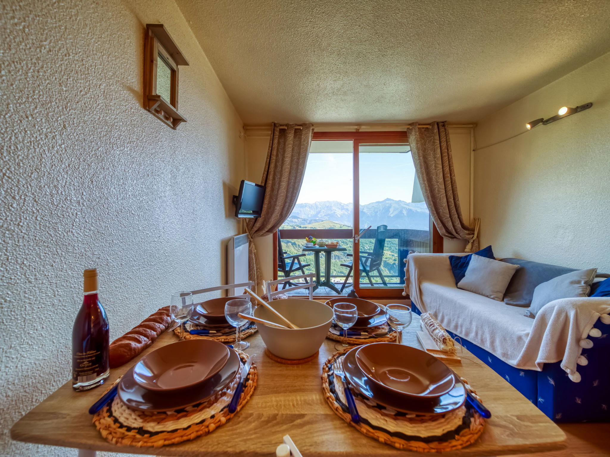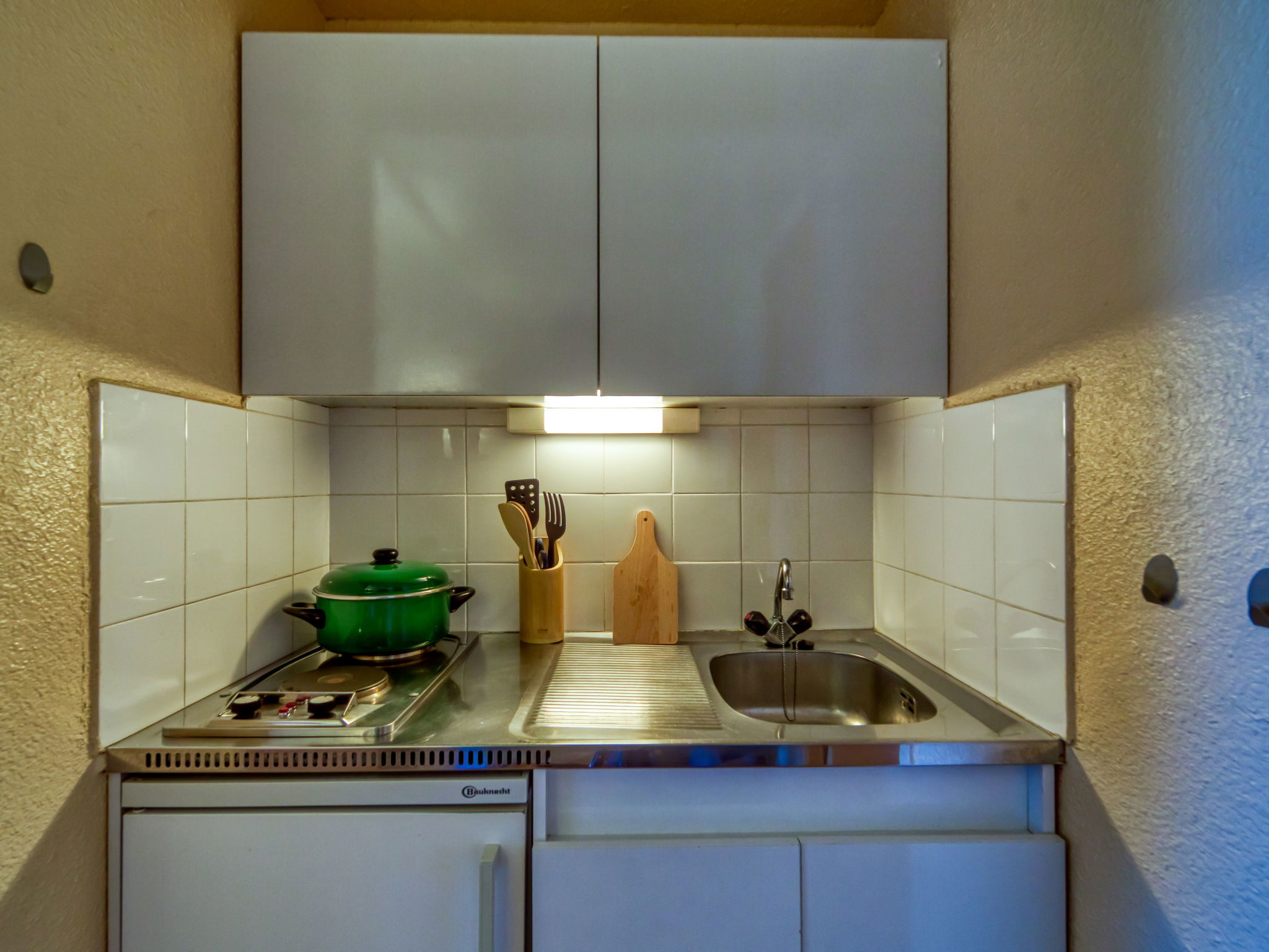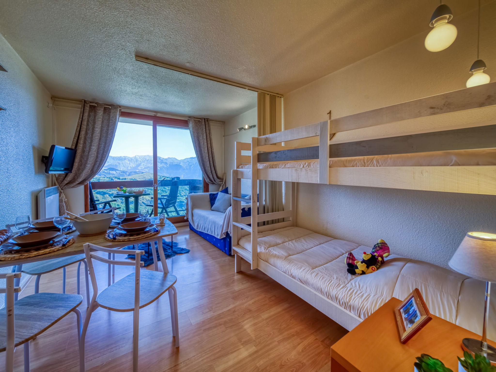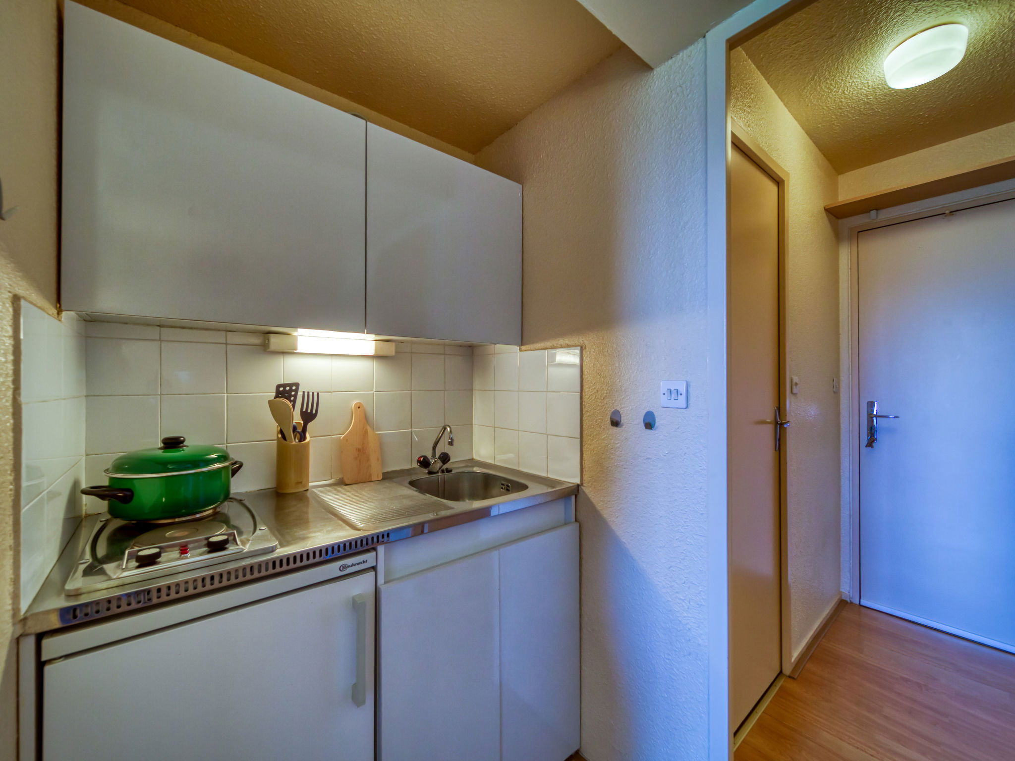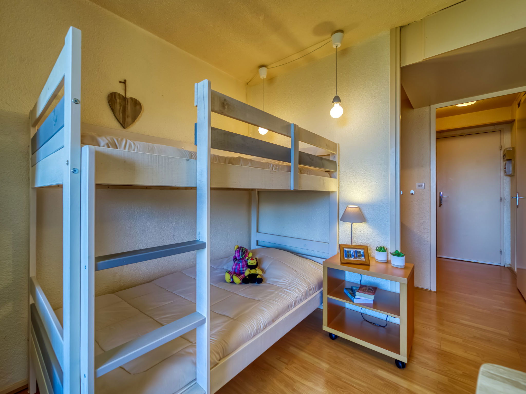 1-room studio 22 m2 on 15th floor, north facing position. Simple and beautiful furnishings: living/dining room with 1 double sofabed (140 cm, length 190 cm), 1 x 2 bunk beds (90 cm, length 190 cm), TV (flat screen). Small kitchenette (2 hot plates, oven, toaster, kettle, microwave, electric coffee machine, raclette grill). Bath/WC. Electric heating. Parquet floors. Balcony 4 m2, north facing position. Balcony furniture. View of the mountains and the valley. Facilities: Internet (WiFi, extra). Please note: non-smokers only. Smoke alarm. Offer by a private individual according to Art. 155, IV of CGI.