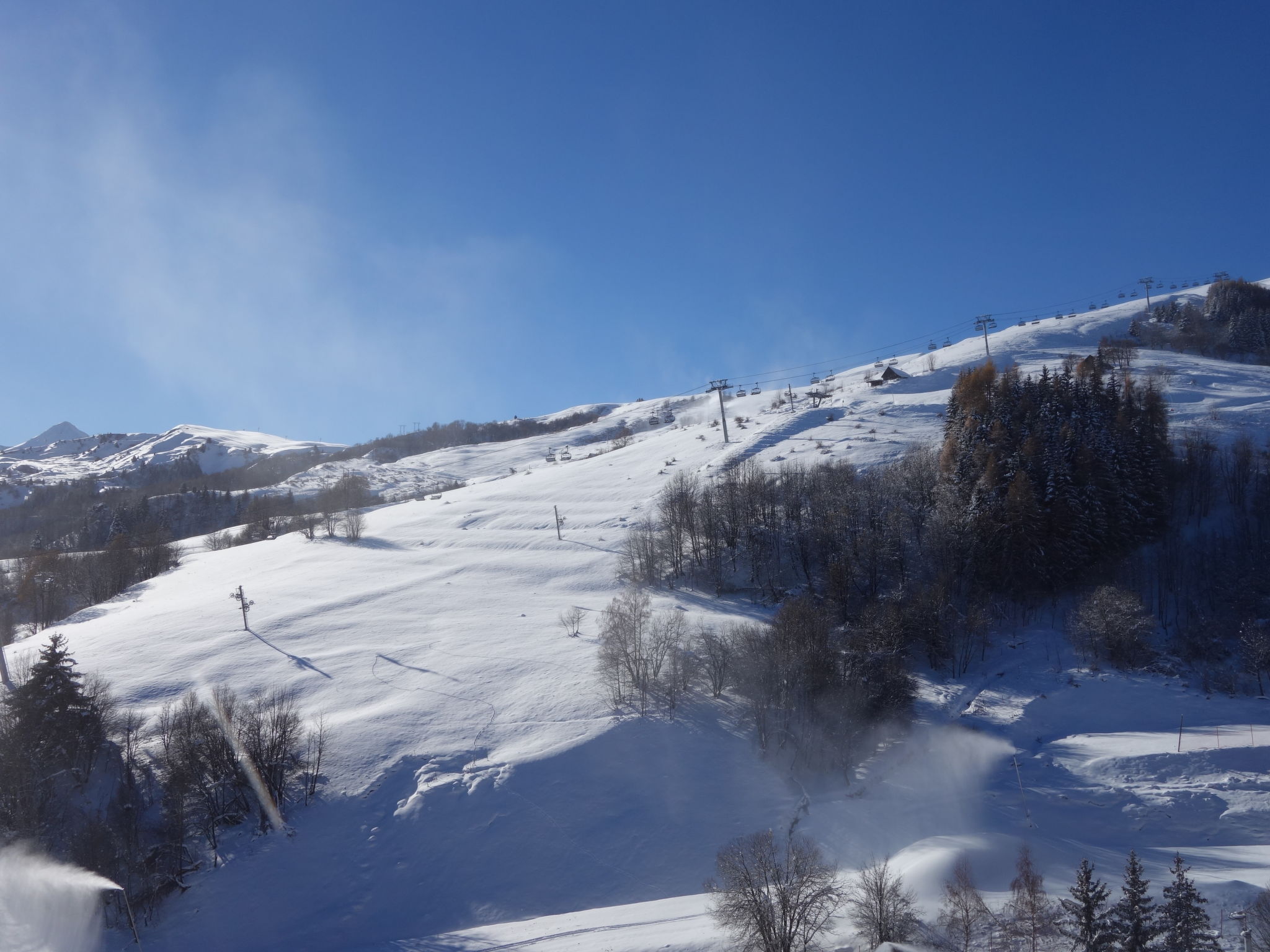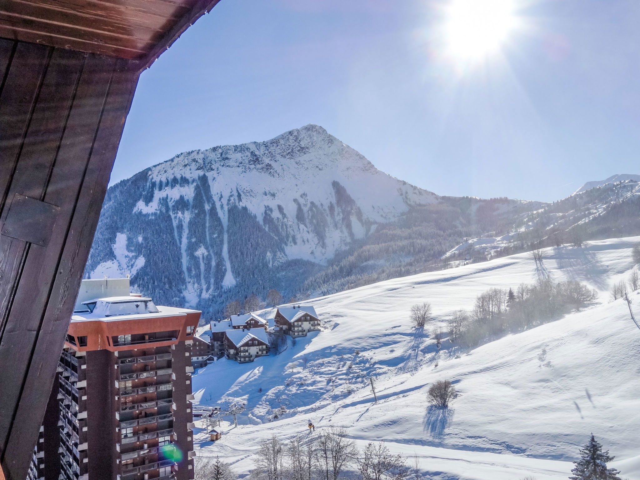 3-room apartment 46 m2 on 18th floor, south facing position. Fully renovated in 2024, beautiful and cosy furnishings: living/dining room with 1 sofabed (130 cm, length 190 cm), TV (flat screen). Exit to the balcony, south facing position. 1 room with 1 french bed (140 cm, length 190 cm). Exit to the balcony, south facing position. 1 room with 1 french bed (140 cm, length 190 cm), hand-basin, shower/WC and TV (flat screen). Exit to the balcony, west facing position. Small sleeping alcove with sliding door with 1 x 2 bunk beds (90 cm, length 190 cm). Small kitchen (mini-oven, dishwasher, 2 ceramic glass hob hotplates, toaster, kettle, microwave, electric coffee machine, Capsules for coffee machine (SENSEO) extra, raclette grill). Shower/WC. Electric heating. Parquet floors. Balcony 6 m2, south facing position balcony 4 m2, west facing position. Deck chairs (1). Beautiful view of the ski run. Facilities: washing machine, baby cot for up to 2 year olds, hair dryer. Internet (WiFi, extra). Please note: non-smokers only. Maximum 1 pet/ dog allowed. Smoke alarm. Instead of an enclosed bedroom, some sleeping areas are located in an open-plan area (gallery, alcove, etc.). Offer by a private individual according to Art. 155, IV of CGI.