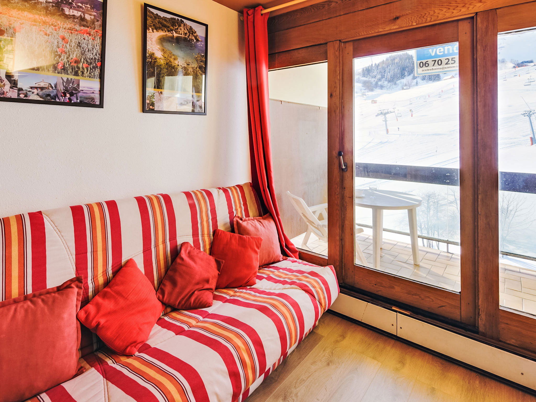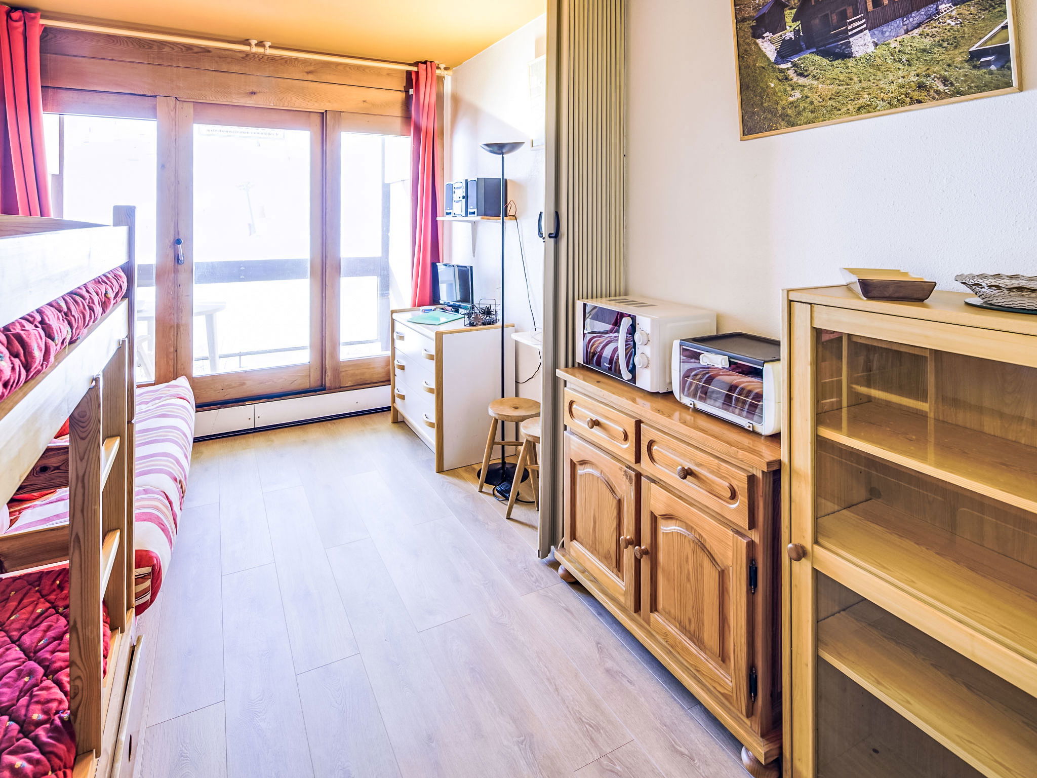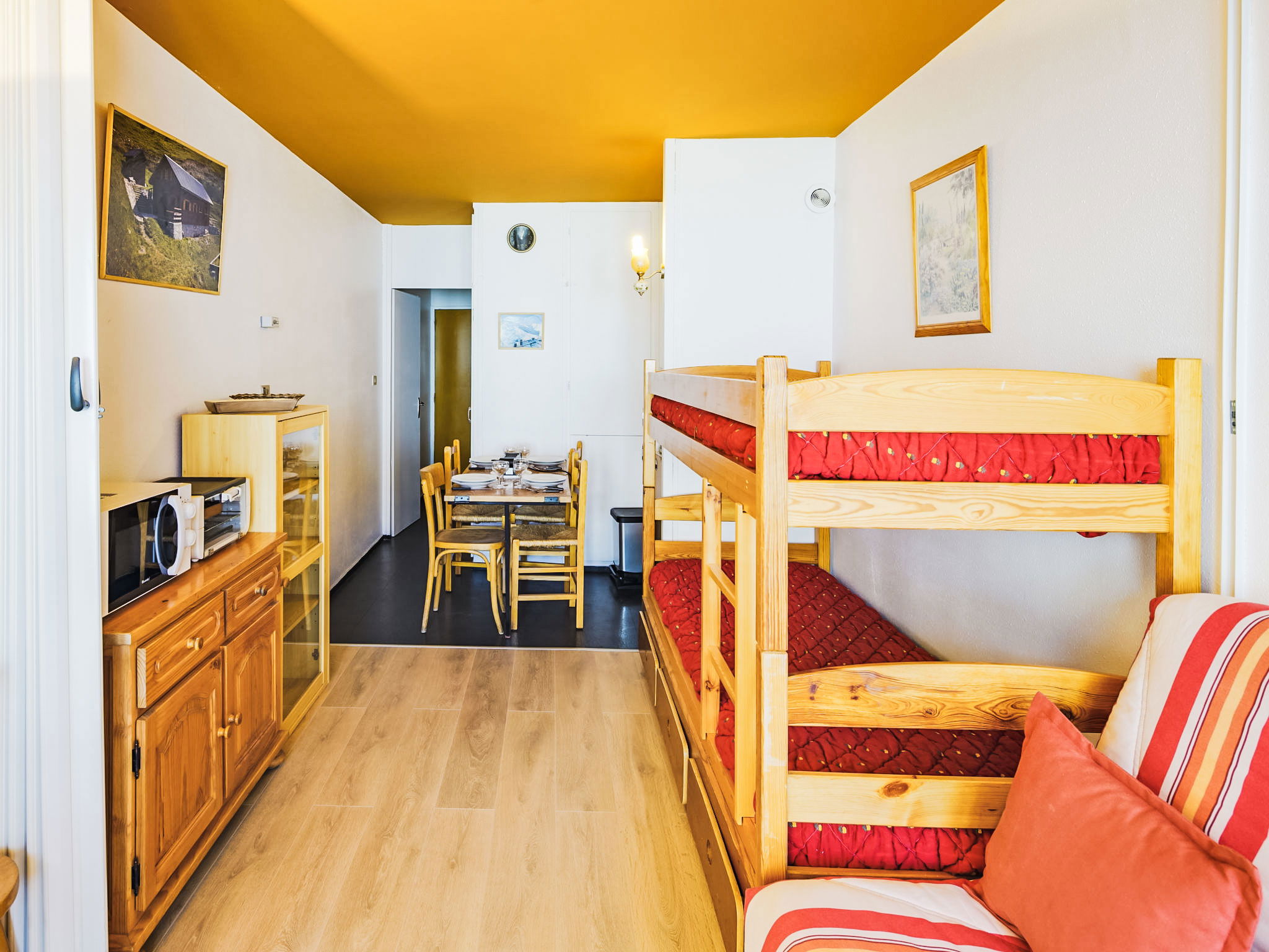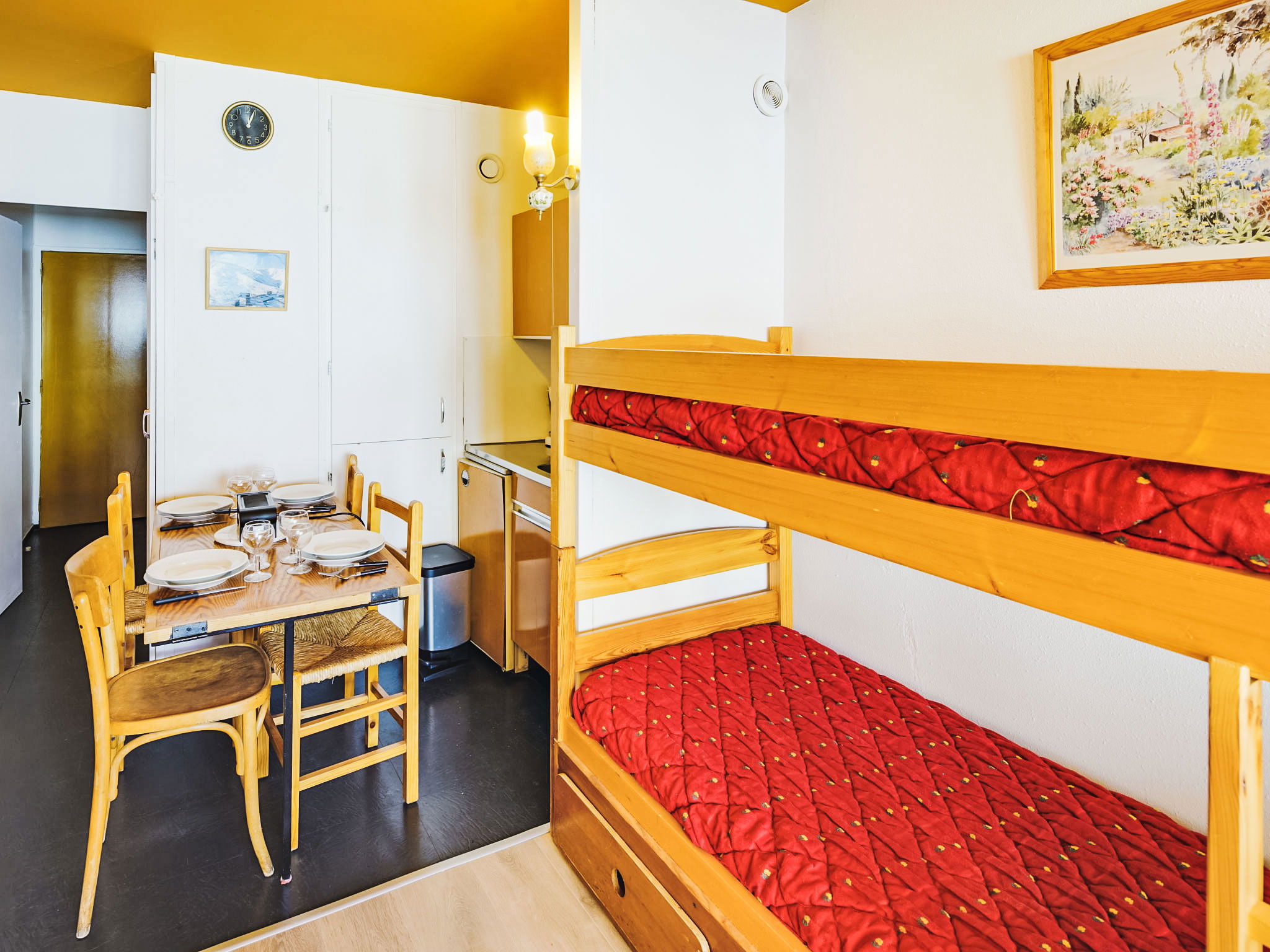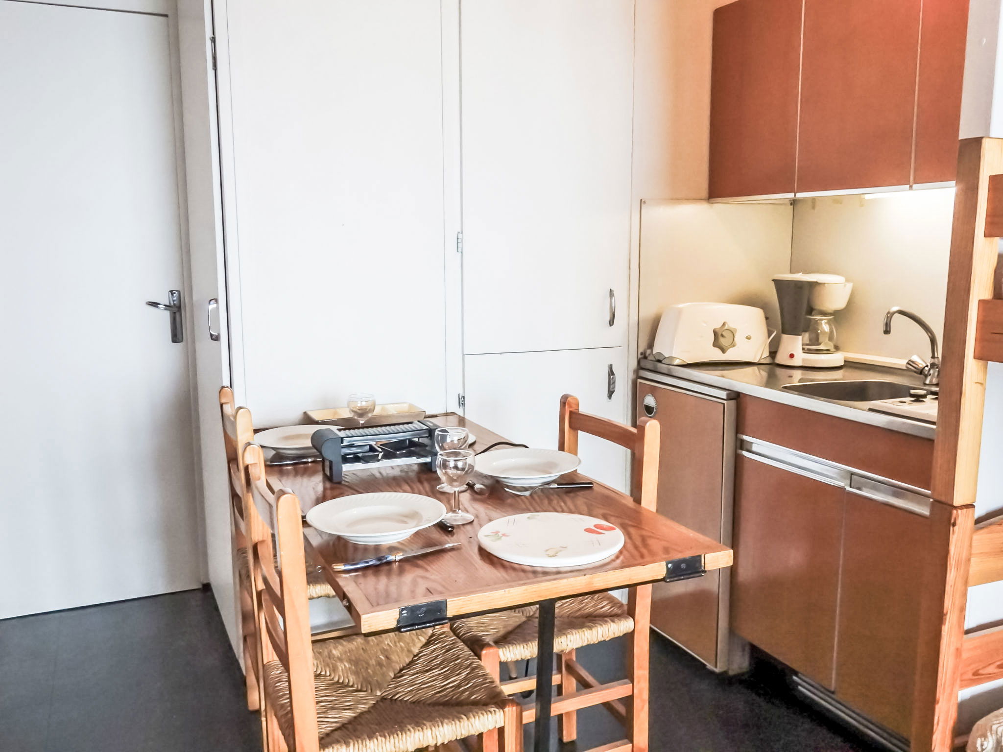 1-room studio 23 m2 on 5th floor, south facing position. Simple furnishings: living/sleeping room with 1 double sofabed (130 cm, length 190 cm), 1 x 2 bunk beds (80 cm, length 190 cm), TV (flat screen), hi-fi system. Exit to the balcony. Kitchenette (2 hot plates, mini-oven, toaster, kettle, microwave, electric coffee machine, raclette grill, fondue Set (cheese)). Bath/WC. Electric heating. Parquet floors. Balcony 5 m2, south facing position. Balcony furniture. Very beautiful view of the mountains and the ski run. Facilities: iron, hair dryer. Internet (WiFi, extra). Please note: non-smokers only. Smoke alarm. Offer by a private individual according to Art. 155, IV of CGI.