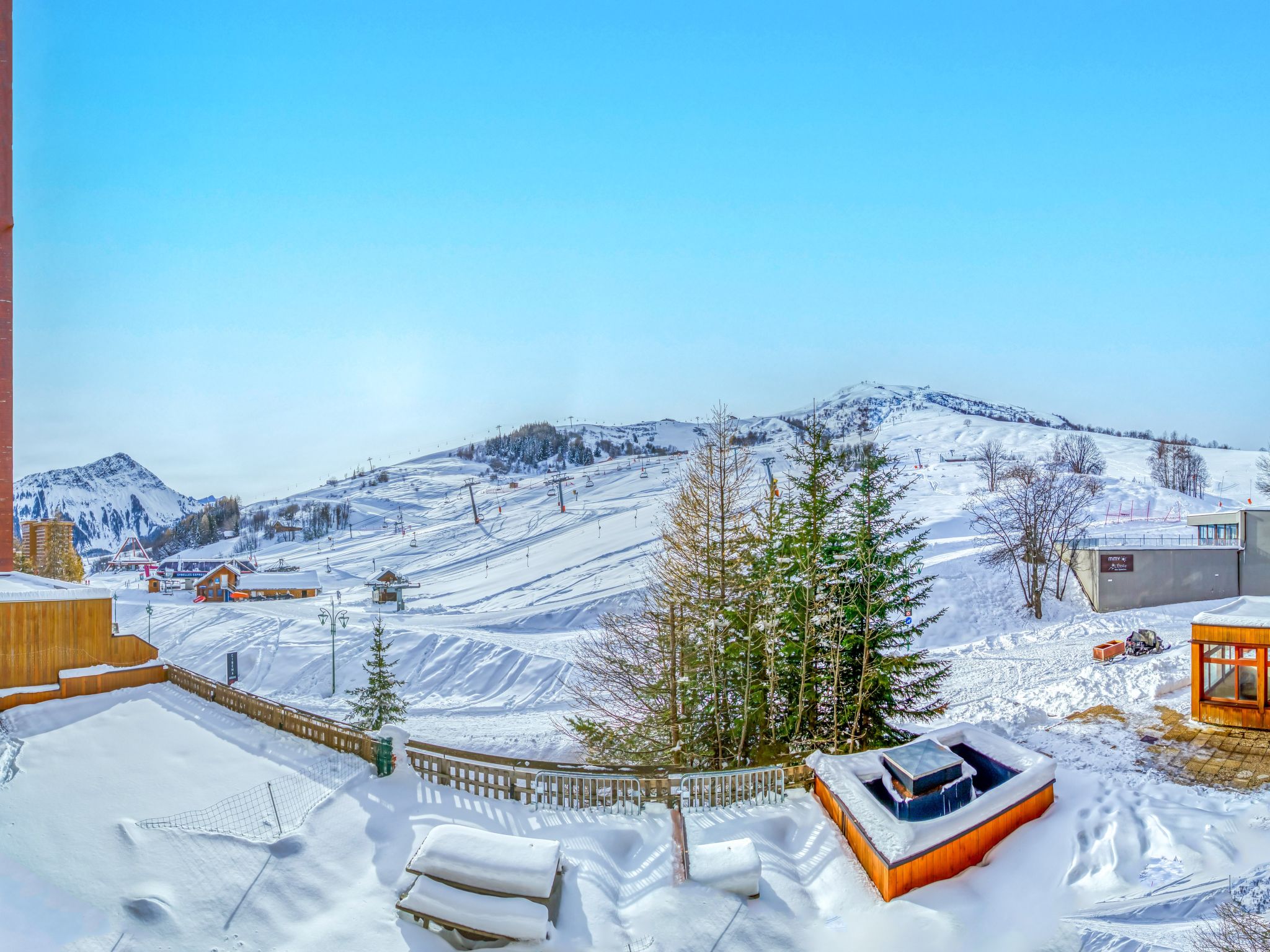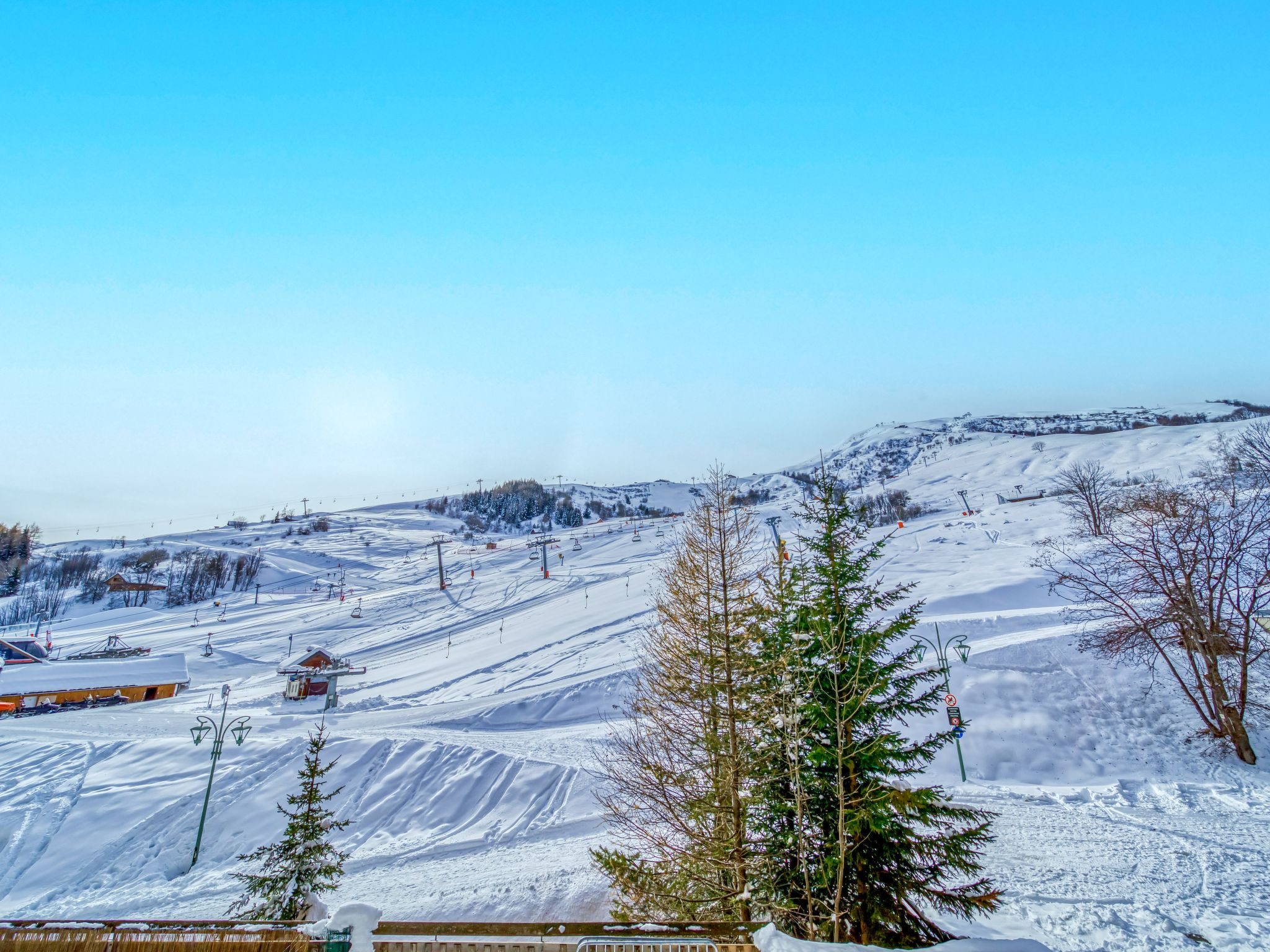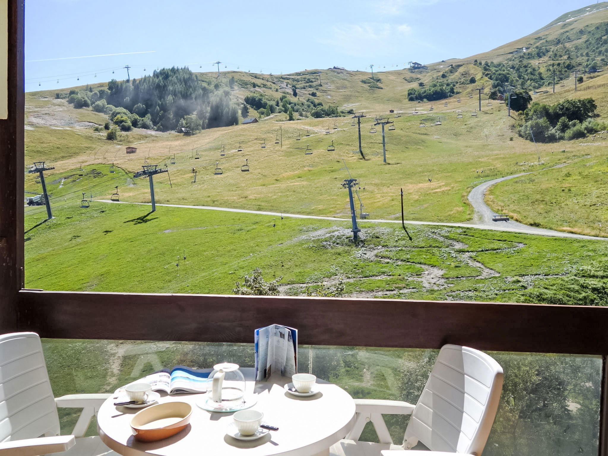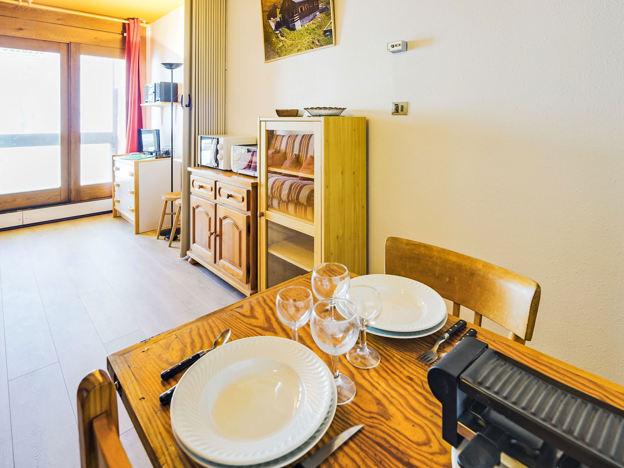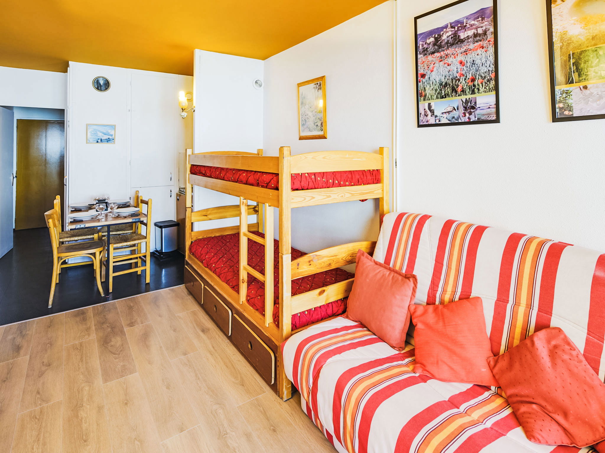1-room studio 23 m2 on 5th floor, south facing position. Simple furnishings: living/sleeping room with 1 double sofabed (130 cm, length 190 cm), 1 x 2 bunk beds (80 cm, length 190 cm), TV (flat screen), hi-fi system. Exit to the balcony. Kitchenette (2 hot plates, mini-oven, toaster, kettle, microwave, electric coffee machine, raclette grill, fondue Set (cheese)). Bath/WC. Electric heating. Parquet floors. Balcony 5 m2, south facing position. Balcony furniture. Very beautiful view of the mountains and the ski run. Facilities: iron, hair dryer. Internet (WiFi, extra). Please note: non-smokers only. Smoke alarm. Offer by a private individual according to Art. 155, IV of CGI.