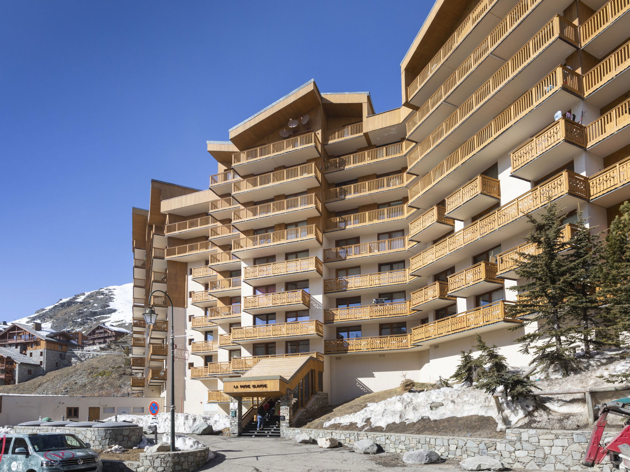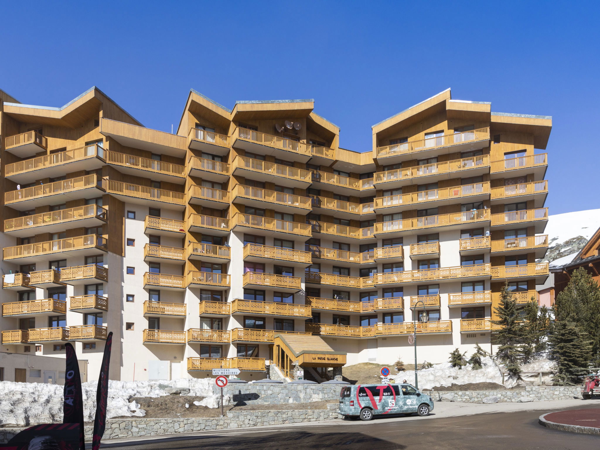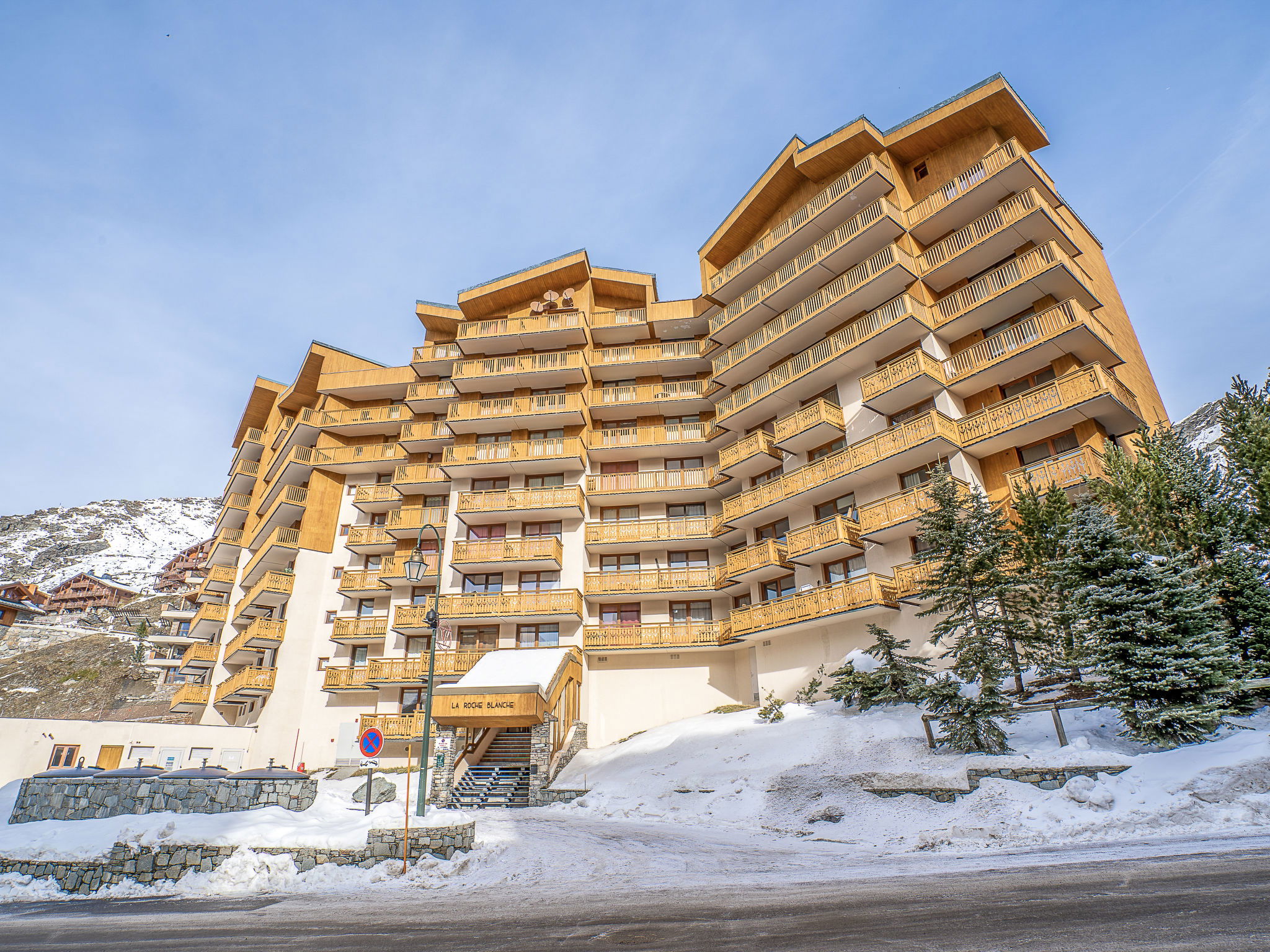 Residence "La Roche Blanche". In the centre of Val Thorens, in a central position, 50 m from the skiing area. In the complex: lift. In Winter: please take snow chains. Public car park at 250 m, extra. Shop 100 m, grocery 50 m, supermarket, shopping centre 100 m, restaurant, bar 50 m, bakery 400 m, café, pedestrian zone 50 m, 2 minute walk to the centre, bus stop 550 m, outdoor swimming pool 100 m. Sports centre 400 m, chair lift 100 m, ski bus stop 25 m, ski school 10 m, ice rink 100 m. Nearby attractions: bowling 10 m. Please note: baby equipment on request (extra). Additional accommodations can be booked. Neighbourhood highly sensitive to noise. Quietness and good behaviour expected.