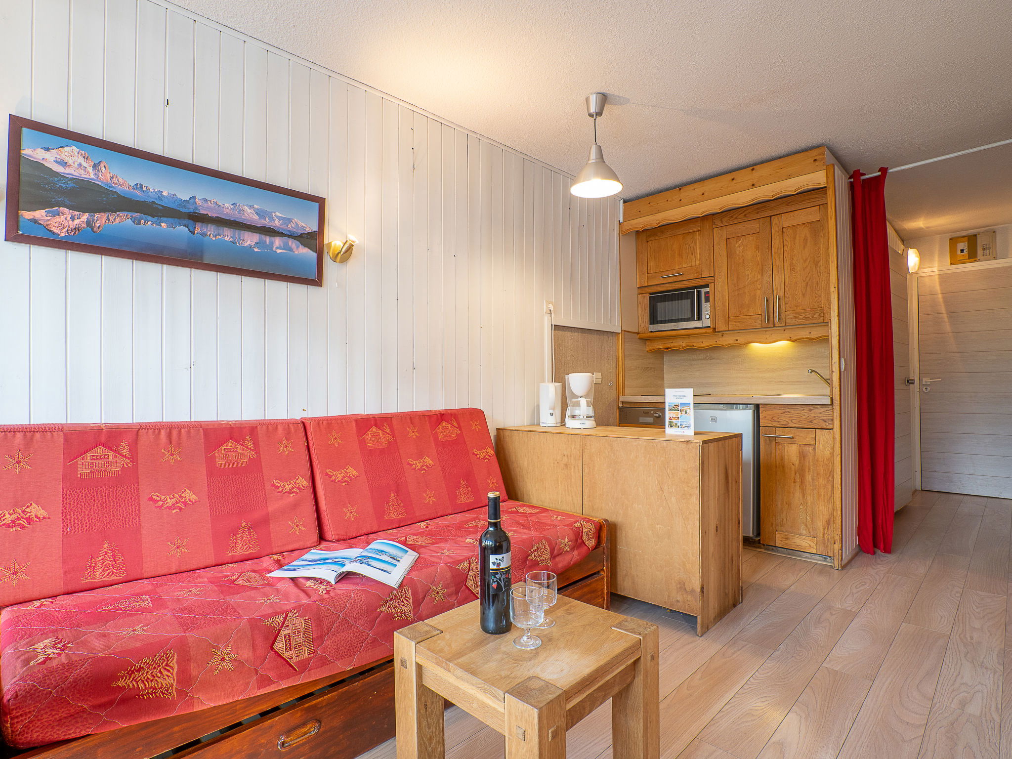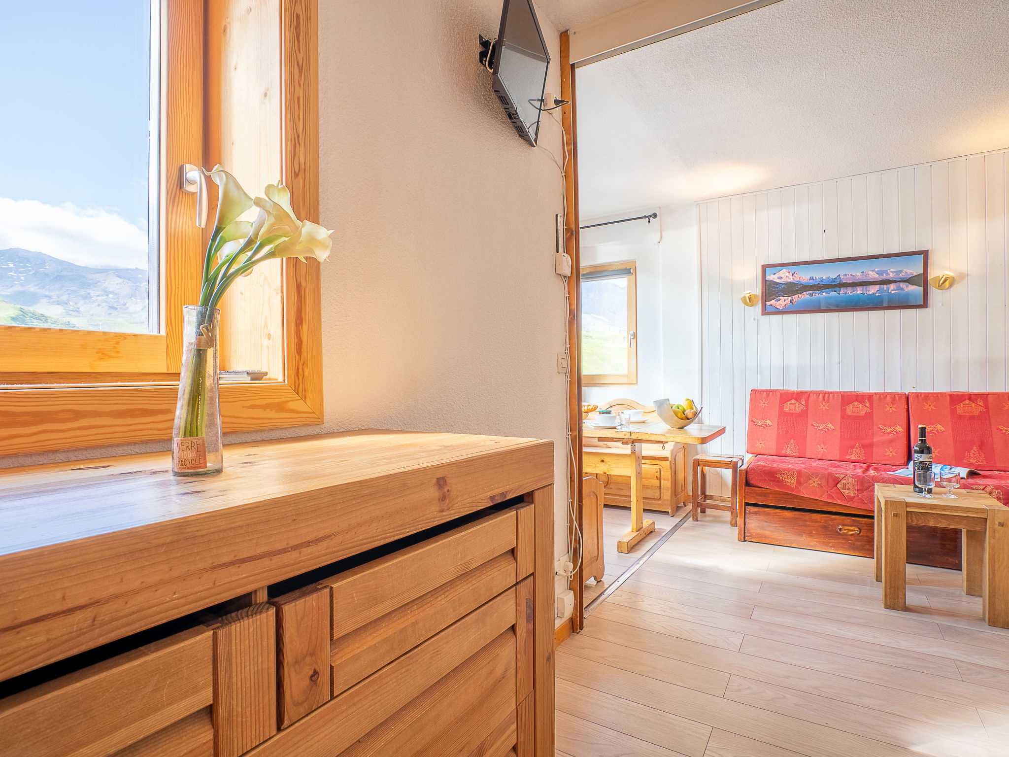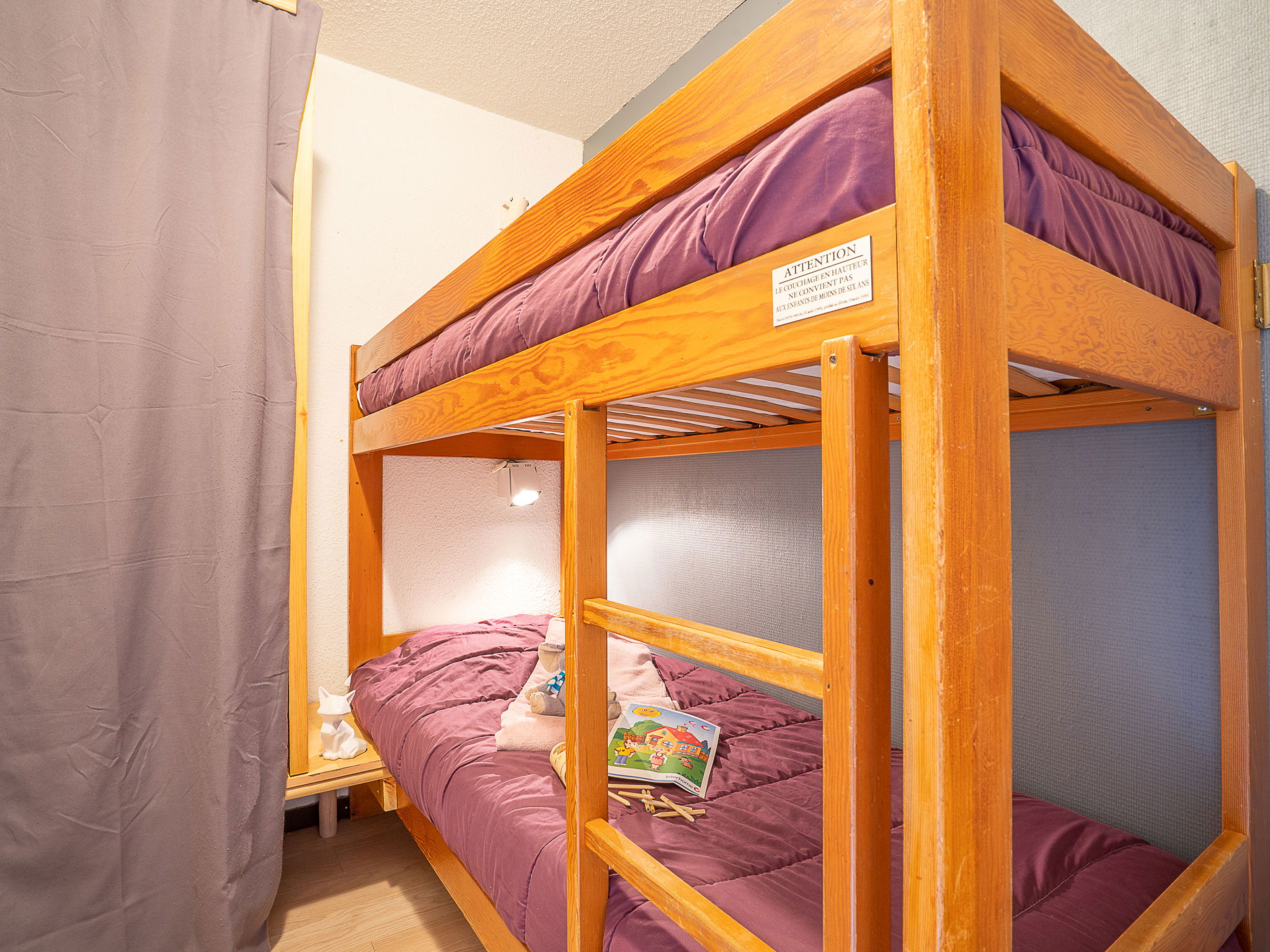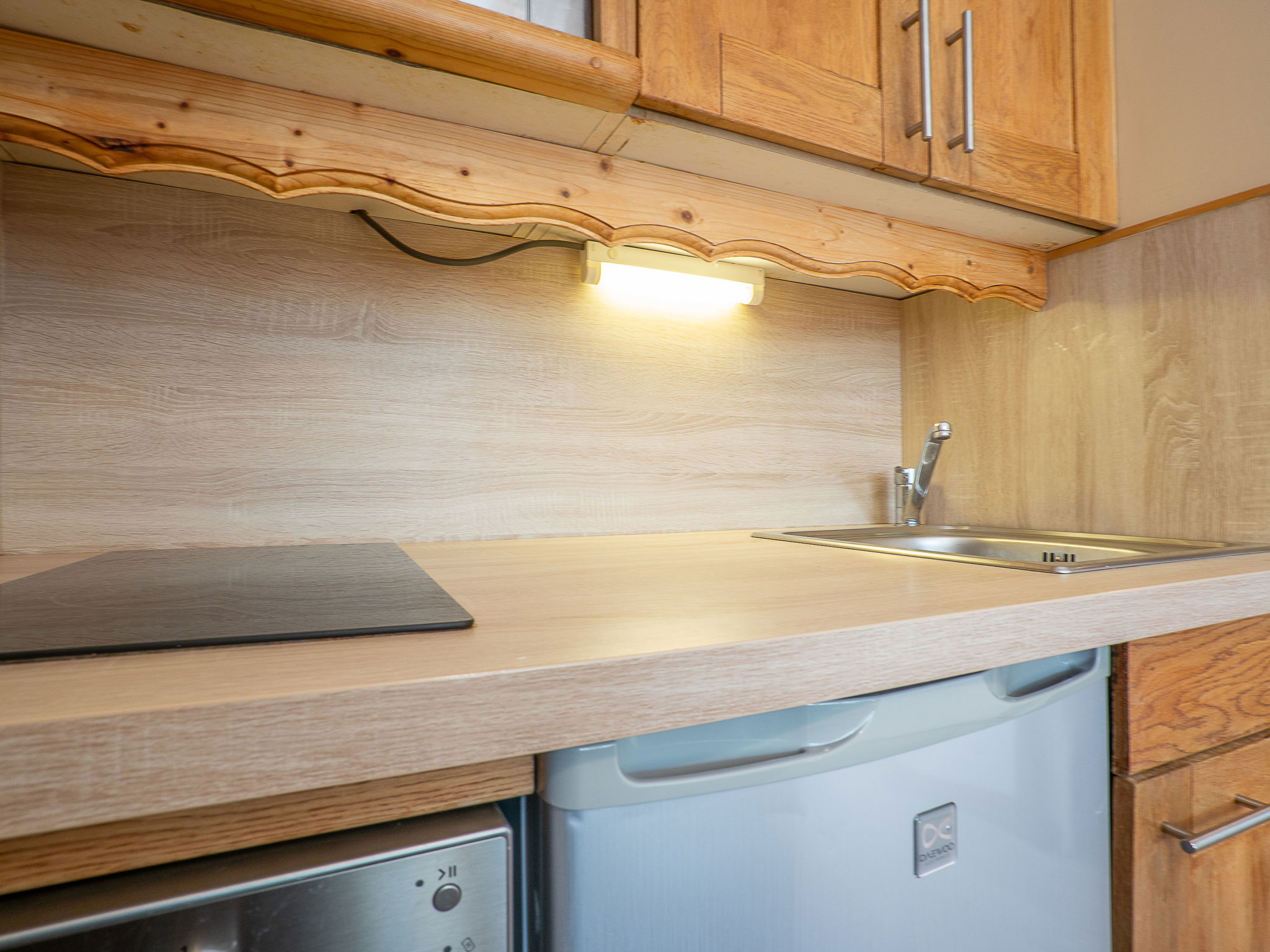 "Arcelle 505", 2-room apartment 26 m2 on 5th floor, south facing position. Very comfortable furnishings: living/dining room with TV and heating stove. 1 small room 6 m2 with sliding door with 1 double sofabed (1 x 140 cm, length 190 cm). Sleeping alcove with 1 x 2 bunk beds (80 cm, length 190 cm). Kitchenette (dishwasher, 2 induction hot plates, kettle, electric coffee machine, combination microwave). Bathroom, sep. WC. Beautiful view of the mountains. Facilities: iron. Internet (WiFi, extra). Please note: maximum 1 pet/ dog allowed. Smoke alarm. Instead of an enclosed bedroom, some sleeping areas are located in an open-plan area (gallery, alcove, etc.). 73257008957WF
