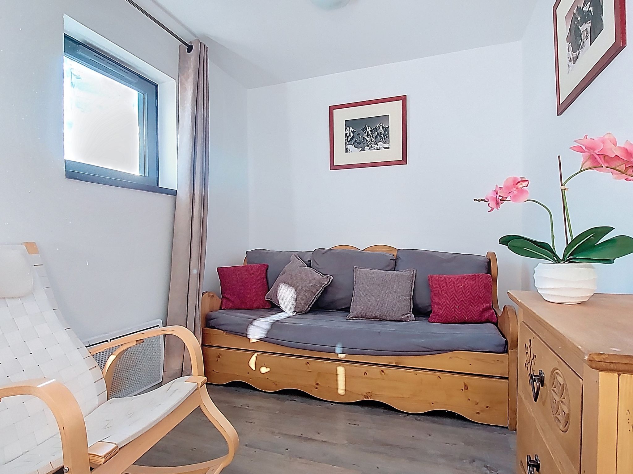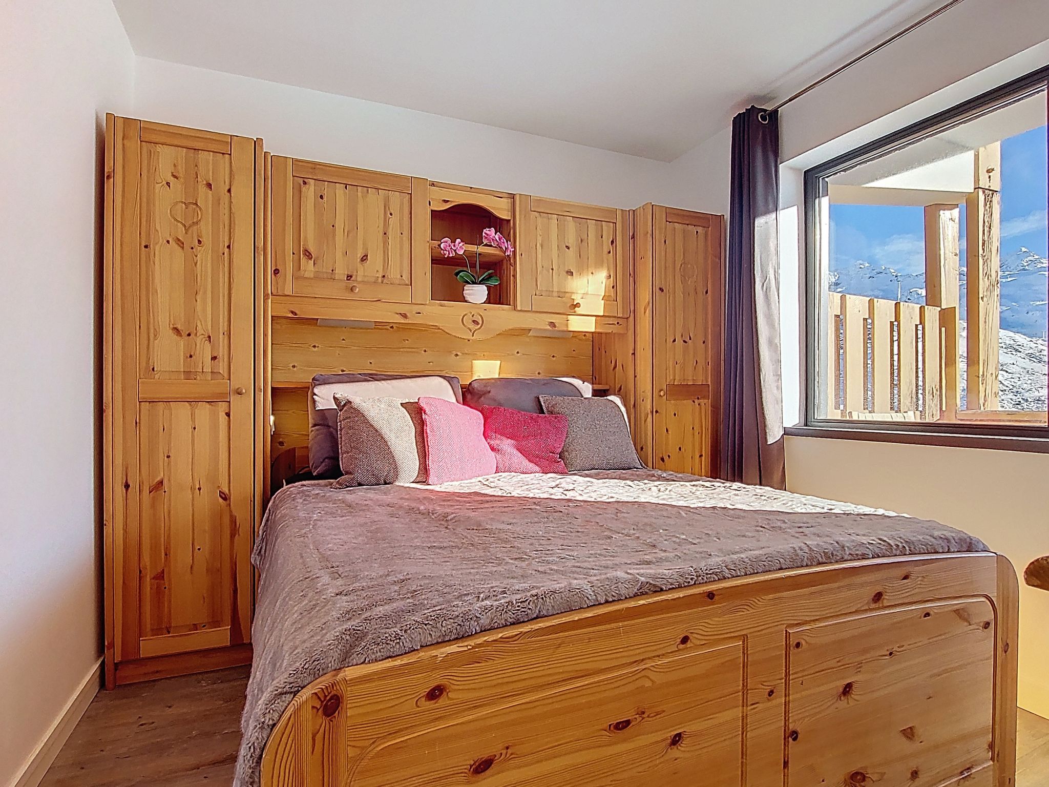 2-room apartment 45 m2 on 3rd floor, south facing position. Spacious, very comfortable and modern furnishings: living/dining room with 1 pull-out bed (1 pers. 2 x 80 cm, length 190 cm), dining table and TV (flat screen), electric heating. Exit to the balcony. 1 large room with 1 french bed (1 x 160 cm, length 190 cm). Sleeping alcove, without window with 2 beds (90 cm, length 190 cm), separate WC. Open kitchen (oven, dishwasher, 4 induction hot plates, toaster, kettle, microwave, freezer, electric coffee machine). Shower, sep. WC. Large balcony 4 m2, south facing position. Very beautiful panoramic view of the mountains, the valley, the ski run, the countryside and the resort. Facilities: Internet (WiFi, extra). Please note: non-smokers only. Smoke alarm. Instead of an enclosed bedroom, some sleeping areas are located in an open-plan area (gallery, alcove, etc.). Offer by a private individual according to Art. 155, IV of CGI. 73257007413MX