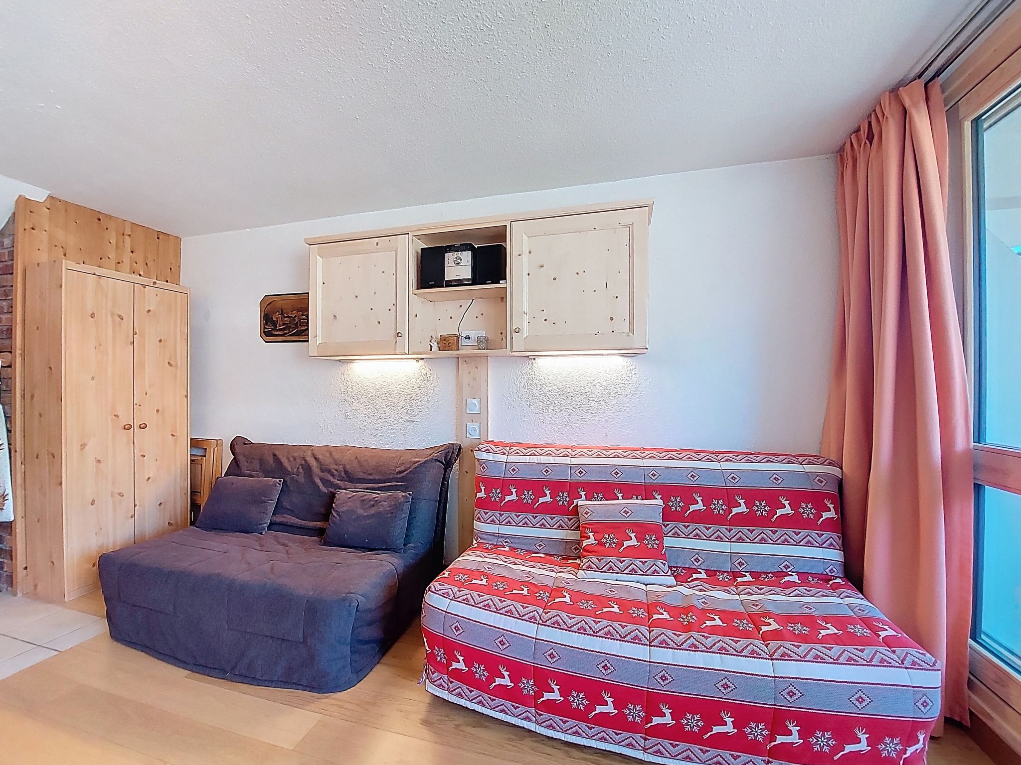 "Brelin Evons 401", 1-room apartment 24 m2 on 2 levels on 5th floor. Beautiful furnishings: entrance hall with separate WC and shower. Heating. Upper floor: living/dining room with 1 sofabed (160 cm, length 190 cm), 1 double sofabed (1 x 140 cm, length 190 cm), TV (flat screen). Kitchenette (dishwasher, 2 ceramic glass hob hotplates, microwave, electric coffee machine, raclette grill). Exit to the balcony. Balcony, south facing position. Very beautiful view of the mountains and the ski run. Facilities: Internet (WiFi, extra). Please note: non-smokers only. Smoke alarm. Entrance EVONS / COTE BRUNE. 73257004434AF