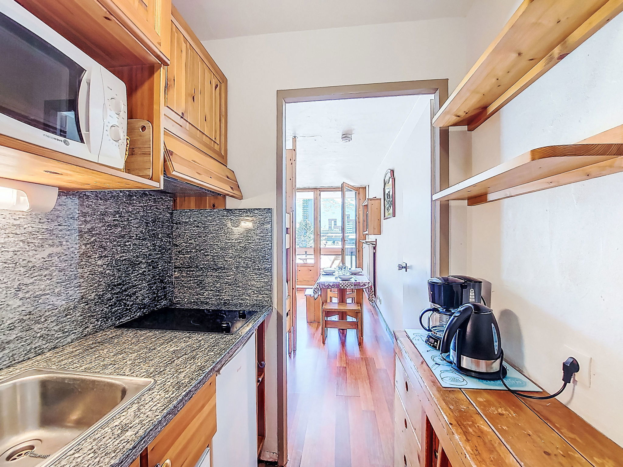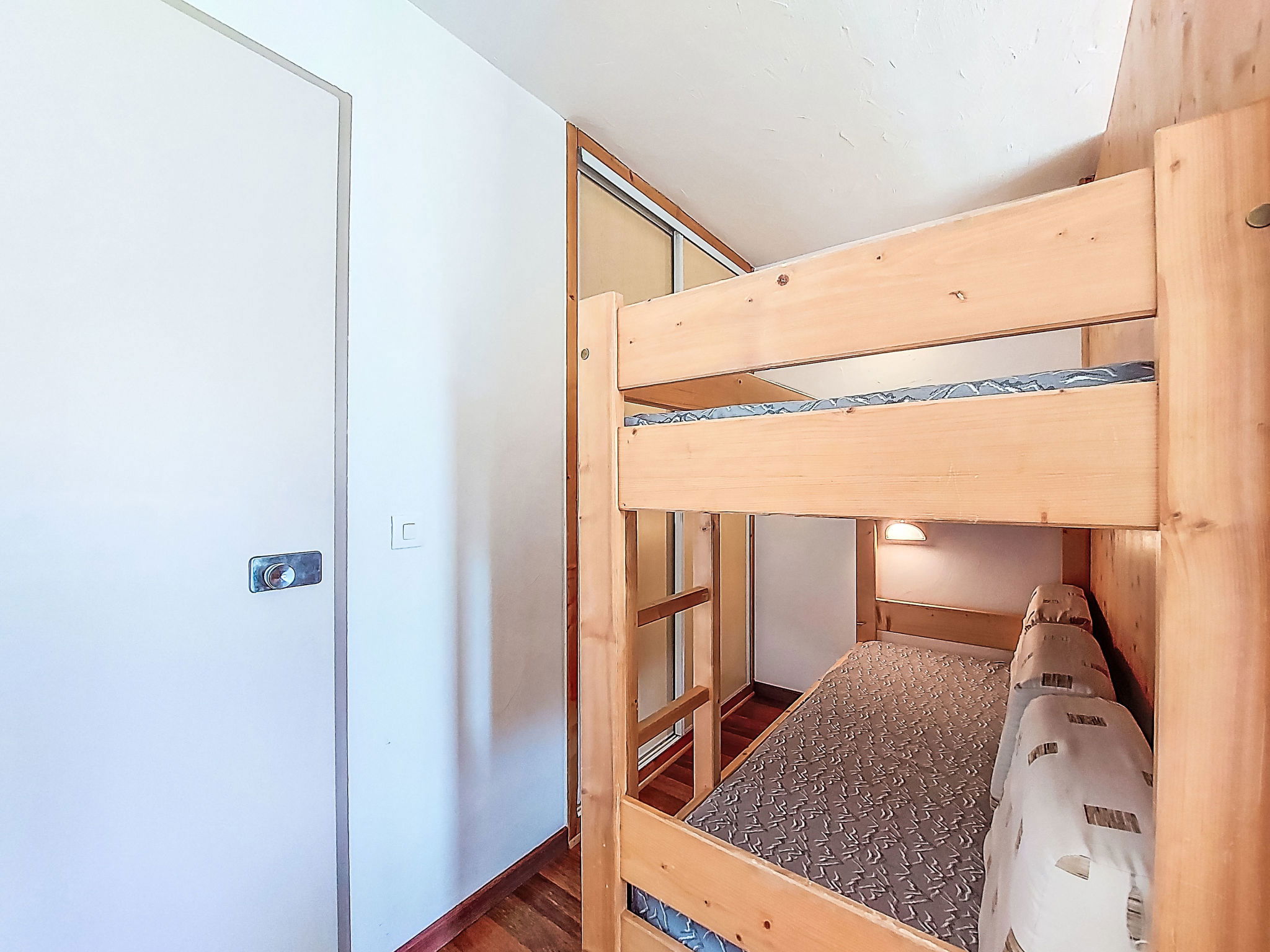 "Chavière 120", 1-room apartment 24 m2 on 1st floor. Comfortable and beautiful furnishings: living/dining room with 1 pull-out bed (2 pers. 2 x 80 cm, length 190 cm), TV (flat screen). Exit to the balcony, south facing position. Alcove with 1 x 2 bunk beds (80 cm, length 190 cm). Kitchenette in the entrance (dishwasher, 2 ceramic glass hob hotplates, kettle, microwave, electric coffee machine). Bathroom, sep. WC. Balcony, south facing position. Very beautiful view of the mountains and the ski run. Facilities: Internet (WiFi, extra). Please note: non-smokers only. Smoke alarm. Instead of an enclosed bedroom, some sleeping areas are located in an open-plan area (gallery, alcove, etc.). 73257005249WF