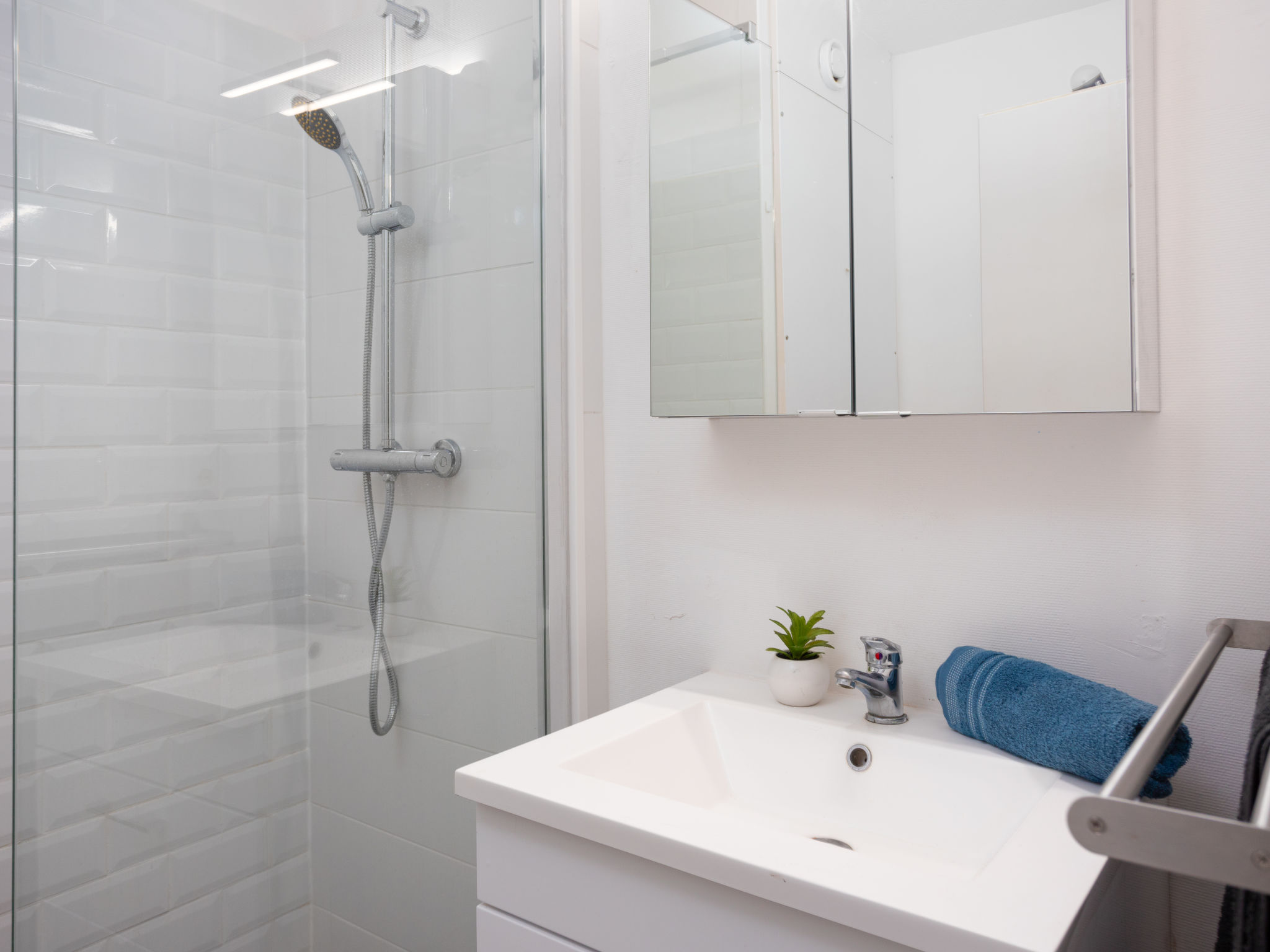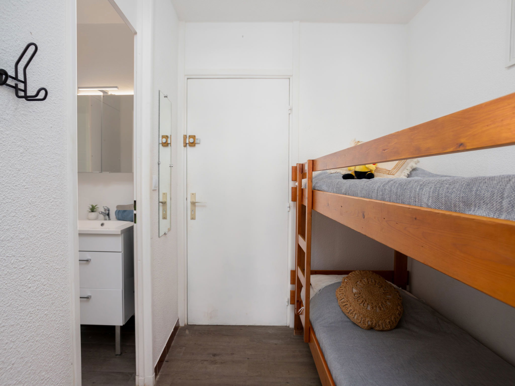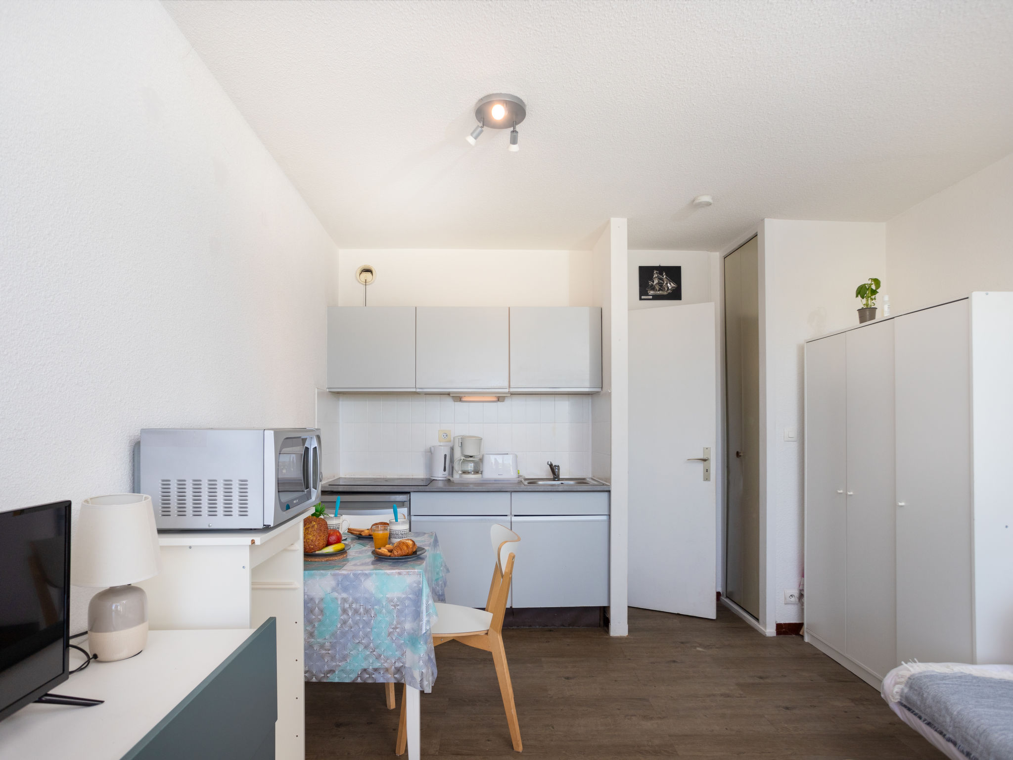 1-room apartment 21 m2 on 2nd floor. Living/dining room with 1 double sofabed (130 cm, length 190 cm), TV (flat screen). Entrance hall with 1 x 2 bunk beds (80 cm, length 190 cm). Kitchenette (3 ceramic glass hob hotplates, toaster, kettle, electric coffee machine, combination microwave). Shower/WC. Terrace 8 m2, south facing position. Terrace furniture. View of the swimming pool. Facilities: Internet (WiFi, extra). Parking. Please note: maximum 1 pet/ dog allowed. Smoke alarm.