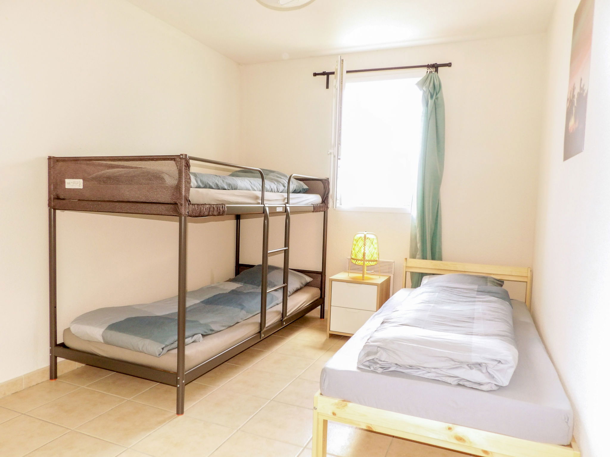 3-room apartment 62 m2 on 2 levels, on the ground floor. Comfortable and beautiful furnishings: living/dining room with TV and international TV channels (flat screen). Exit to the terrace. 1 room with 1 bed (90 cm, length 190 cm), 1 x 2 bunk beds (90 cm, length 190 cm). 1 room with 1 french bed (1 x 140 cm, length 190 cm). Open kitchen (oven, 3 ceramic glass hob hotplates, kettle, microwave, electric coffee machine, Capsules for coffee machine (filtre) extra). Bath/shower, sep. WC, double hand-basin. Heating, electric heating. Terrace 5 m2. Terrace furniture. Facilities: washing machine. Internet (WiFi, free). Parking space n 11. Please note: non-smokers only. Maximum 1 pet/ dog allowed. Smoke alarm.