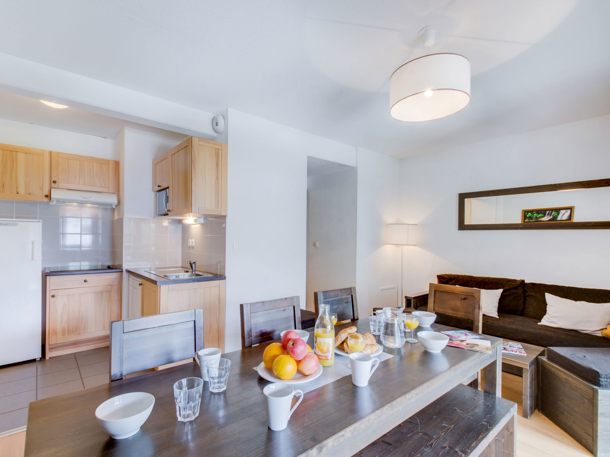 "Jardins de Balnéa 2 pièces 6 pers.", 2-room apartment 40 m2. Practical and comfortable furnishings: living/sleeping room with 1 double sofabed and TV. 1 room with 2 beds. Alcove with 1 x 2 bunk beds. Kitchenette (dishwasher, 4 ceramic glass hob hotplates, microwave). Bathroom, sep. WC. Electric heating. Balcony or terrace. Facilities: Internet (WiFi, free). Maximum 1 pet/ dog allowed. Instead of an enclosed bedroom, some sleeping areas are located in an open-plan area (gallery, alcove, etc.).