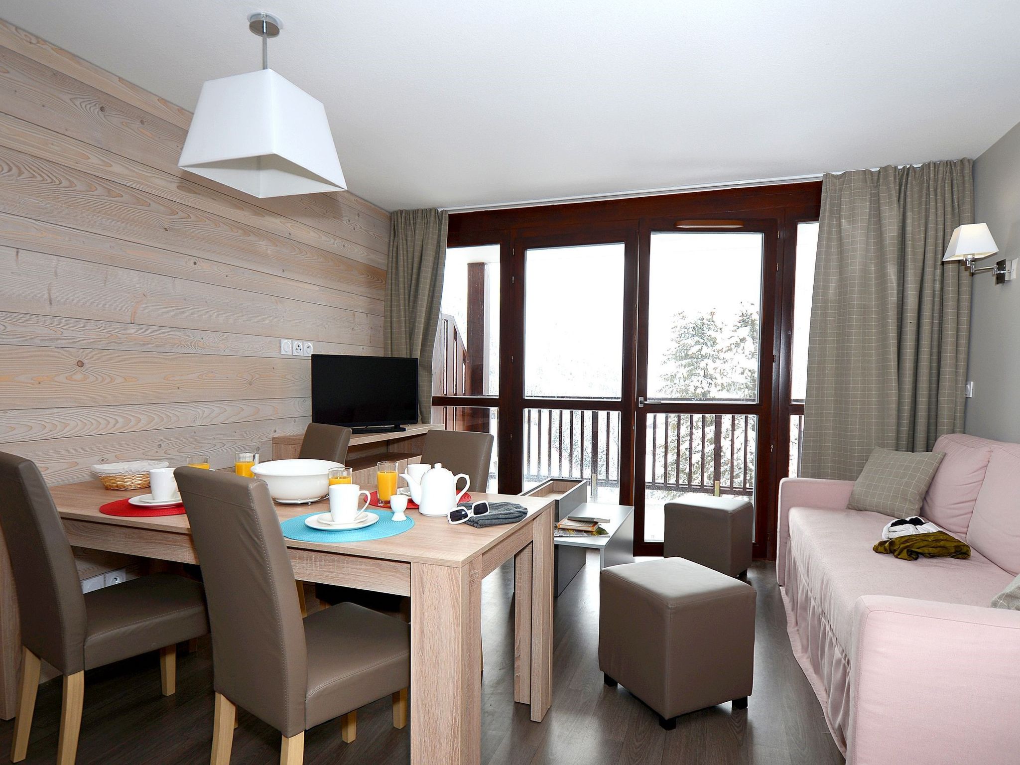 "Résidence Odalys Référence Le Panoramic", 2-room apartment 42 m2, on the ground floor. Tasteful furnishings: living/sleeping room with 2 sleeping facilities, dining table and TV. Exit to the balcony. 1 room with 1 french bed. Alcove with 1 x 2 bunk beds. Small, open kitchen (dishwasher, 2 ceramic glass hob hotplates, toaster, kettle, microwave, electric coffee machine). Bath/WC. Electric heating. Balcony. Facilities: Internet (WiFi, free). Parking (roofed, 1 car). Maximum 1 pet/ dog allowed. Instead of an enclosed bedroom, some sleeping areas are located in an open-plan area (gallery, alcove, etc.).