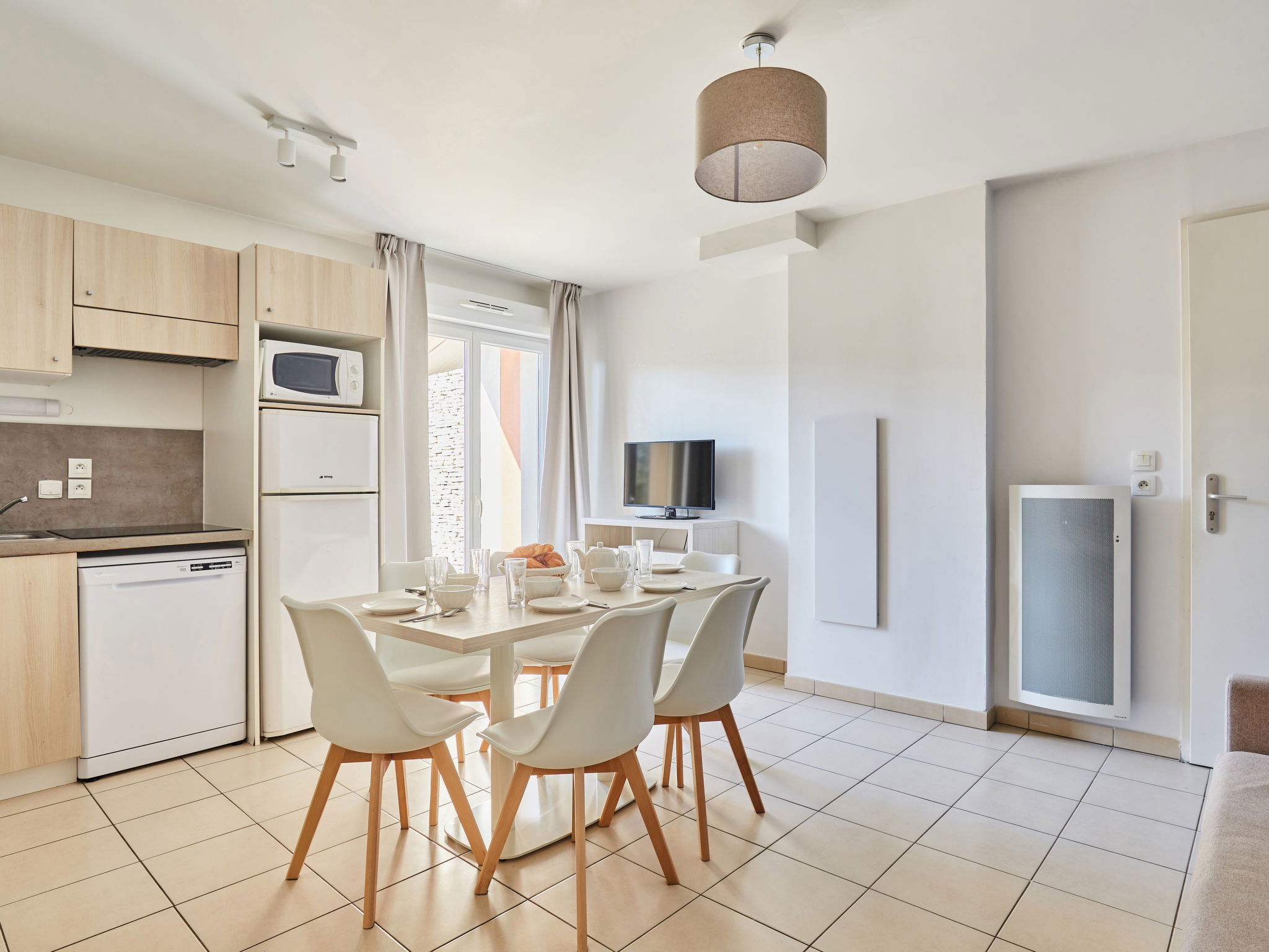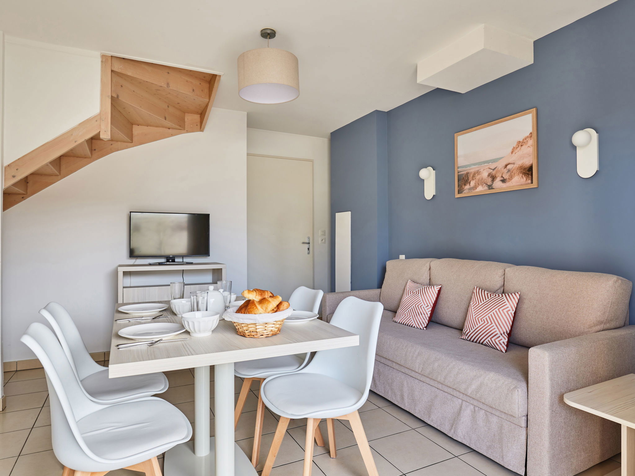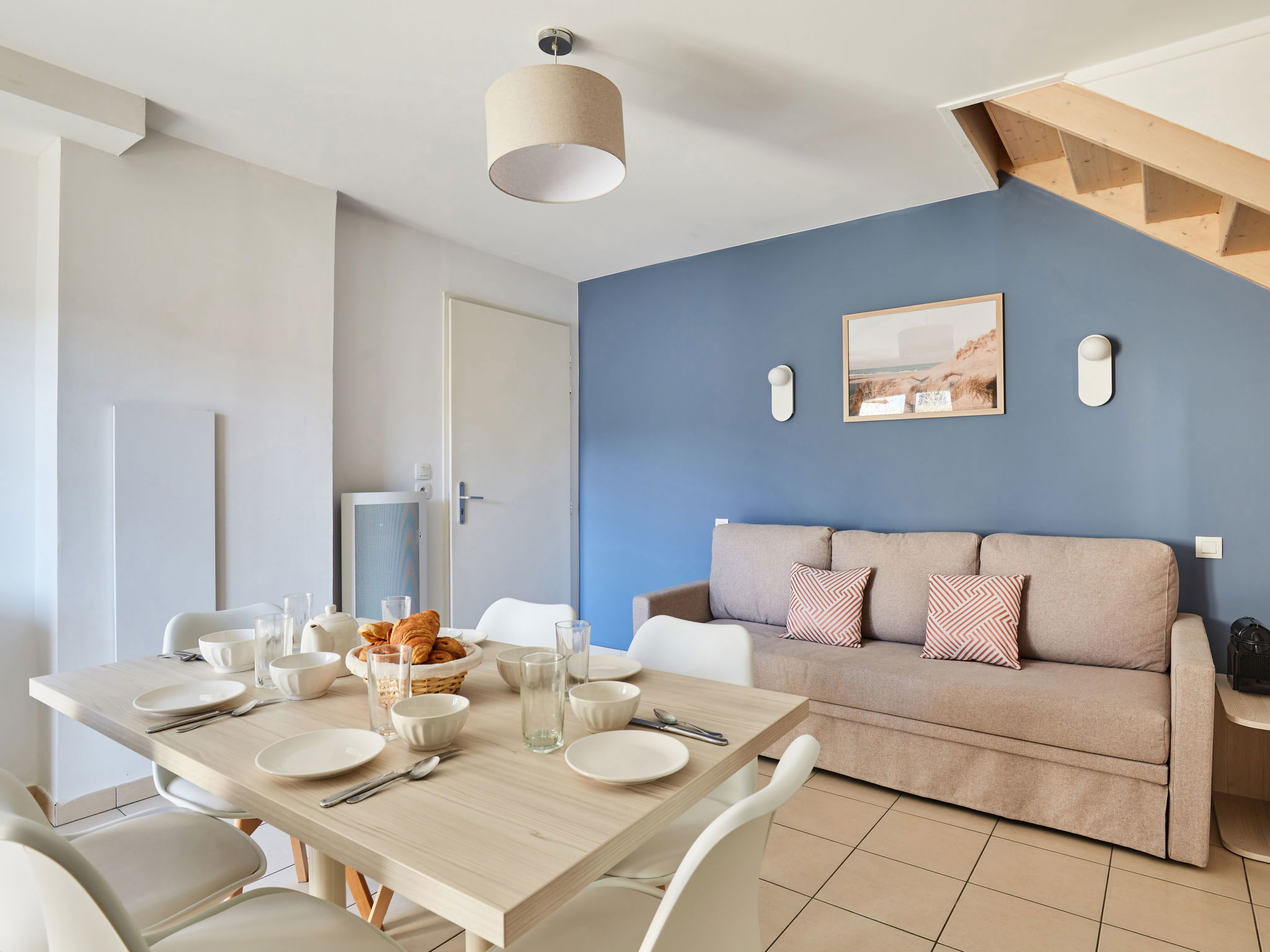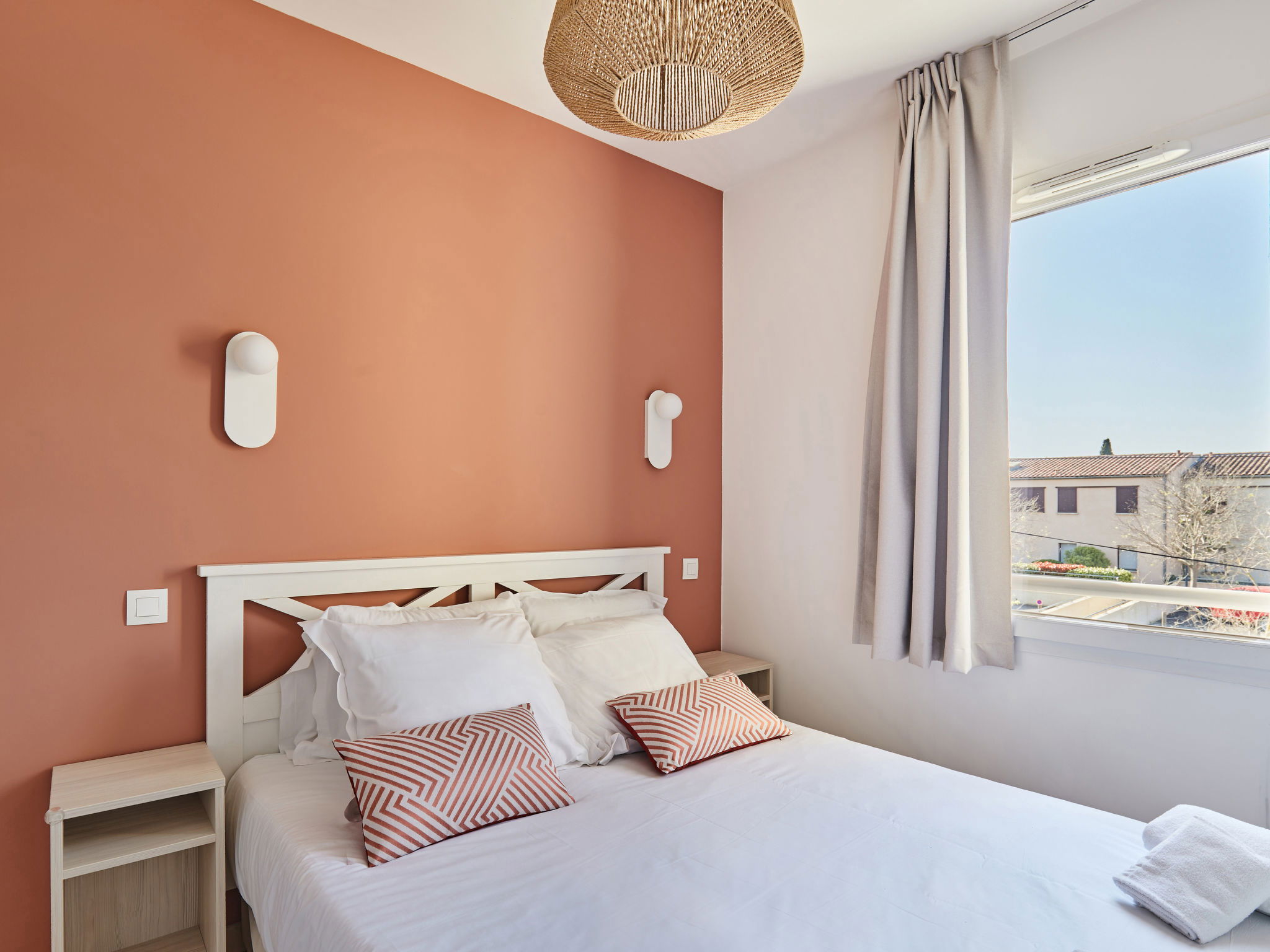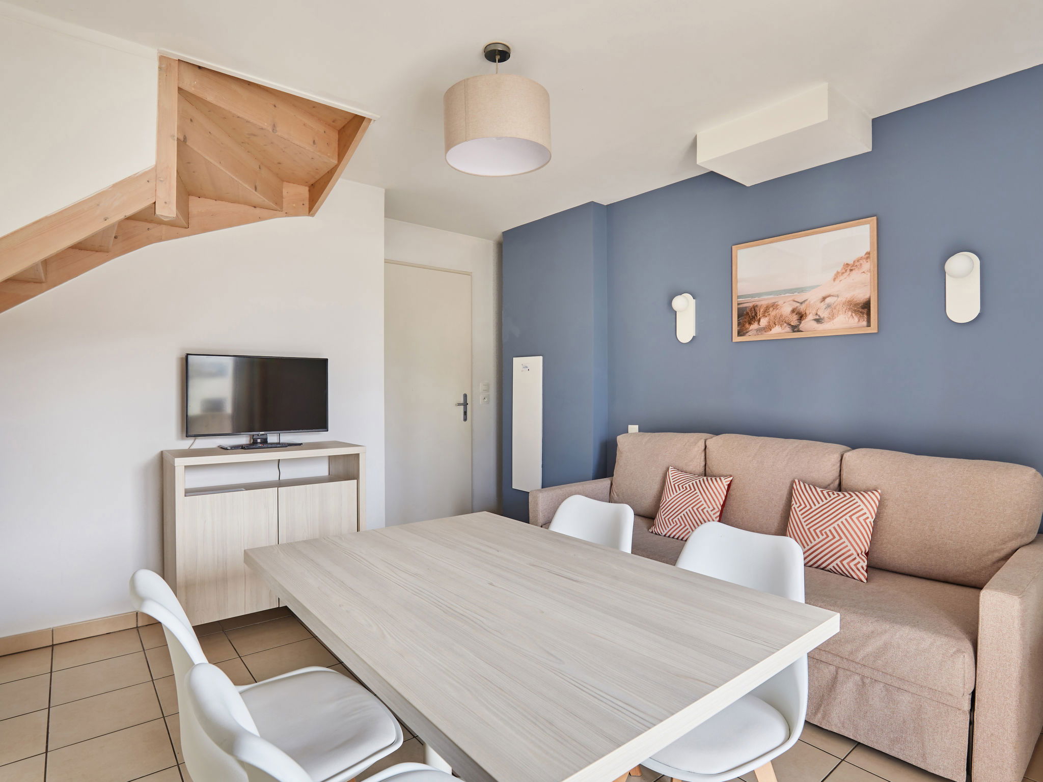 " Odalys Référence Le Mas des Flamants", 3-room terraced house 41 m2 on 2 levels. Bright: living/sleeping room with 1 double sofabed, dining table and TV. Exit to the terrace. Small, open kitchen (dishwasher, 4 ceramic glass hob hotplates, kettle, microwave, freezer, electric coffee machine). Upper floor: 1 room with 1 french bed. 1 room with 2 sleeping facilities. Sep. WC, bath or shower. Electric heating. Terrace. Terrace furniture. Facilities: children's high chair, baby cot (extra). Internet (WiFi, free). Please note: non-smoking house. Maximum 1 pet/ dog allowed. Smoke alarm. The property is one of a type of property or apartment.