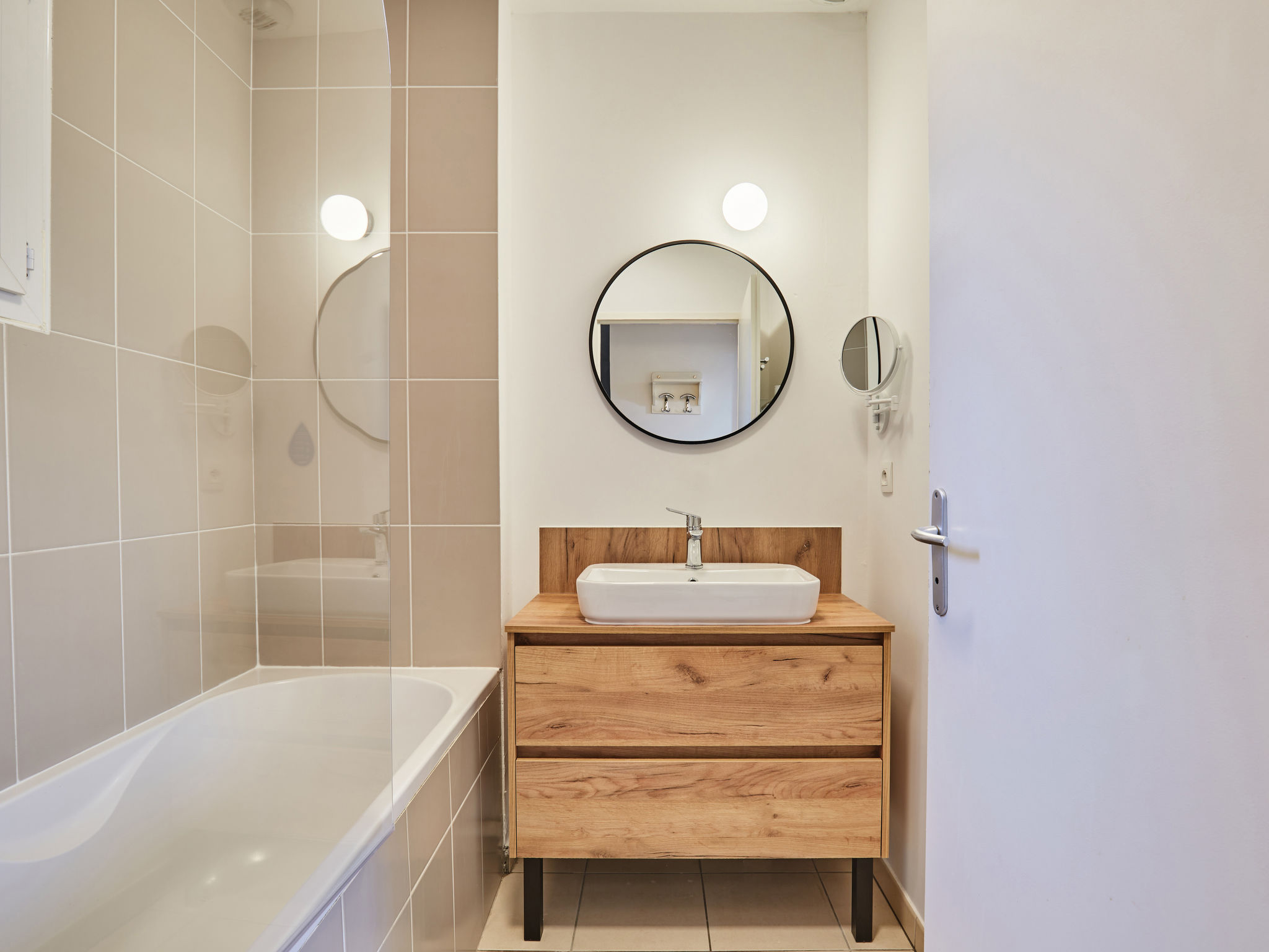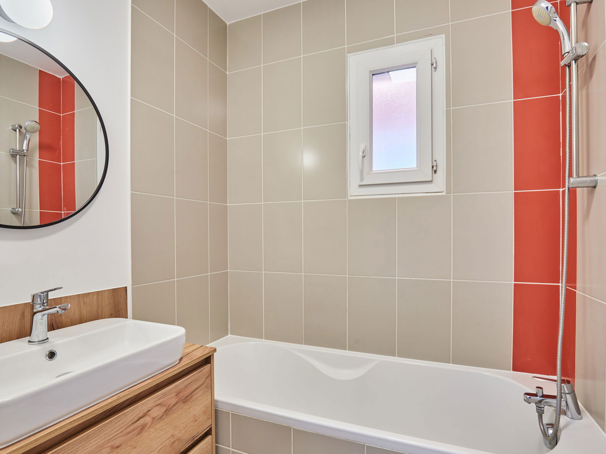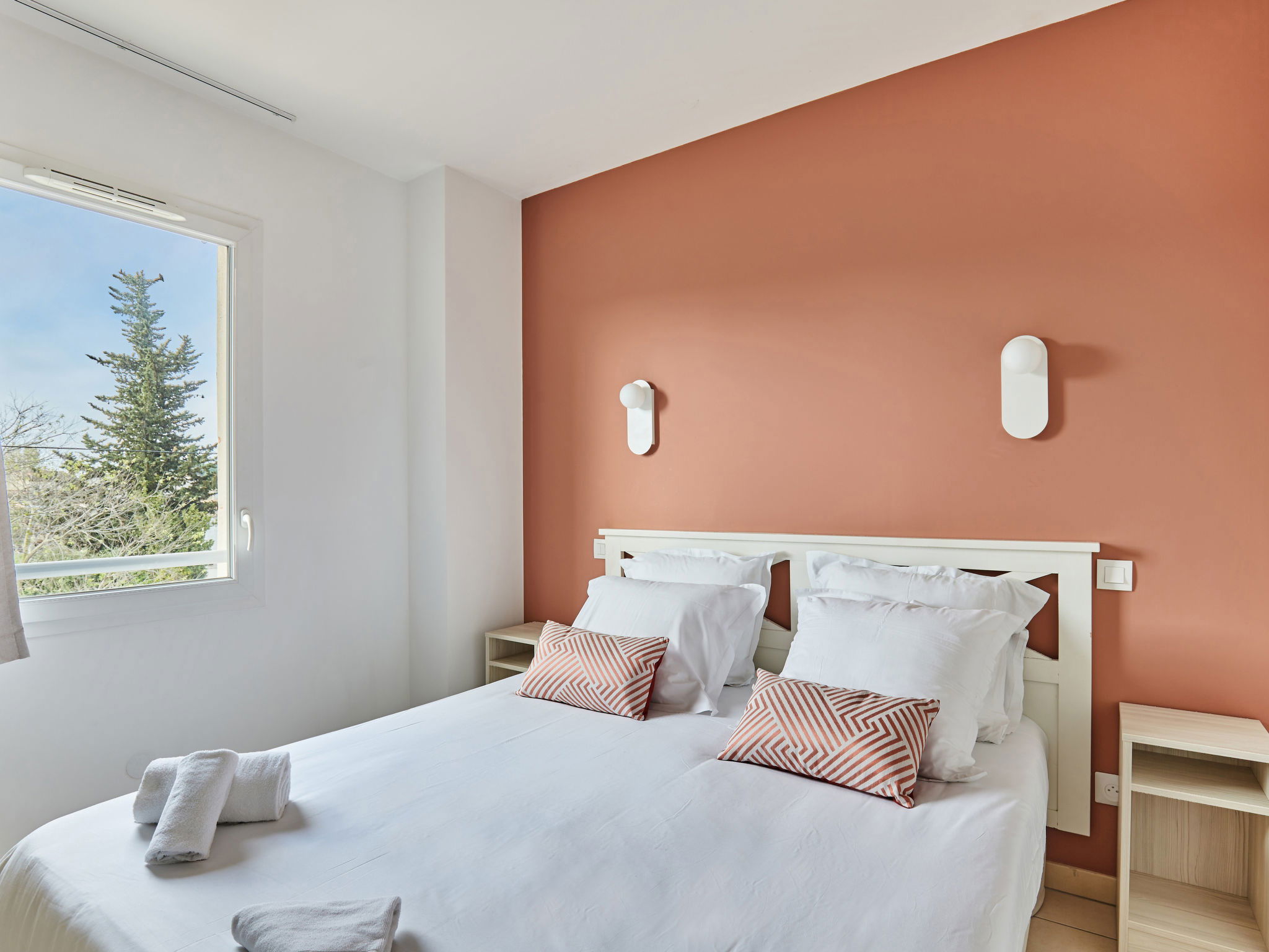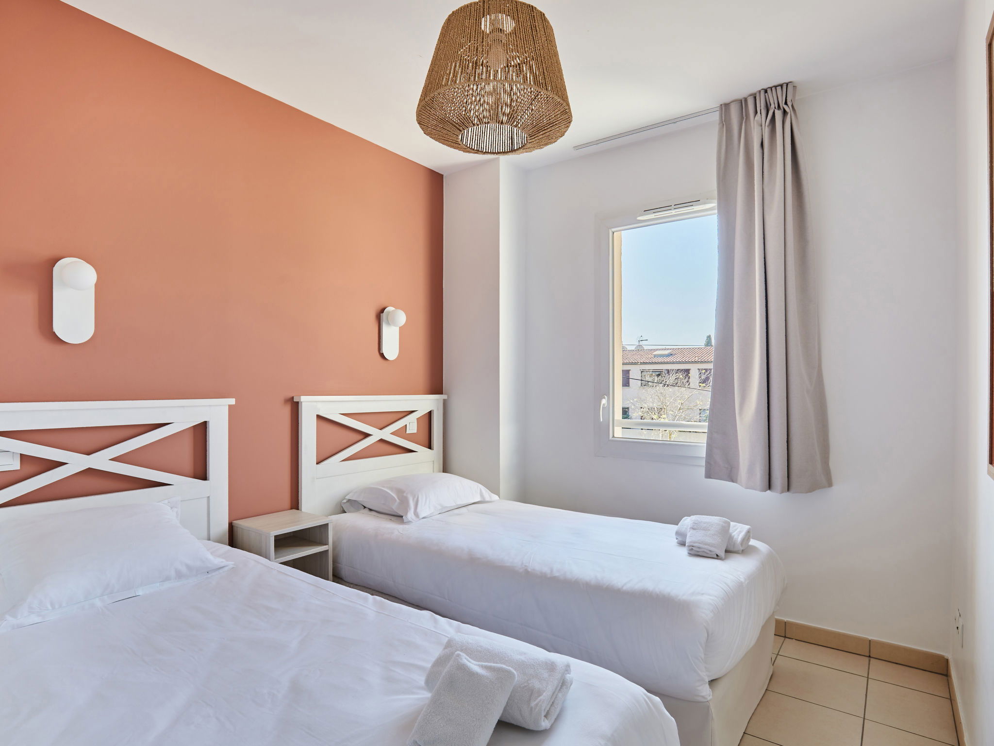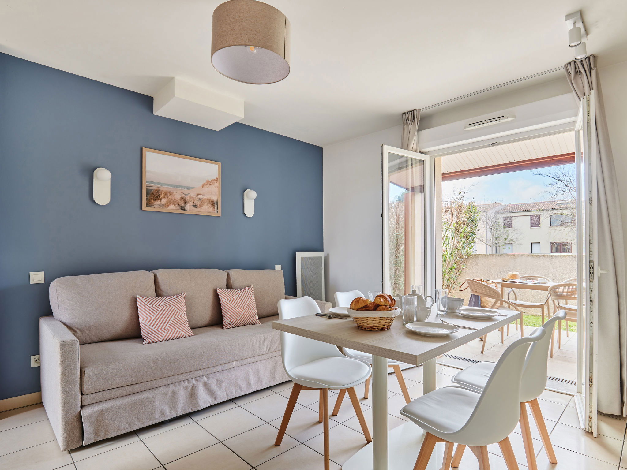 " Odalys Référence Le Mas des Flamants", 3-room terraced house 41 m2 on 2 levels. Bright: living/sleeping room with 1 double sofabed, dining table and TV. Exit to the terrace. Small, open kitchen (dishwasher, 4 ceramic glass hob hotplates, kettle, microwave, freezer, electric coffee machine). Upper floor: 1 room with 1 french bed. 1 room with 2 sleeping facilities. Sep. WC, bath or shower. Electric heating. Terrace. Terrace furniture. Facilities: children's high chair, baby cot (extra). Internet (WiFi, free). Please note: non-smoking house. Maximum 1 pet/ dog allowed. Smoke alarm. The property is one of a type of property or apartment.