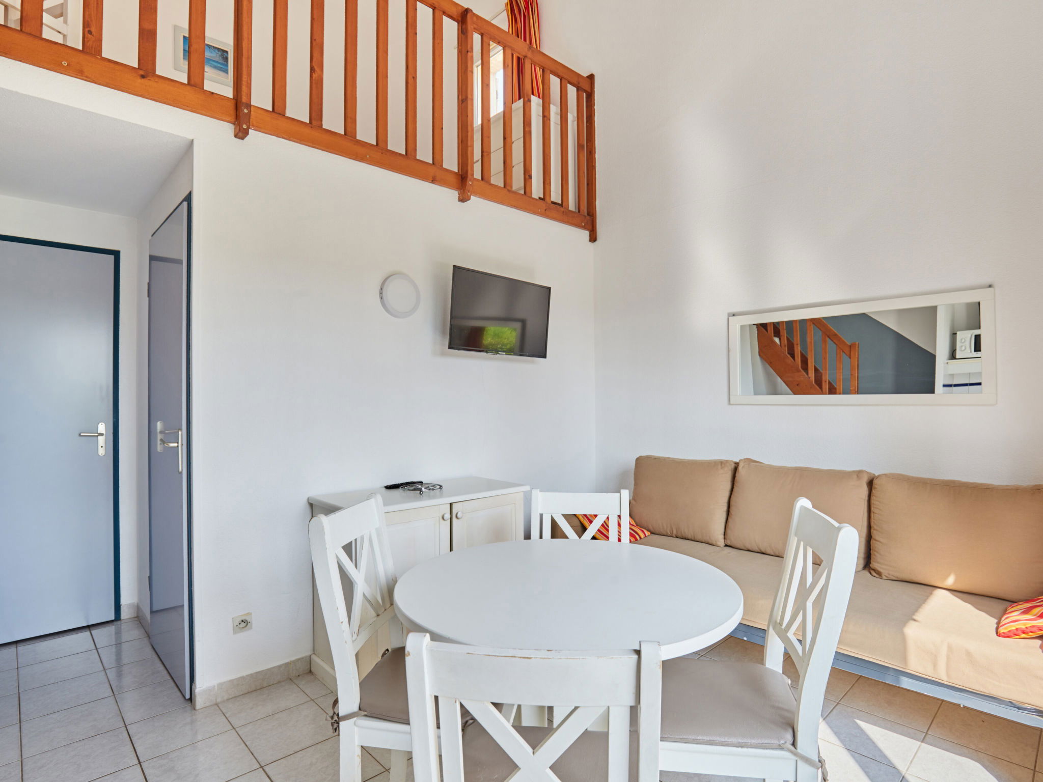 " Odalys Essentielle Le Grand Bleu", 2-room maisonette 33 m2. Living/sleeping room with 2 sleeping facilities, dining table, TV and electric heating. Exit to the terrace. Kitchenette (2 hot plates, microwave, freezer, electric coffee machine). Sep. WC. Upper floor: 1 room with sloping ceilings with 1 french bed. Alcove with sloping ceilings with 1 x 2 bunk beds. Shower. Patio 9 m2. Terrace furniture. Facilities: iron, children's high chair, baby cot. Internet (WiFi, extra). Please note: non-smoking house. Maximum 2 pets/ dogs allowed. Smoke alarm. Instead of an enclosed bedroom, some sleeping areas are located in an open-plan area (gallery, alcove, etc.).