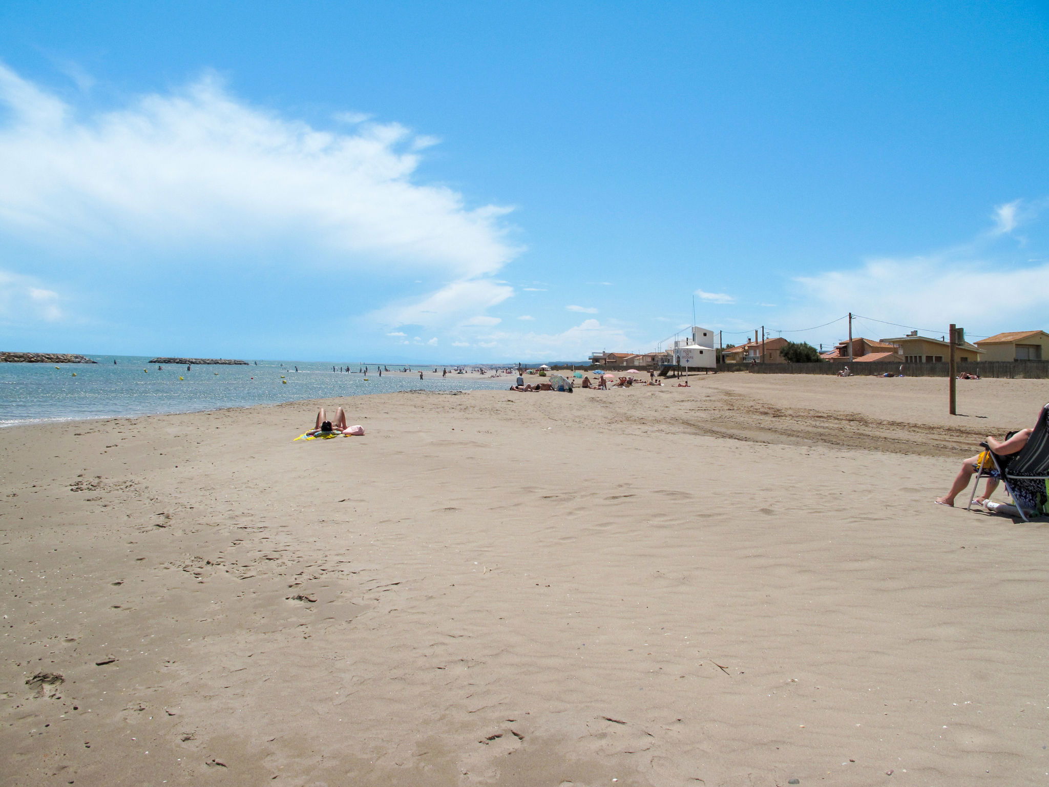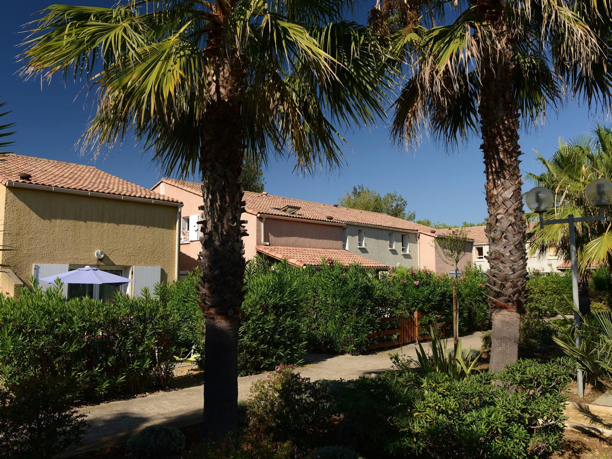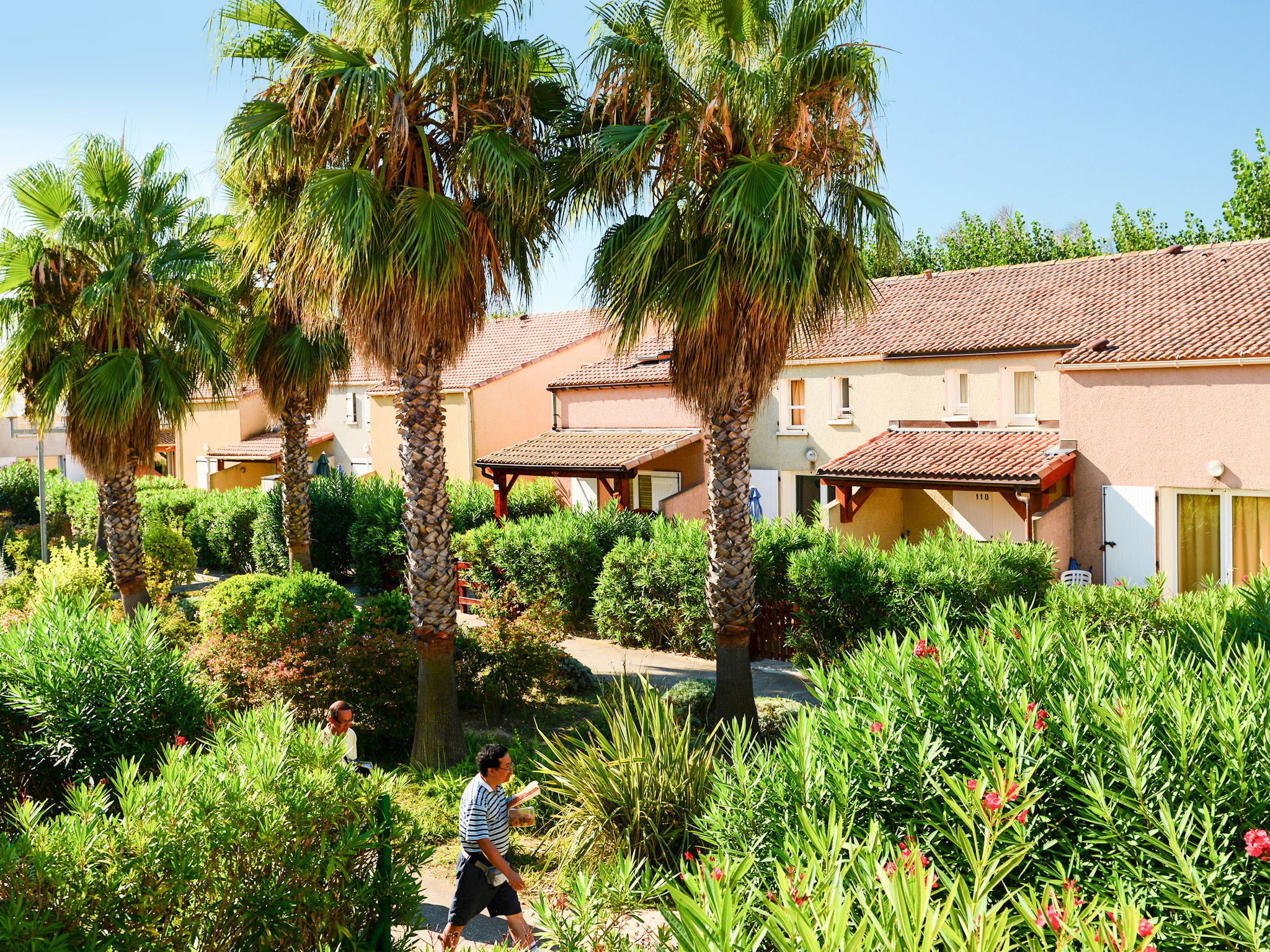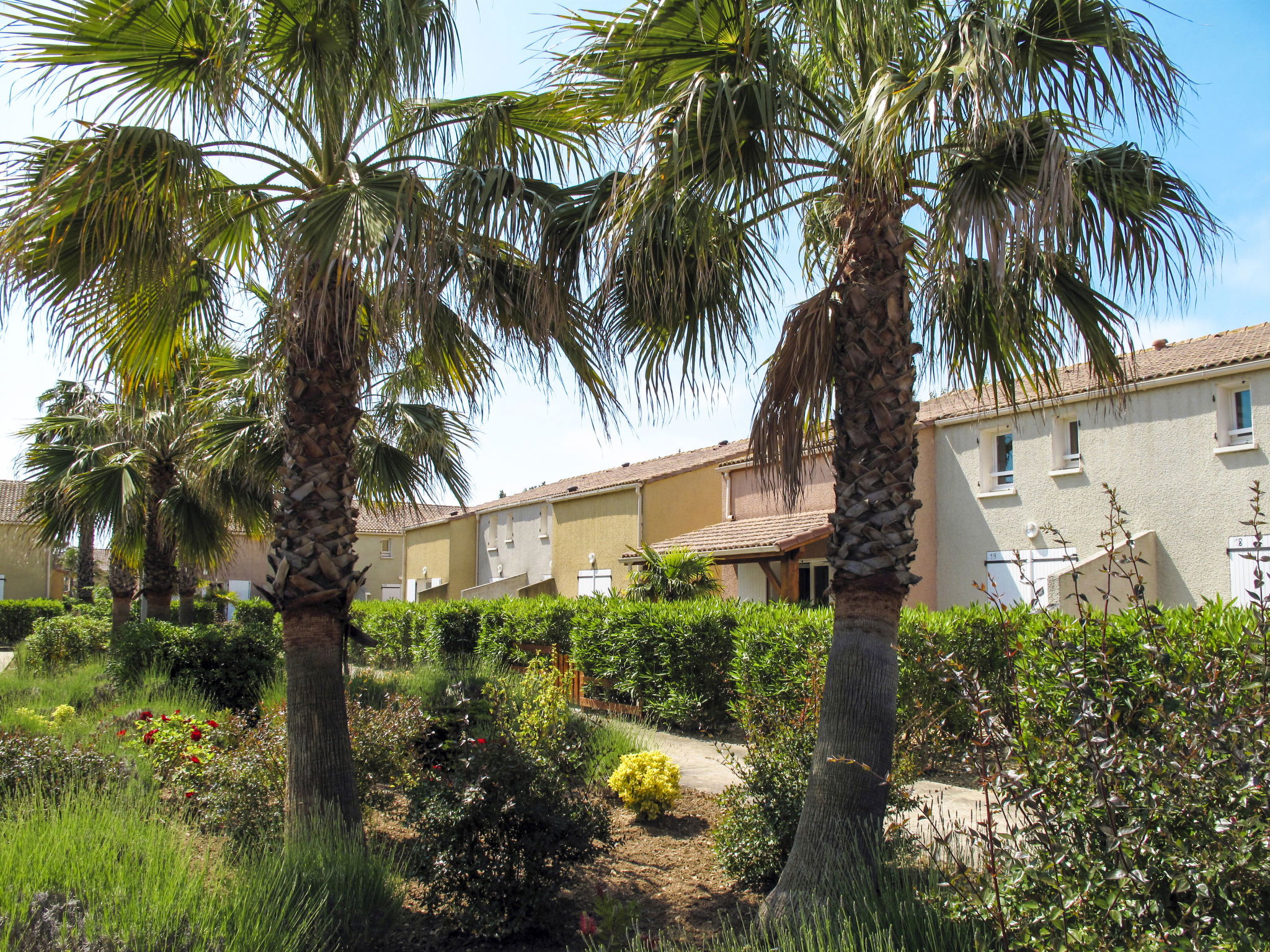 Resort "Le Grand Bleu". 140 houses in the resort. 4 km from the centre of Valras, 800 m from the sea. For shared use: property, beautiful garden with plants and flowers, swimming pool fenced (60 m2, seasonal availability: 15.Jun. - 15.Sep.). Children's pool. In the complex: reception, washing machine, tumble dryer (for shared use, extra). Parking on the premises. Bakery 50 m, sandy beach 800 m. The photo is just an example. The holiday properties may differ in living space, floorplan, equipment and furnishing.