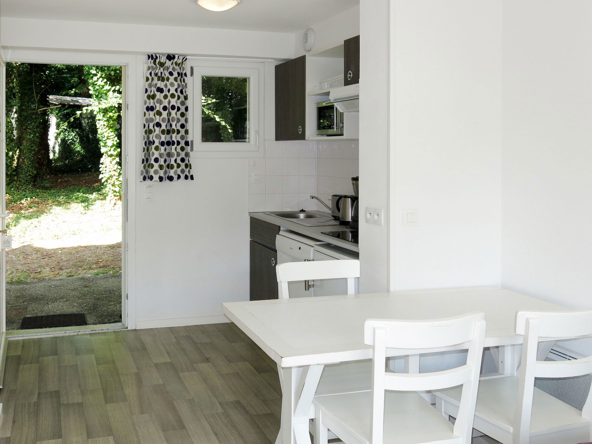 "Domaine de la Baie-Appartement+cab-duplex, 6 pers", 2-room terraced house 38 m2 on 2 levels. Beautiful furnishings: living/sleeping room with 1 double sofabed, dining table and TV (flat screen). Exit to the terrace. Kitchenette (dishwasher, 2 ceramic glass hob hotplates, toaster, kettle, microwave, electric coffee machine). Sep. WC. Upper floor: 1 room with 1 french bed. Open alcove with 1 x 2 bunk beds. Bathroom. Electric heating. Terrace. Terrace furniture. Please note: non-smokers only. Maximum 1 pet/ dog allowed. Smoke alarm. The property is one of a type of property or apartment. Instead of an enclosed bedroom, some sleeping areas are located in an open-plan area (gallery, alcove, etc.).