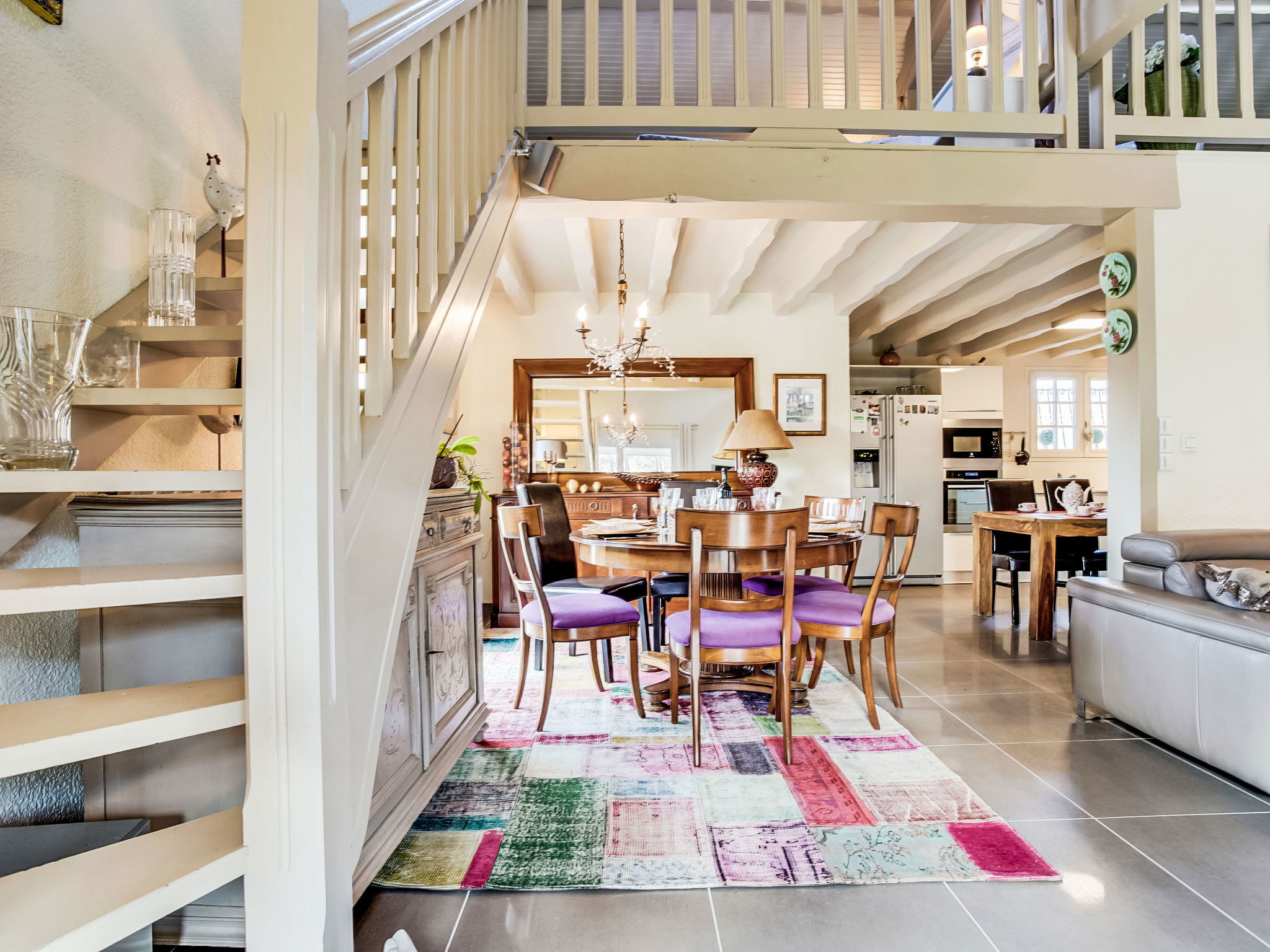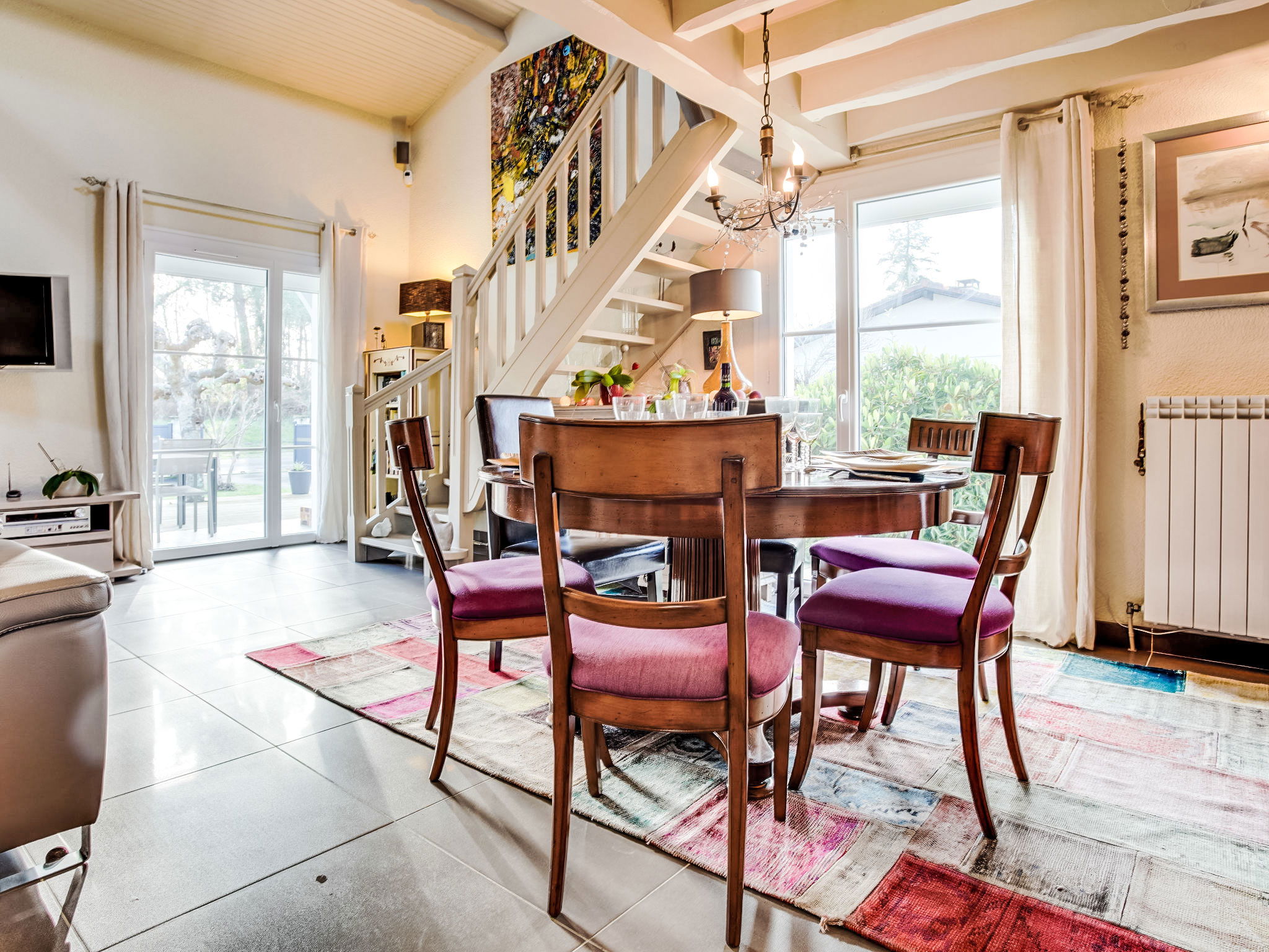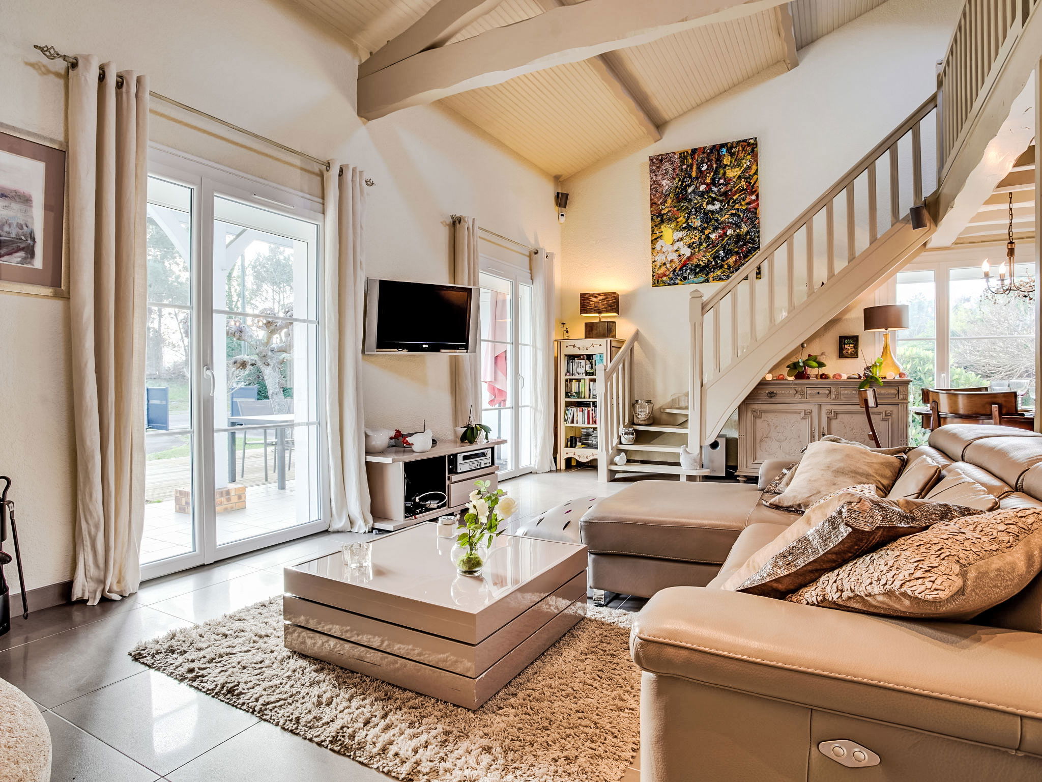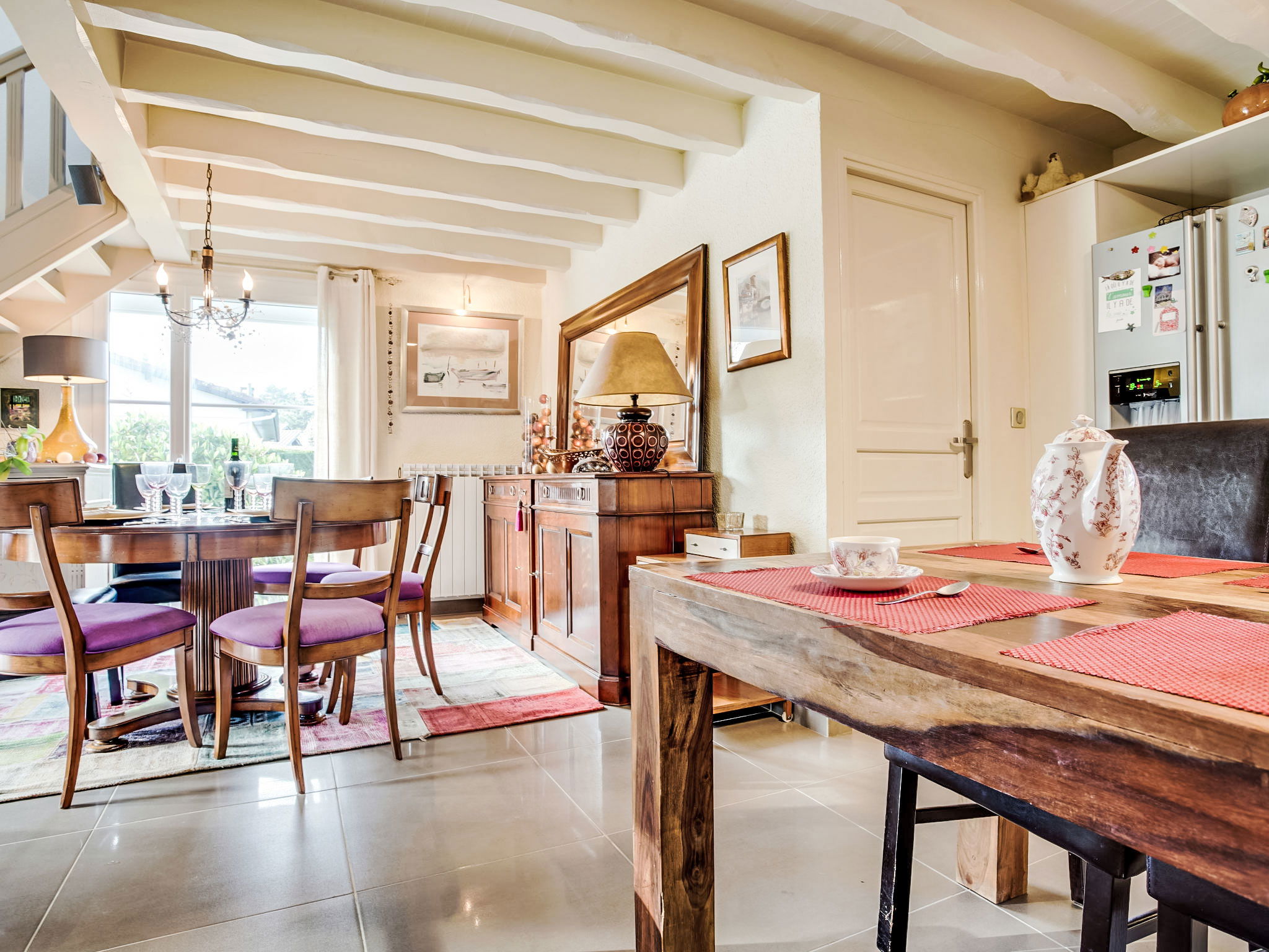 3-room house 115 m2 on 2 levels. Renovated in 2014, very practical and beautiful furnishings: open living/dining room with TV and international TV channels (flat screen), heating stove and electric shutters. Exit to the terrace. 1 room with 1 french bed (140 cm, length 190 cm), TV (flat screen), electric shutters. 1 large room with Dressing room with 1 double bed (2 x 80 cm, length 200 cm), hand-basin, shower/WC and TV (flat screen). Exit to the terrace. Open kitchen 15 m2 (oven, dishwasher, 4 induction hot plates, toaster, kettle, microwave, freezer, electric coffee machine, Capsules for coffee machine (Moulinex) extra). Bath/shower, sep. WC, double hand-basin. Upper floor: 1 open room with sloping ceilings with 1 sofabed (140 cm, length 190 cm). Wooden floors. Terrace 20 m2, south facing position and, east facing position. Terrace furniture, barbecue. Facilities: washing machine, dryer, children's high chair, baby cot. Internet (WiFi, free). Please note: non-smokers only. Maximum 1 pet/ dog allowed. Smoke alarm. FR59800