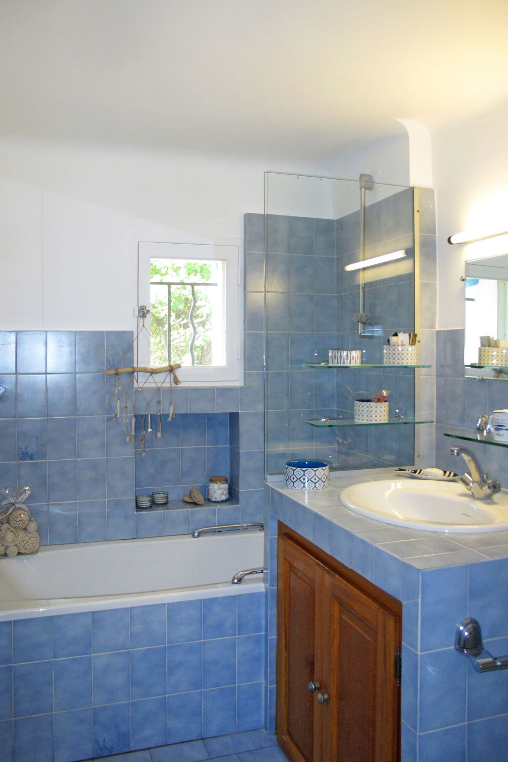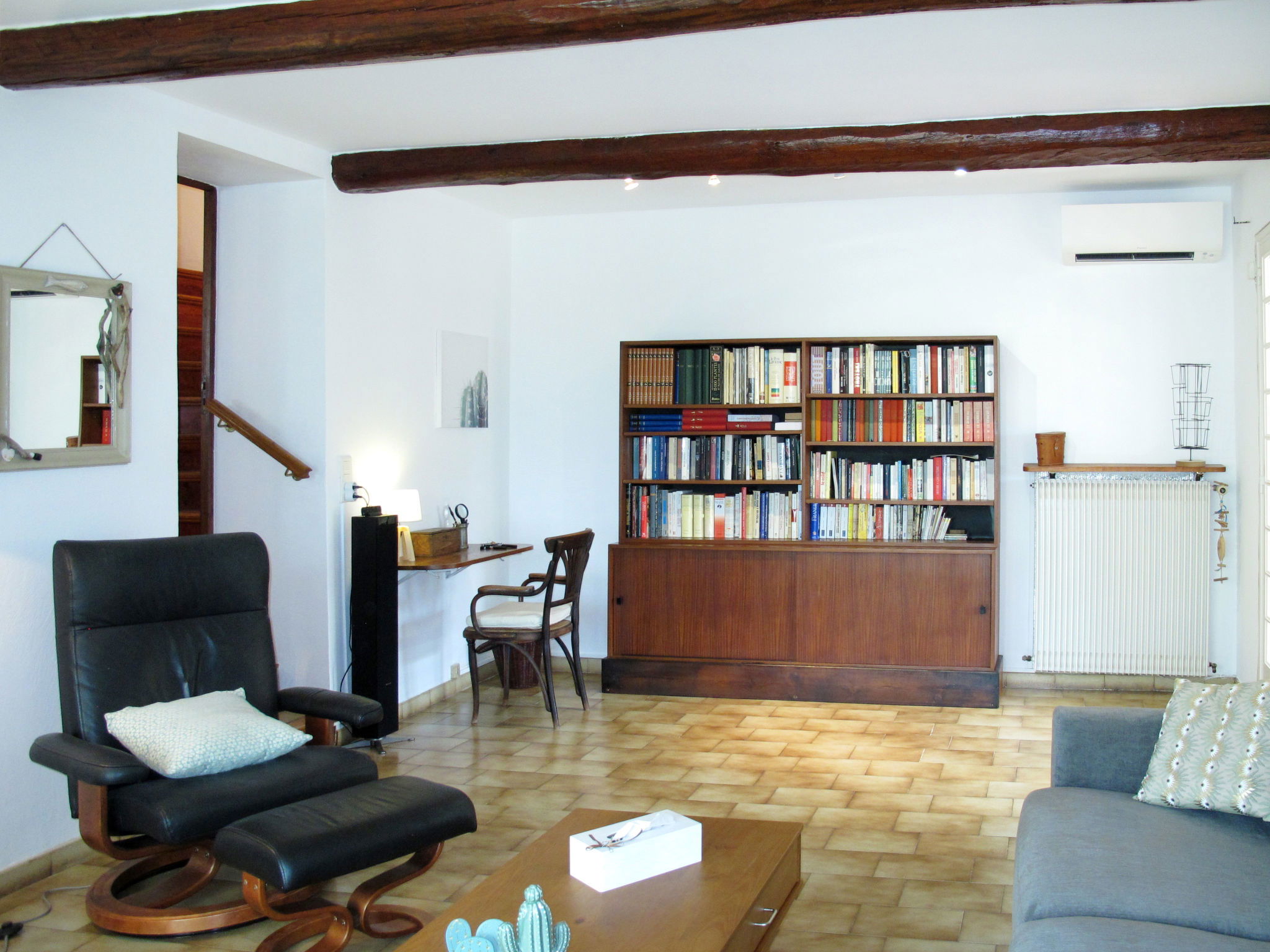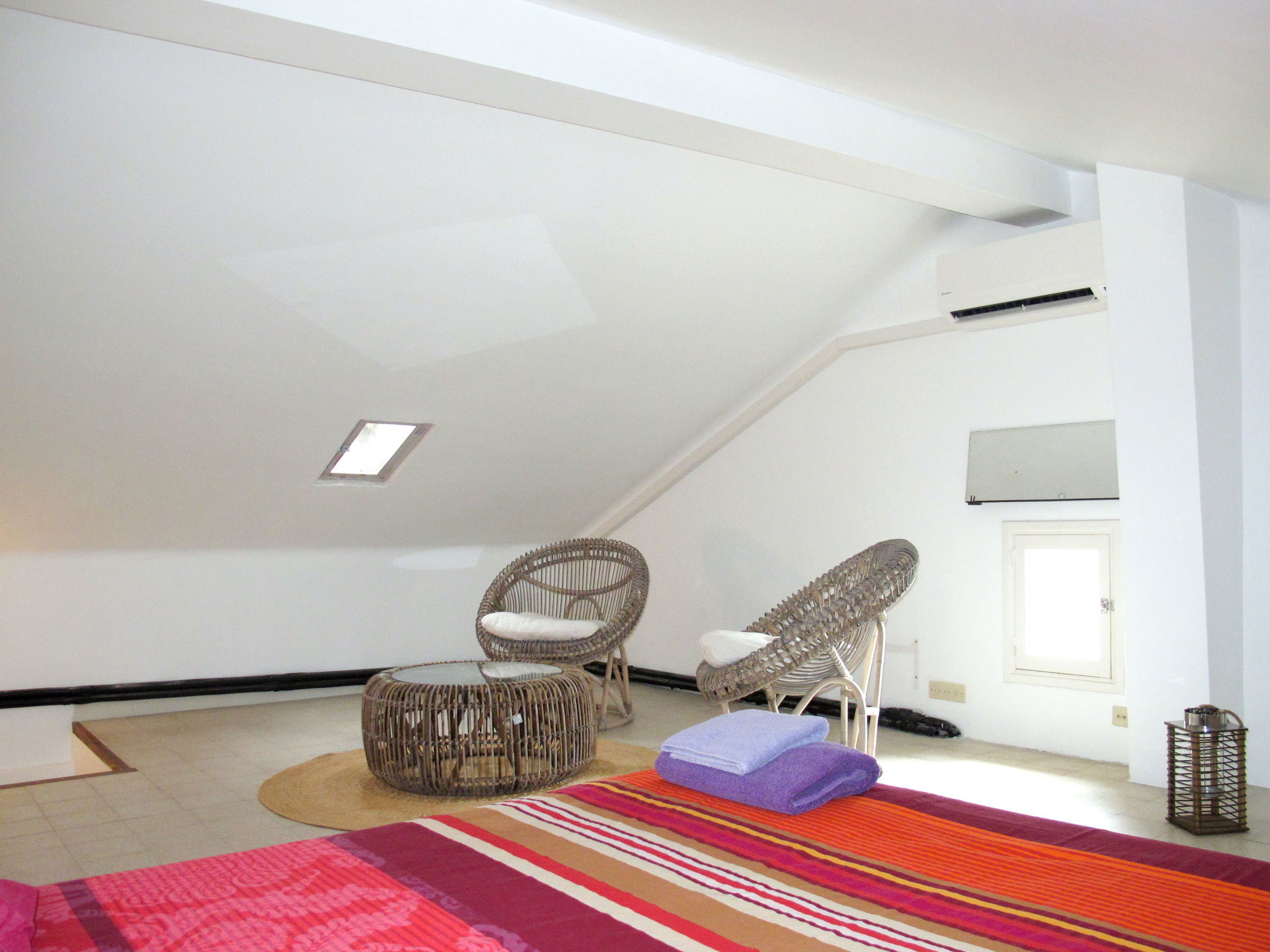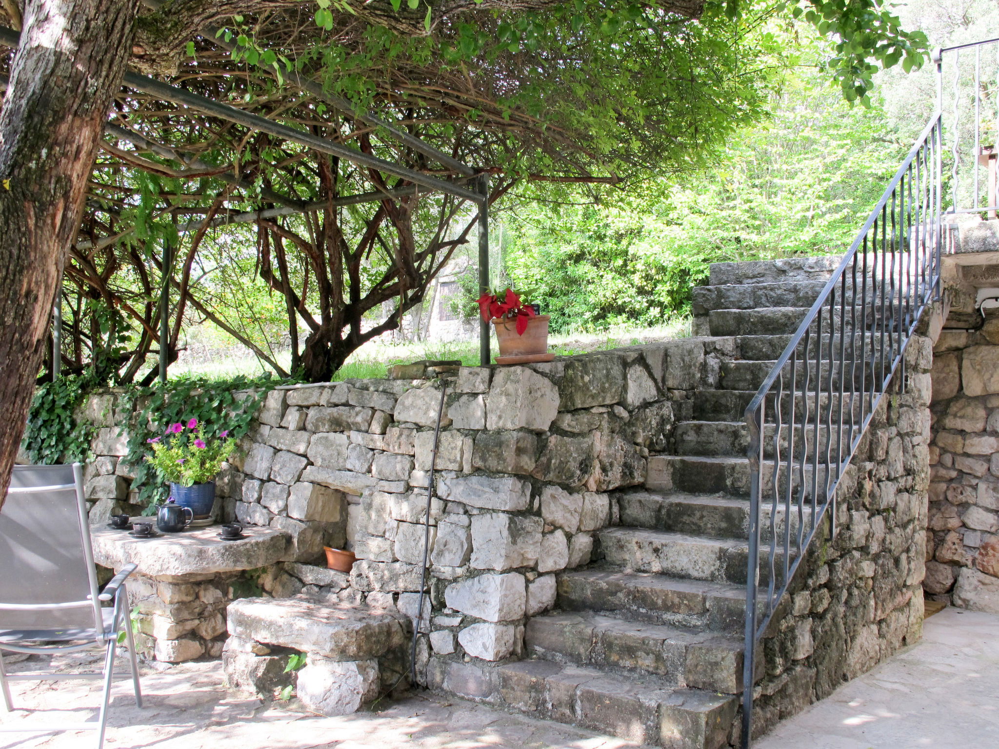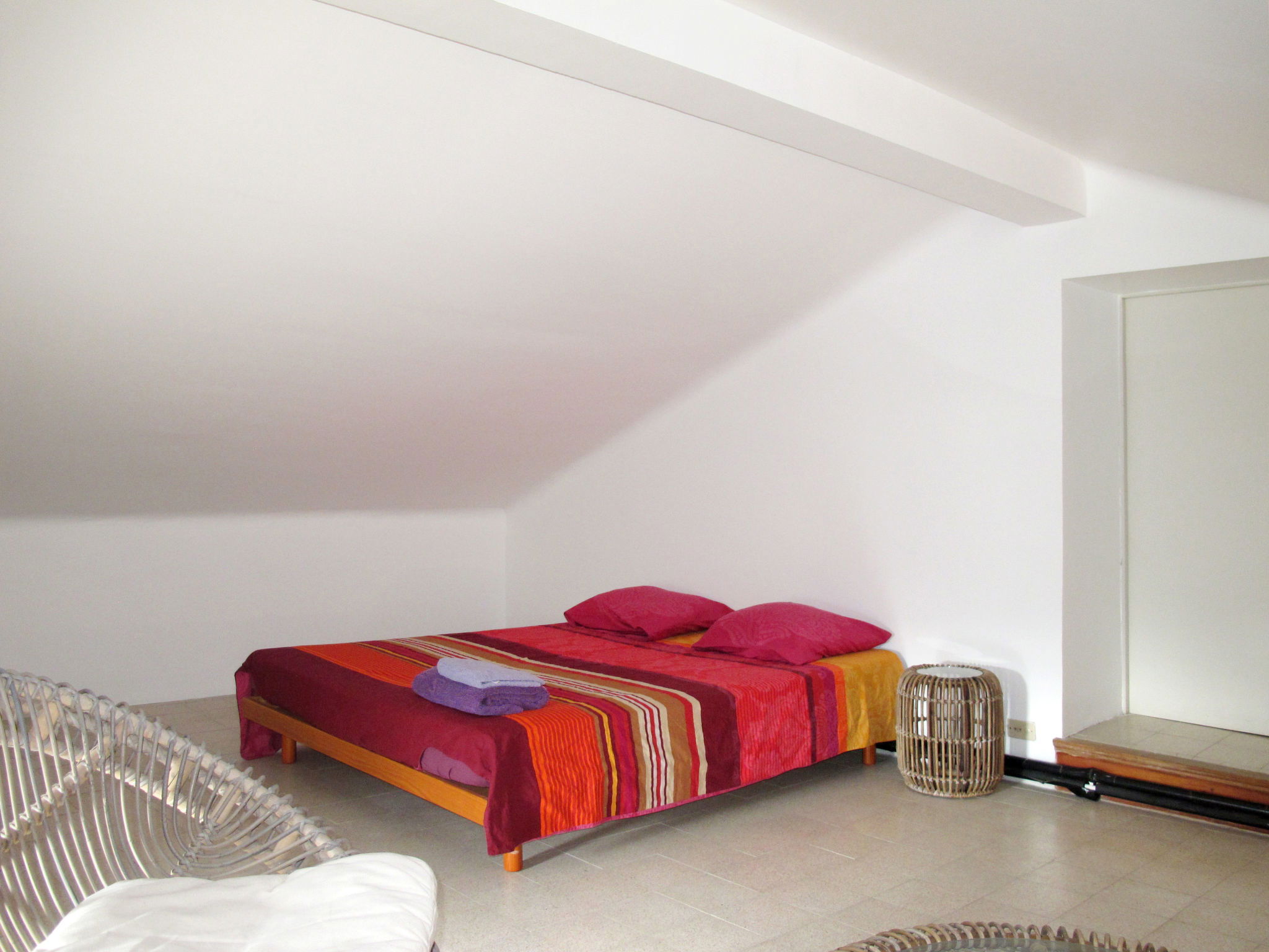 "Mas de l'Adrech", 6-room house 200 m2 on 3 levels. Rustic and tasteful furnishings: living room with satellite TV, hi-fi system, electric heating and air conditioning. Exit to the veranda. Living room with veranda, panoramic window. Exit to the garden. Dining room with dining table, electric heating, wood-burning stove and air conditioning. Exit to the garden. Kitchen (oven, dishwasher, 5 gas rings, toaster, kettle, microwave, freezer, electric coffee machine) with small dining table. Exit to the garden. Shower, sep. WC. Upper floor: 2 rooms, each room with 1 bed. 1 room with 1 french bed. Bathroom, sep. WC. Top floor: (steep stair), 1 room with sloping ceilings, without wardrobe with 1 french bed (160 cm), air conditioning. Terrace, porch. Terrace furniture, electric barbecue, deck chairs (4), box-room. View of the garden. Facilities: washing machine, iron, mosquito net. Internet (WiFi, free). Please note: maximum 1 pet/ dog allowed. Smoke alarm.