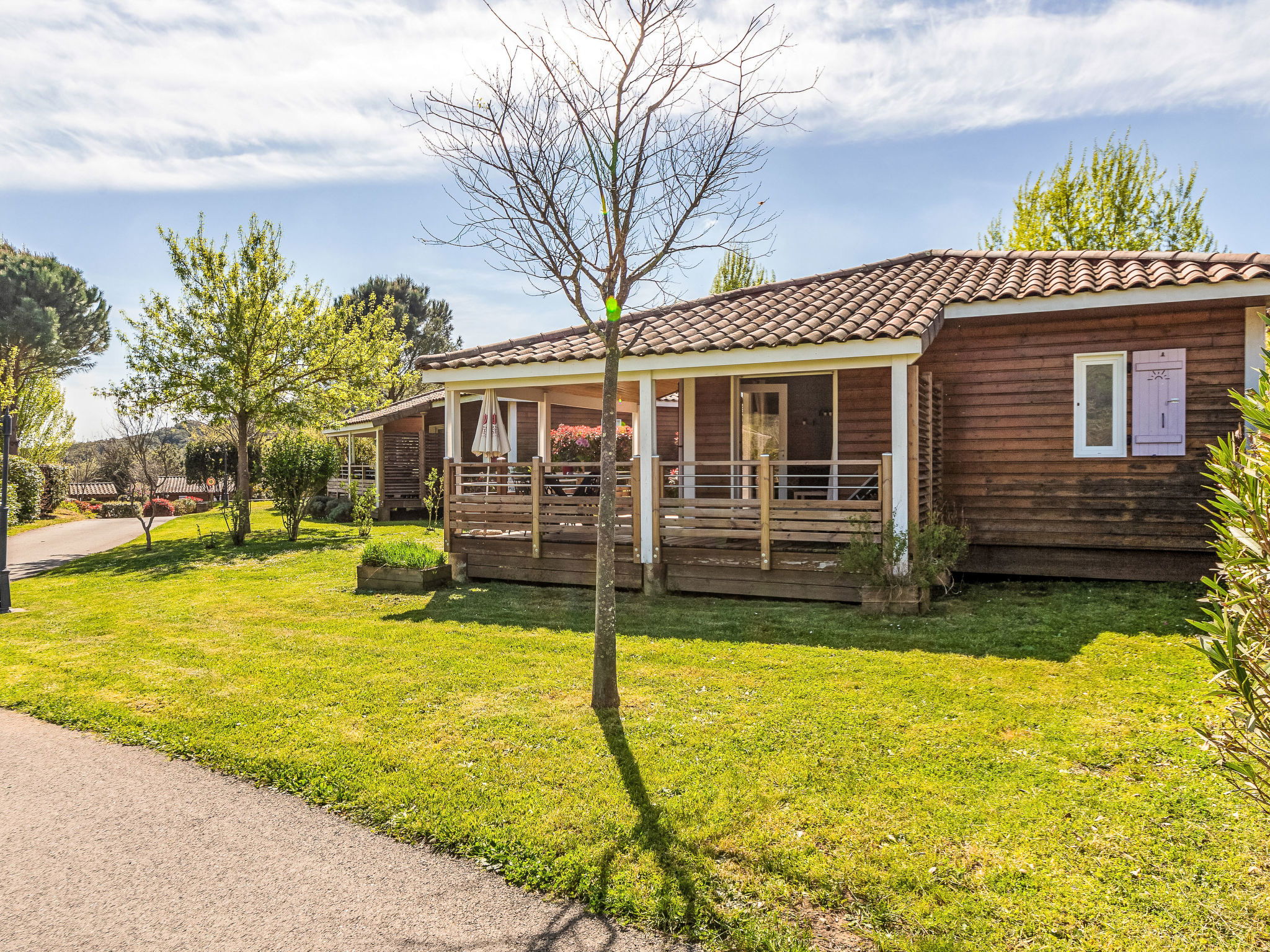 "Domaine de Sévenier Micocoulier", 3-room chalet 42 m2. Bright, wooden furniture furnishings: living/dining room with dining table. Exit to the terrace. 1 room with 1 french bed (160 cm, length 200 cm). 1 room with 1 x 2 bunk beds (90 cm, length 190 cm), 1 pull-out bed (2 pers. 2 x 90 cm, length 190 cm). Kitchenette (dishwasher, 3 gas rings, toaster, kettle, microwave, freezer, electric coffee machine, Capsules for coffee machine (Nespresso) extra). Shower, sep. WC. Air-conditioning, forced-air heating. Parquet floors. Terrace 20 m2, roofed, garden 200 m2. Terrace furniture. View of the garden and the forest. Facilities: children's high chair, baby cot, hair dryer. Internet (WiFi, free). Parking (1 car). Please note: non-smokers only. Maximum 2 pets/ dogs allowed. Smoke alarm.