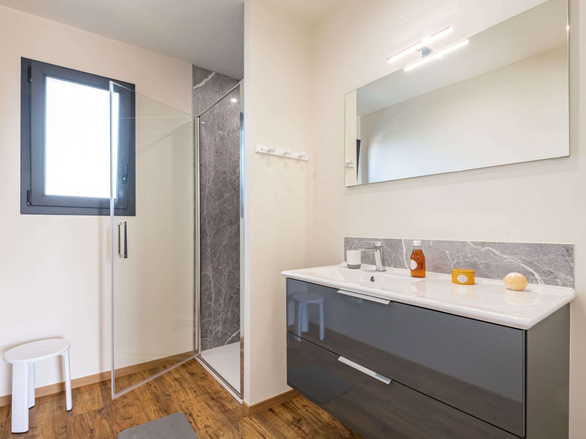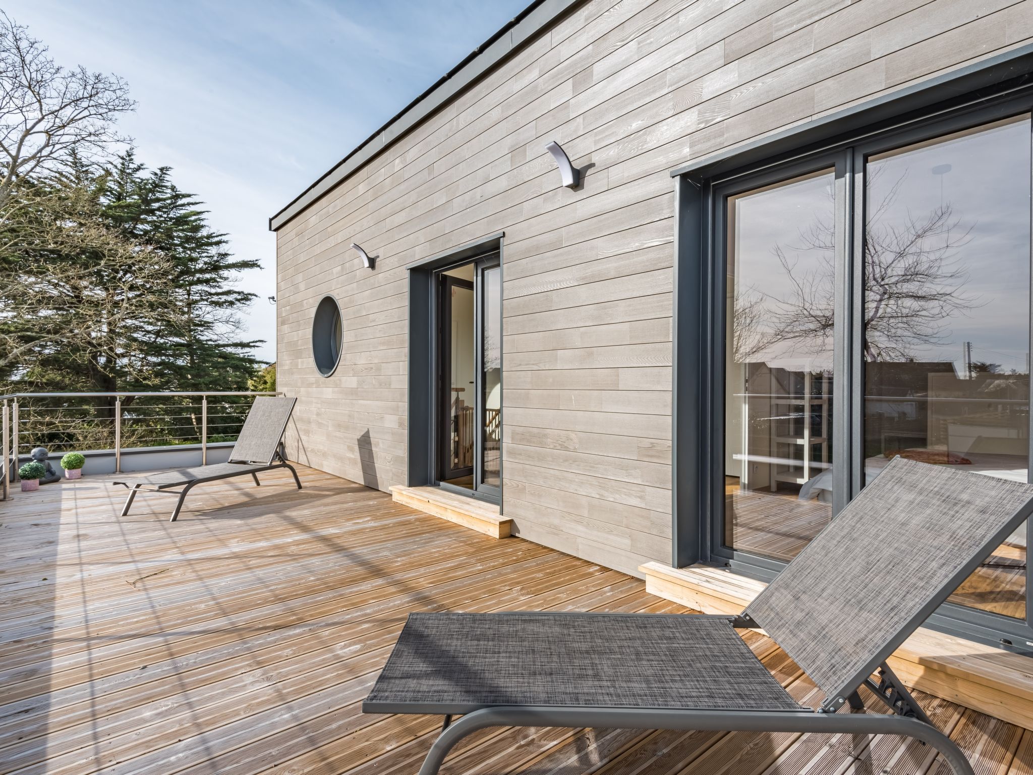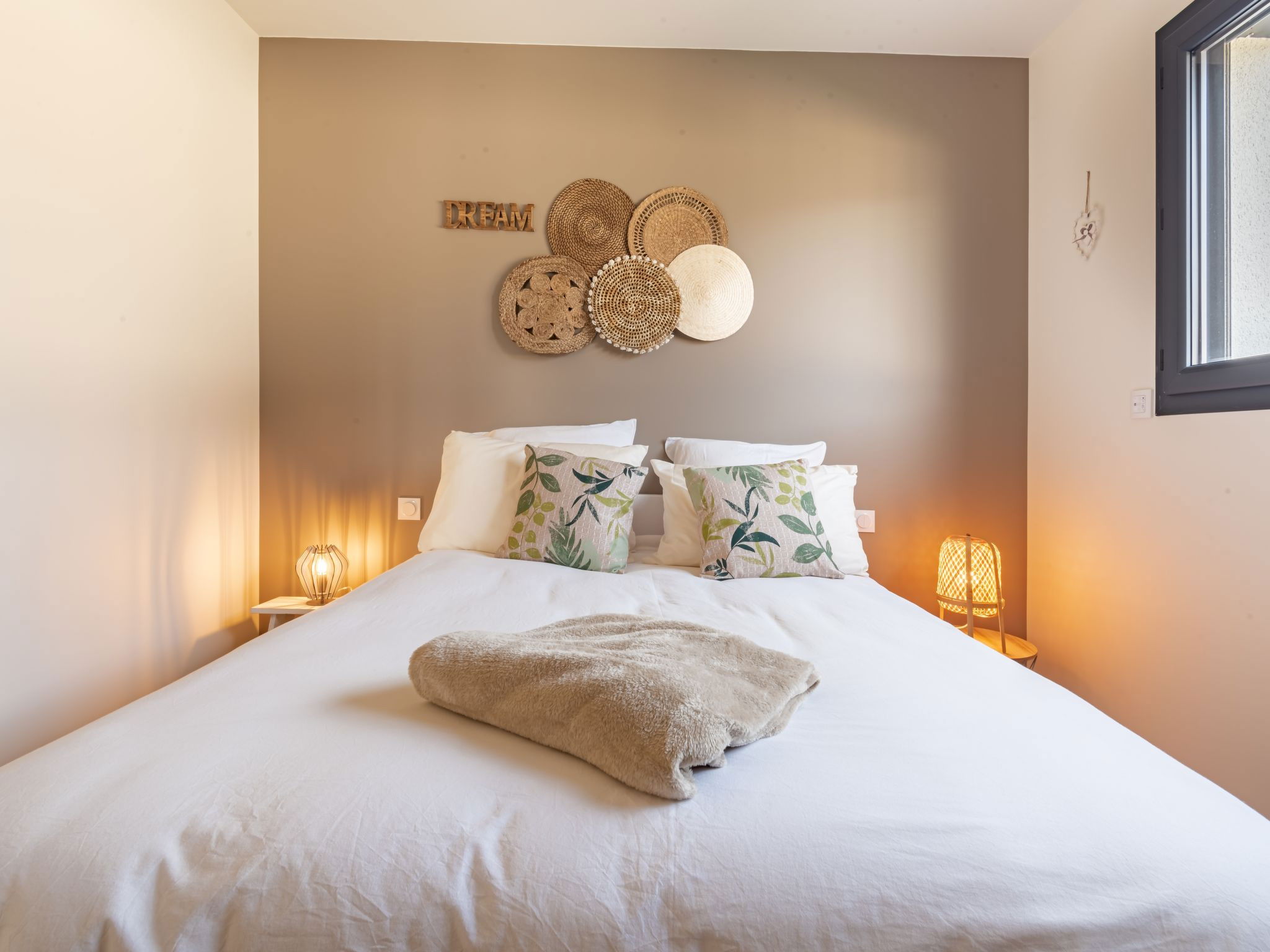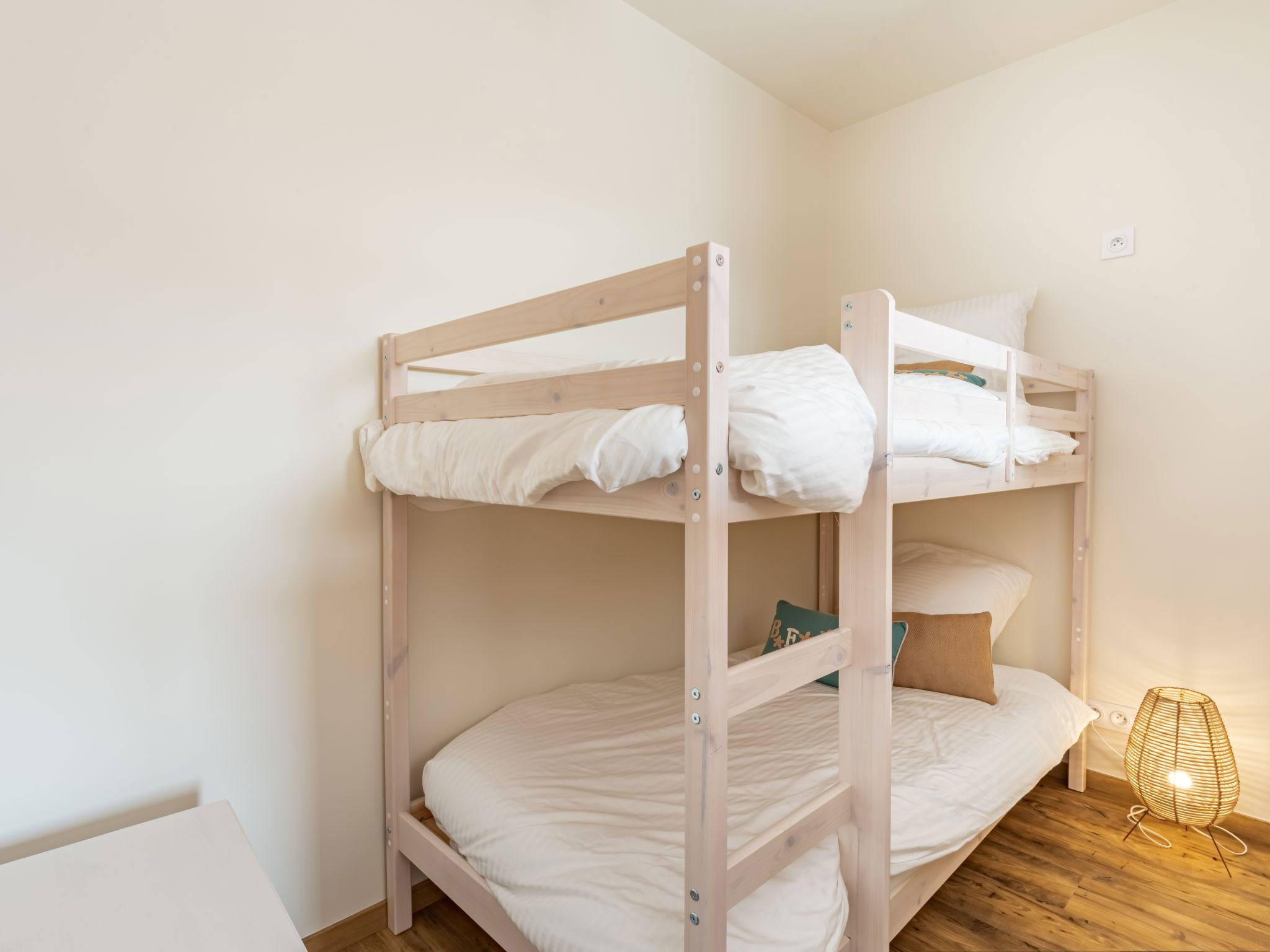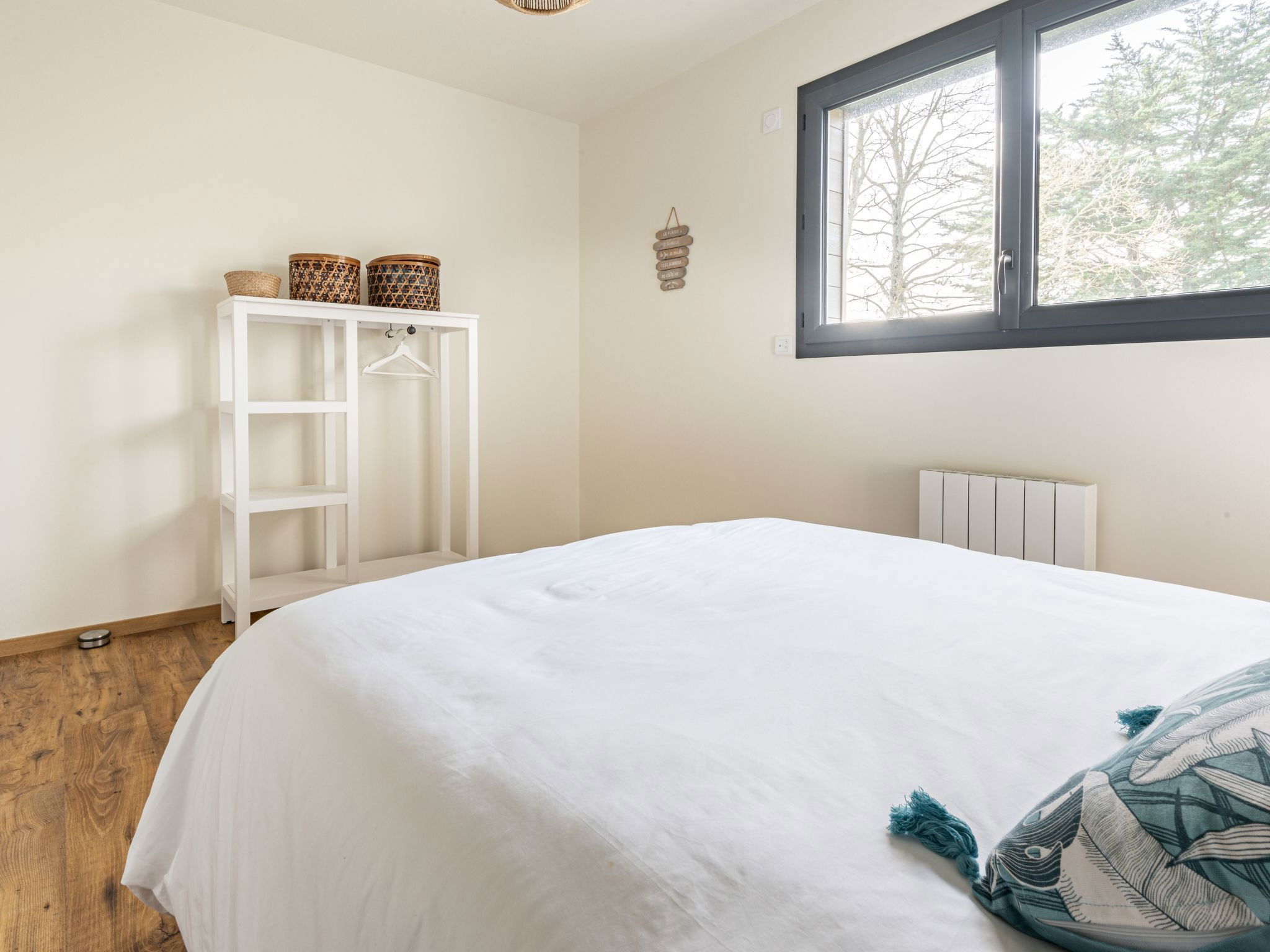 "Les Trembles", 4-room house 117 m2 on 2 levels. Spacious and bright, beautiful and modern furnishings: living/dining room with TV (flat screen), electric heating. Exit to the terrace. 1 room with 1 french bed (1 x 140 cm, length 190 cm), separate WC and shower. Open kitchen (oven, 4 induction hot plates, toaster, kettle, microwave, electric coffee machine). Upper floor: 1 room with 1 french bed (140 cm, length 190 cm). Exit to the terrace. 1 room with 1 x 2 bunk beds (90 cm, length 190 cm). Bathroom, sep. WC. Terrace 30 m2, terrace 24 m2. Terrace furniture, barbecue, deck chairs (6). Facilities: washing machine. Internet (WiFi). Please note: non-smokers only. Smoke alarm, fire extinguisher.
