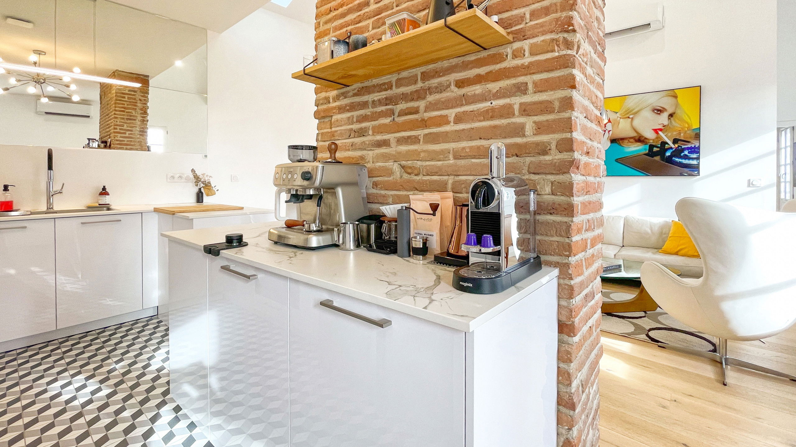 The open plan kitchen, electric, is equipped with refrigerator, microwave, oven, freezer, dishwasher, dishes/cutlery, kitchen utensils, coffee machine, toaster and kettle.