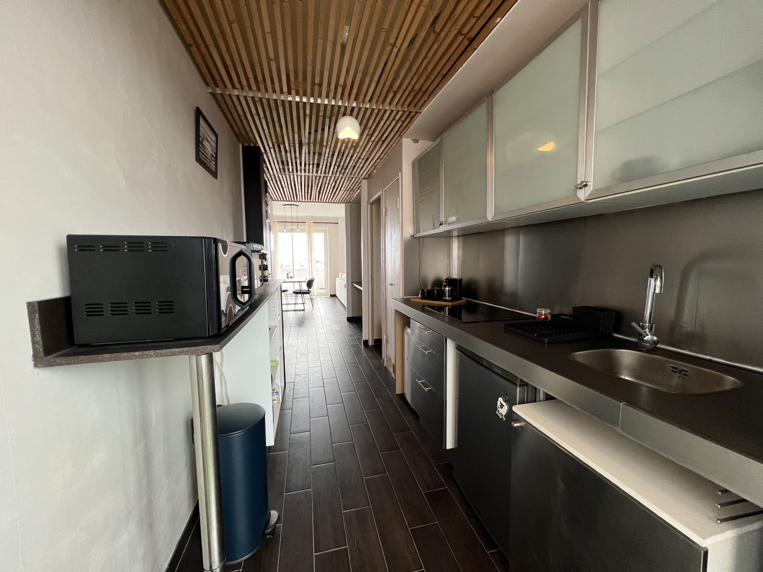 The open plan kitchen, electric, is equipped with refrigerator, microwave, dishes/cutlery, kitchen utensils, coffee machine, toaster and kettle.
