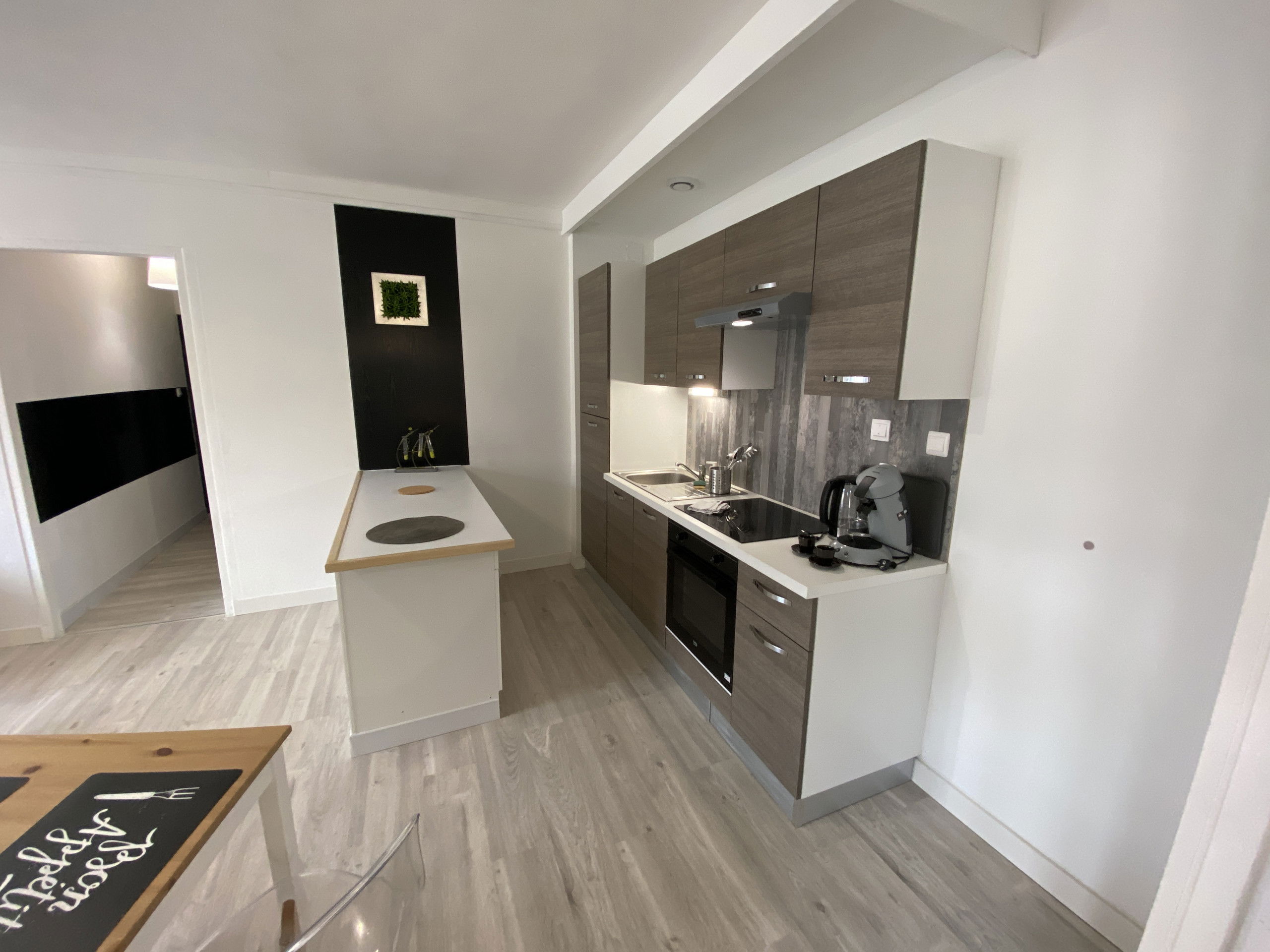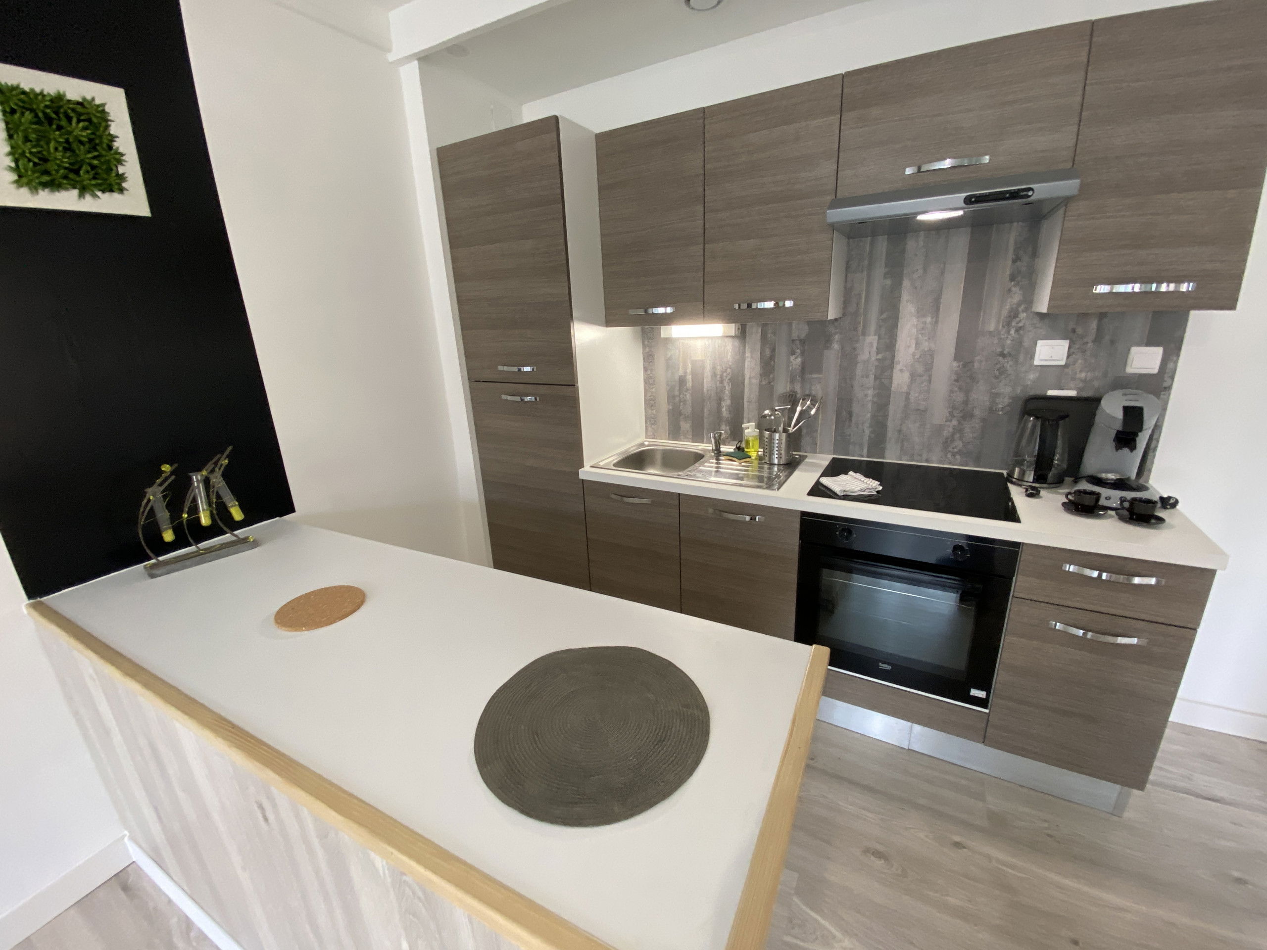 The open plan kitchen, electric, is equipped with refrigerator, microwave, oven, dishes/cutlery, kitchen utensils, coffee machine and kettle.