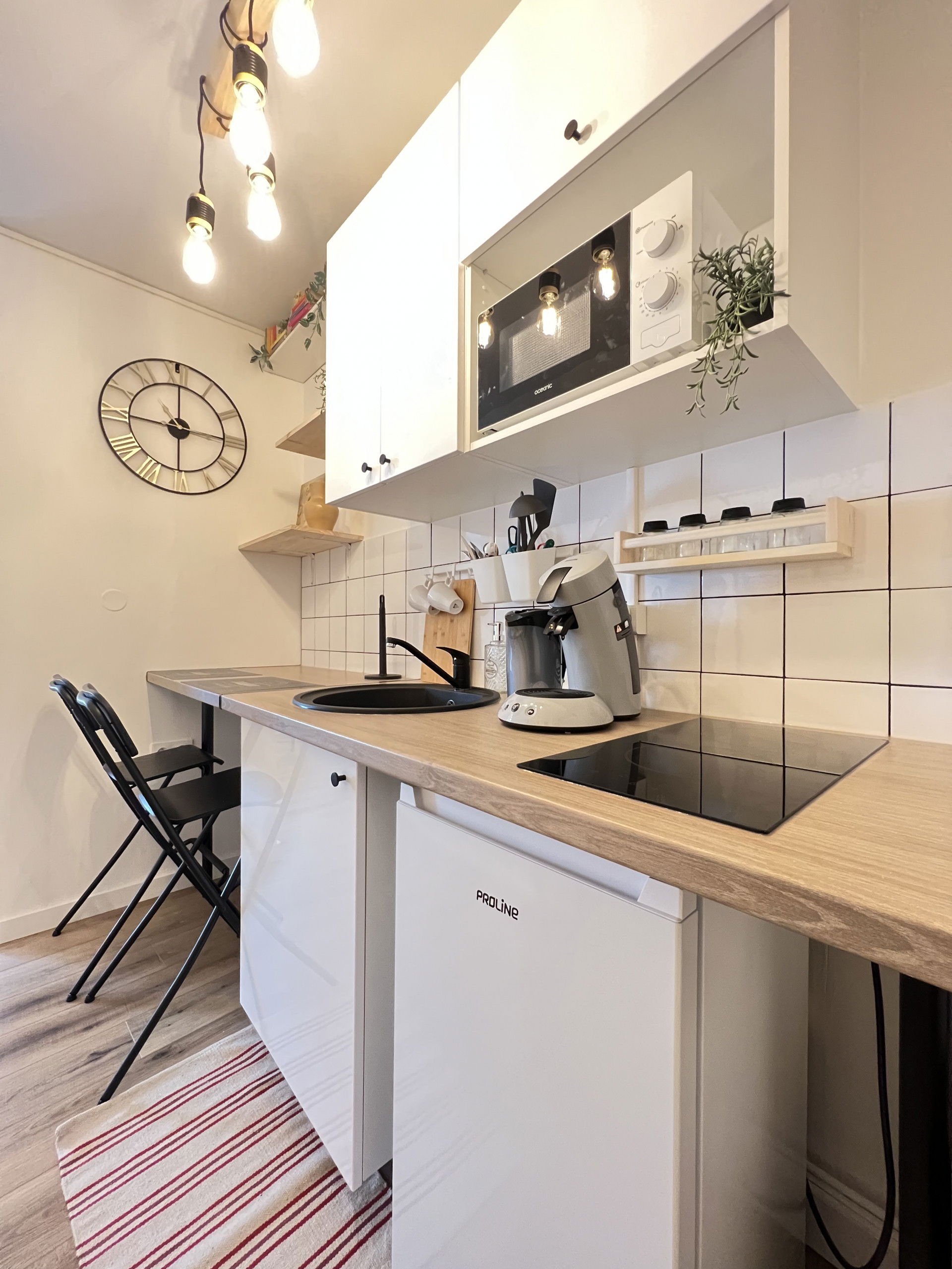 The open plan kitchen, of induction, is equipped with refrigerator, microwave, dishes/cutlery, kitchen utensils, coffee machine, toaster and kettle.