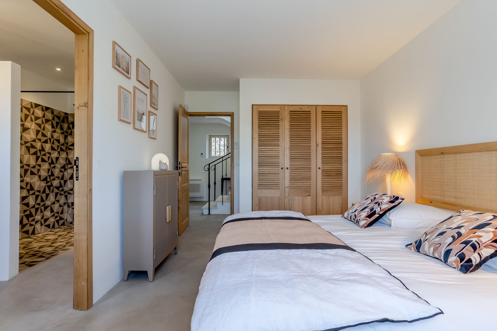 - Bedroom 3 en suite with air-conditioning: double bed 160x200cm, closet. Shower room, 1 washbasin, toilet. Access to the
